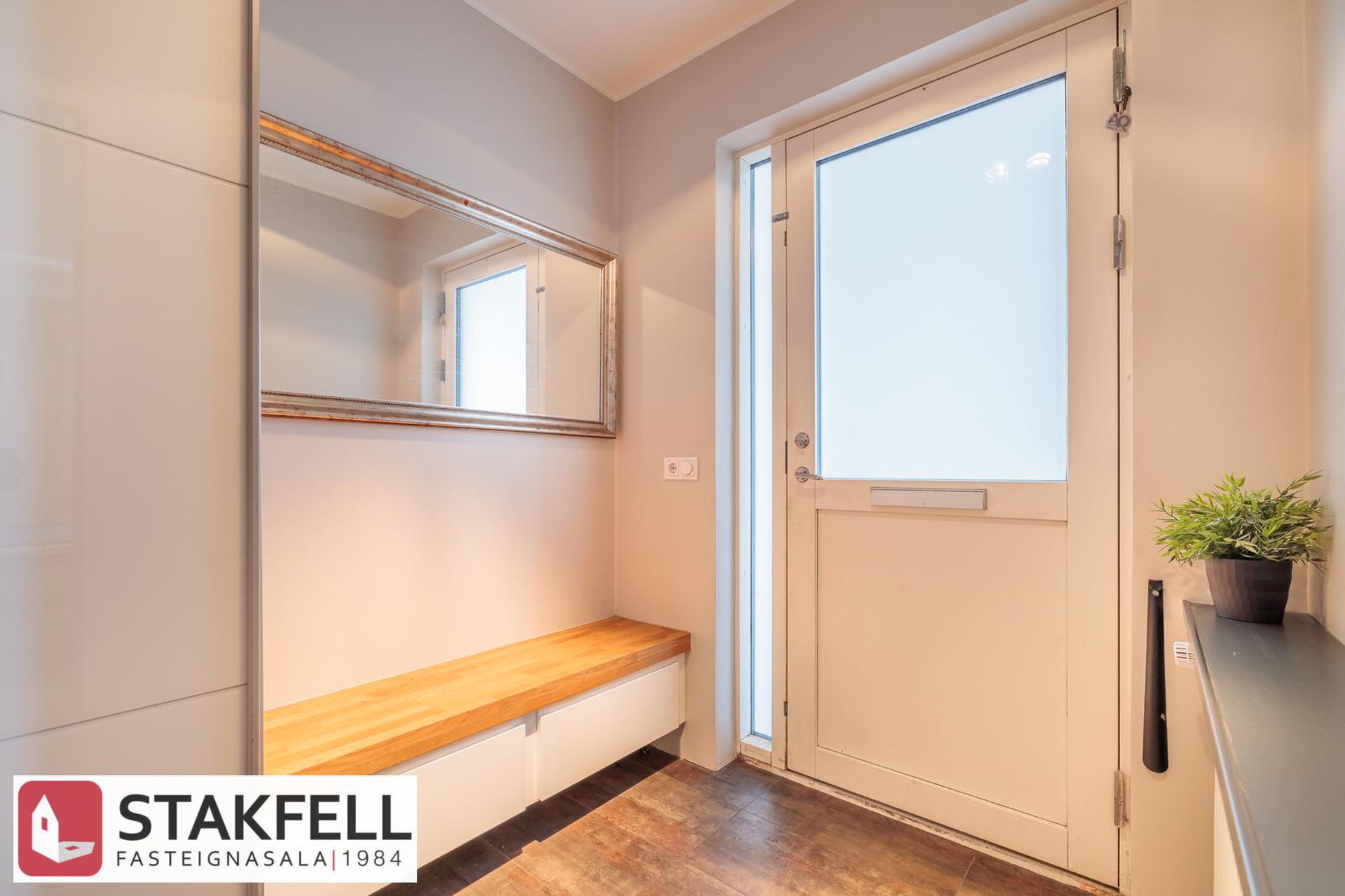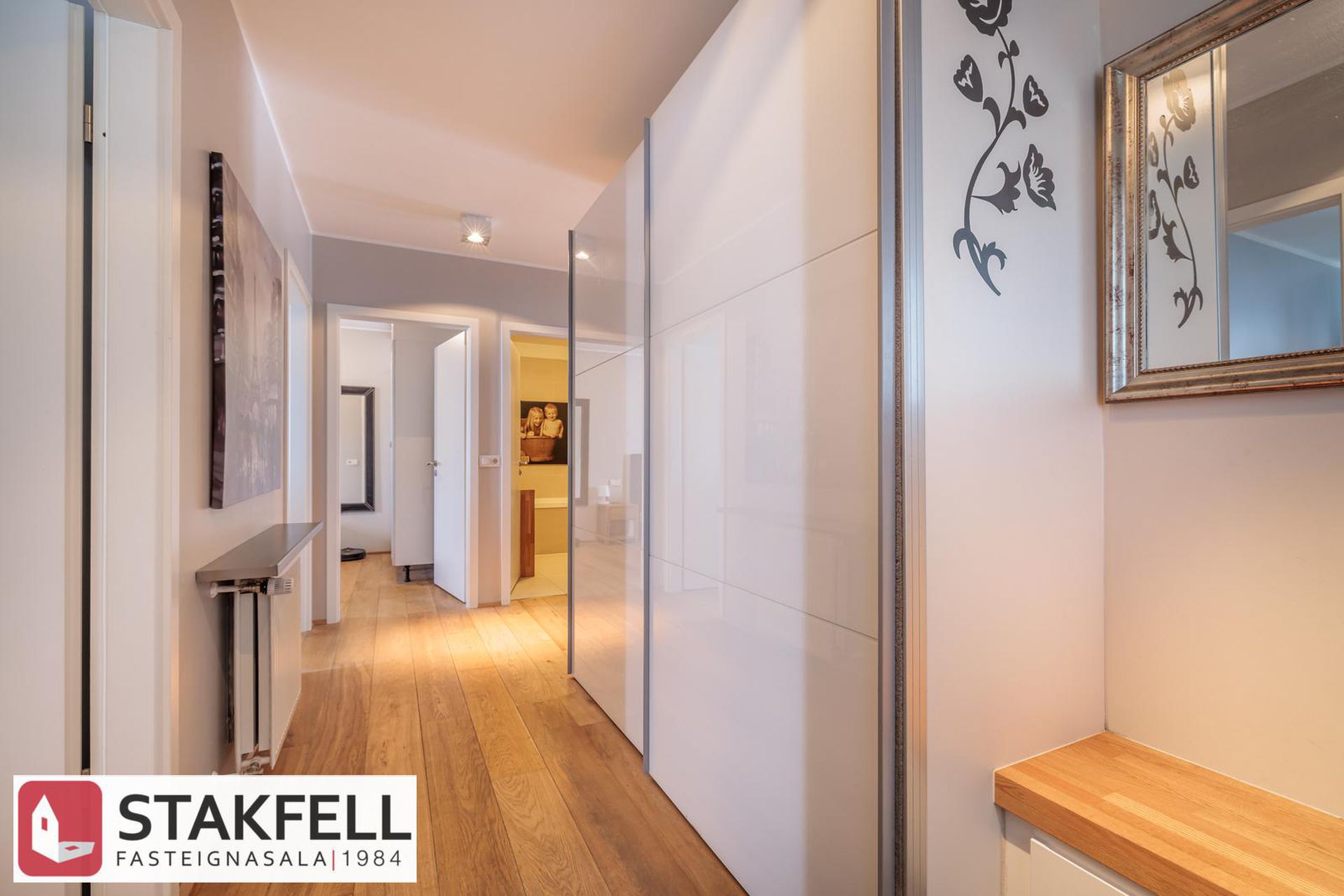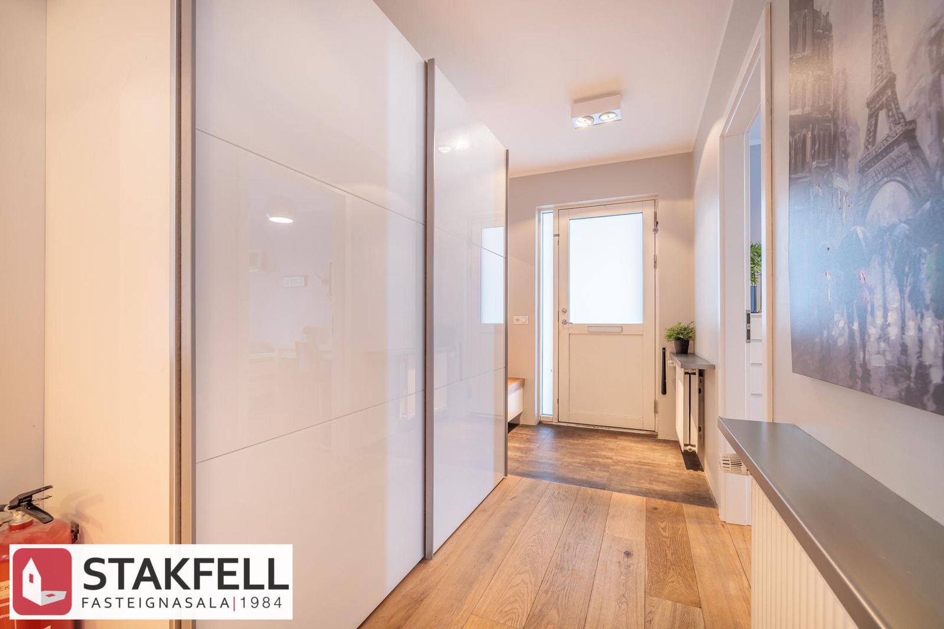 forstofu með góðum fataskáp. Frá forstofu tekur við gangur.