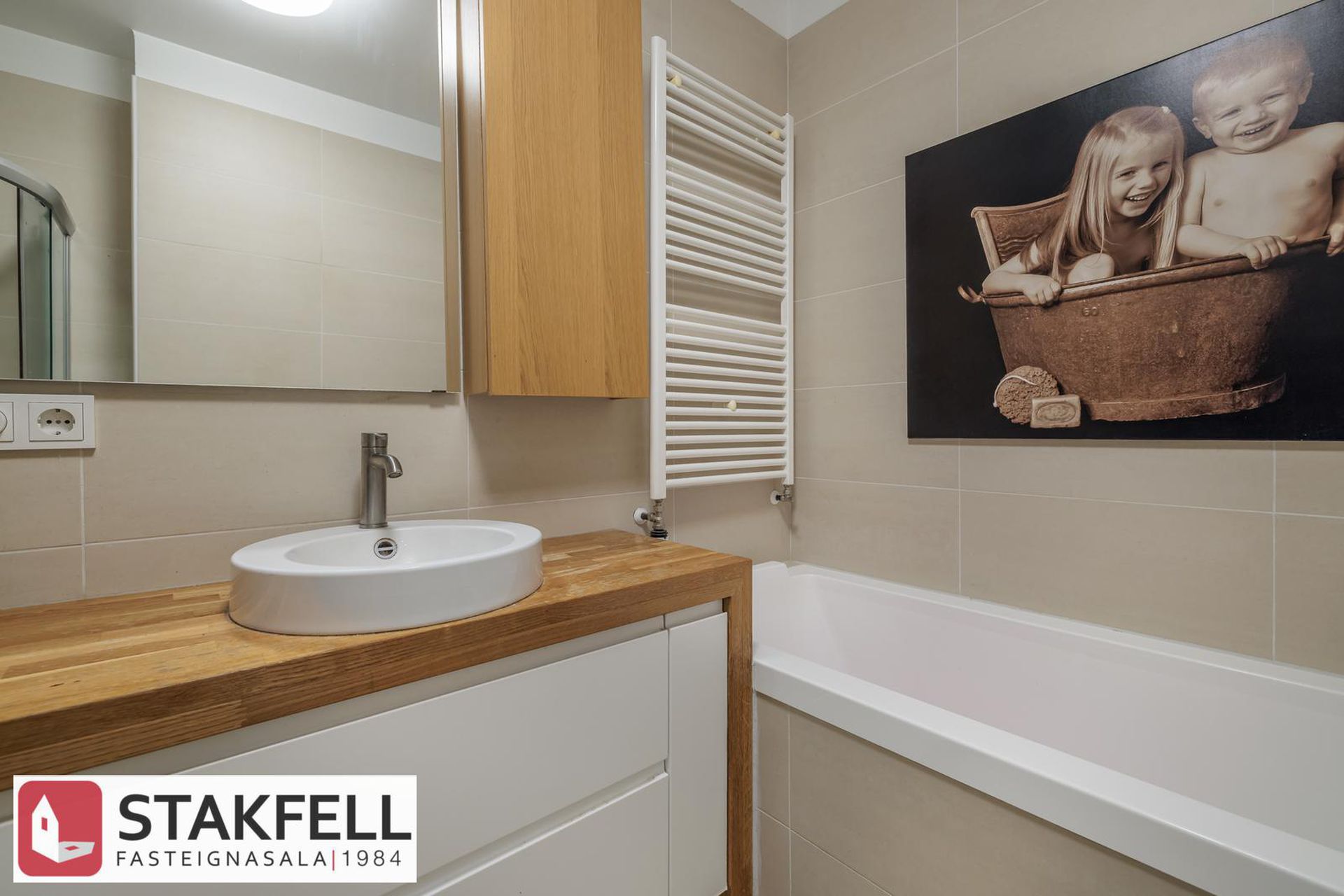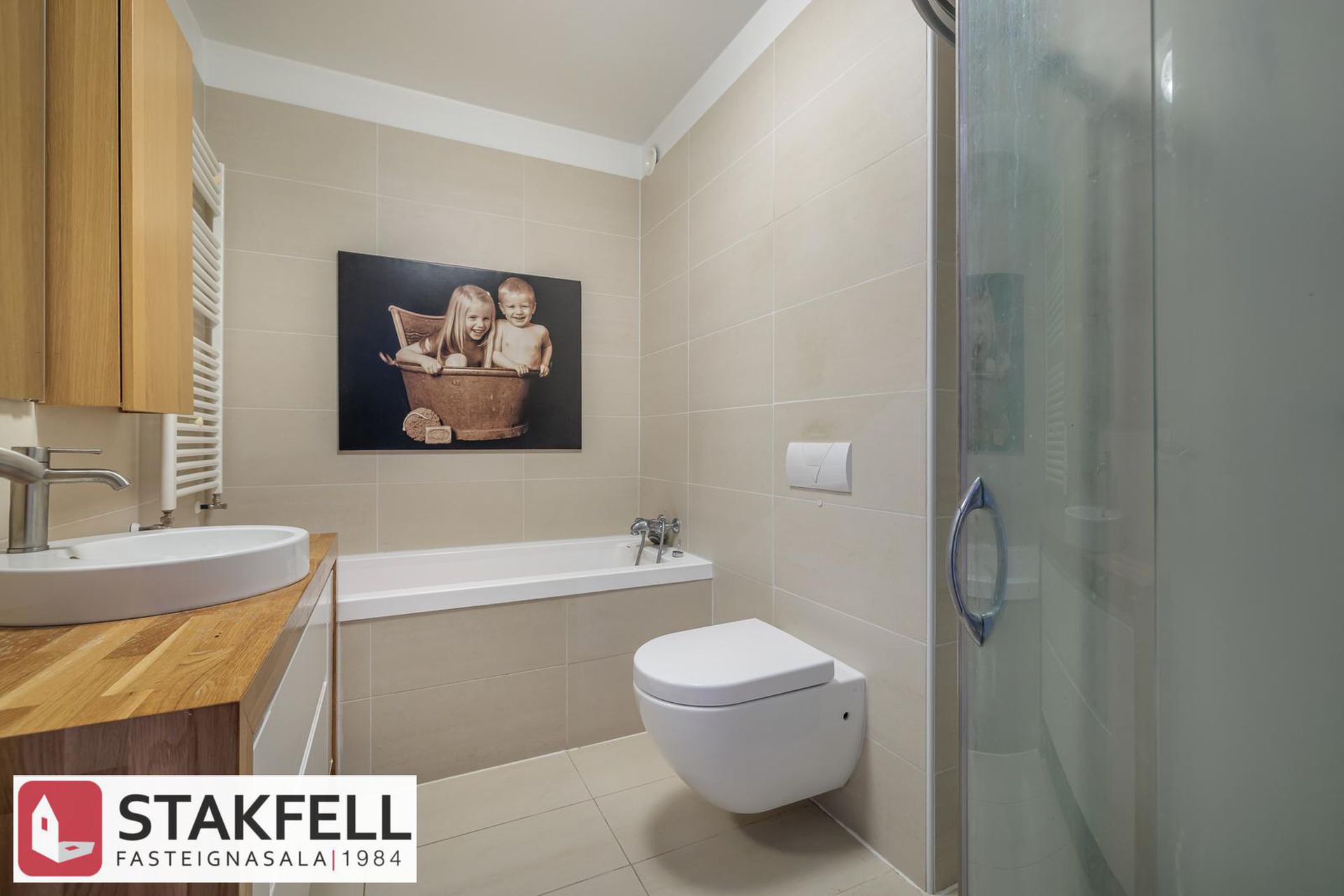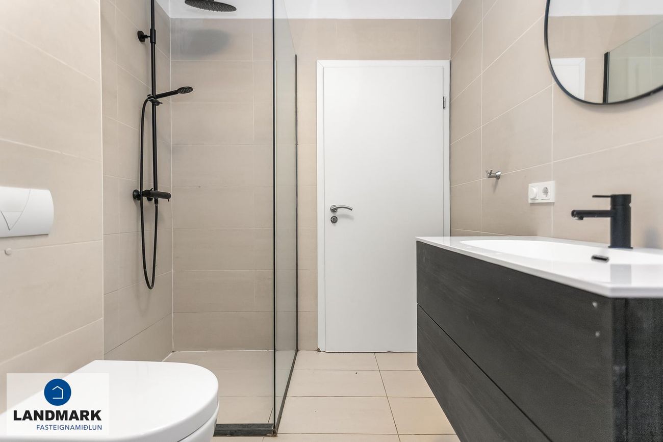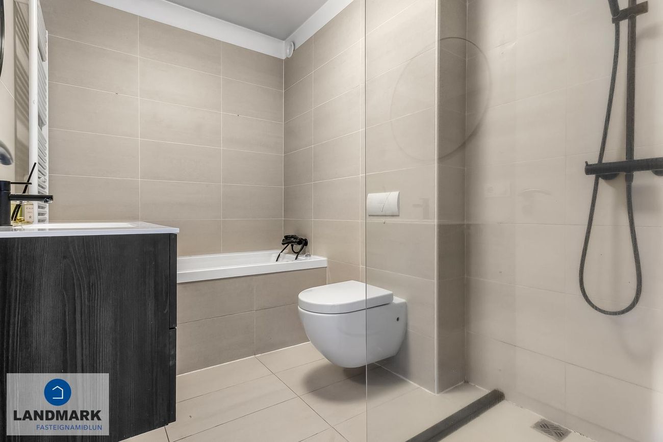 Baðherbergi er flísalagt í hólf gólf, góð innrétting, sér sturta og baðkar, handklæðaofn, gólfhiti á baðherbergi. Af gangi er komið inn í