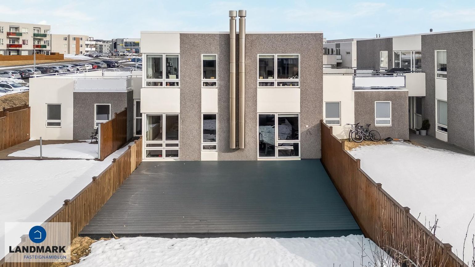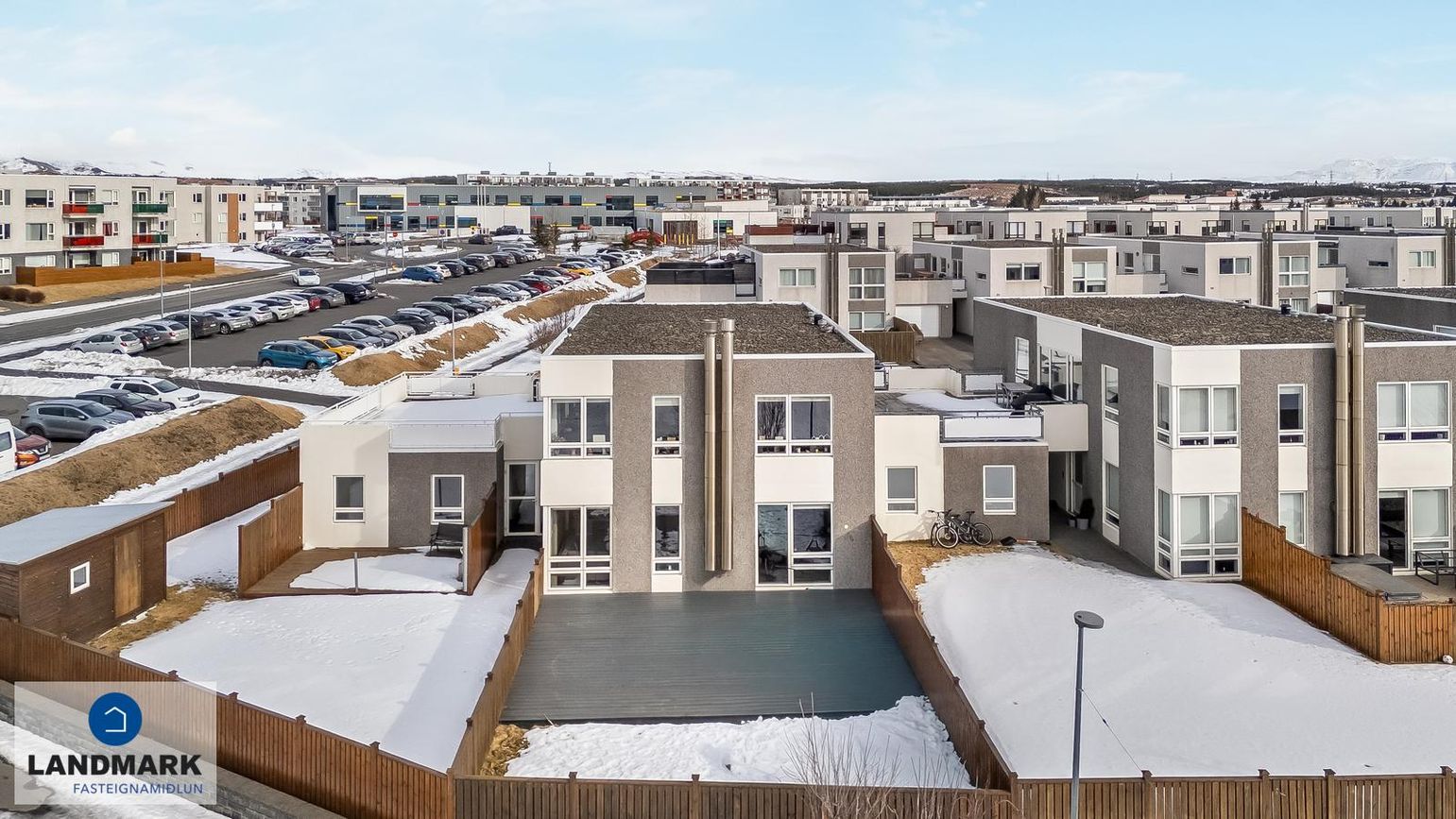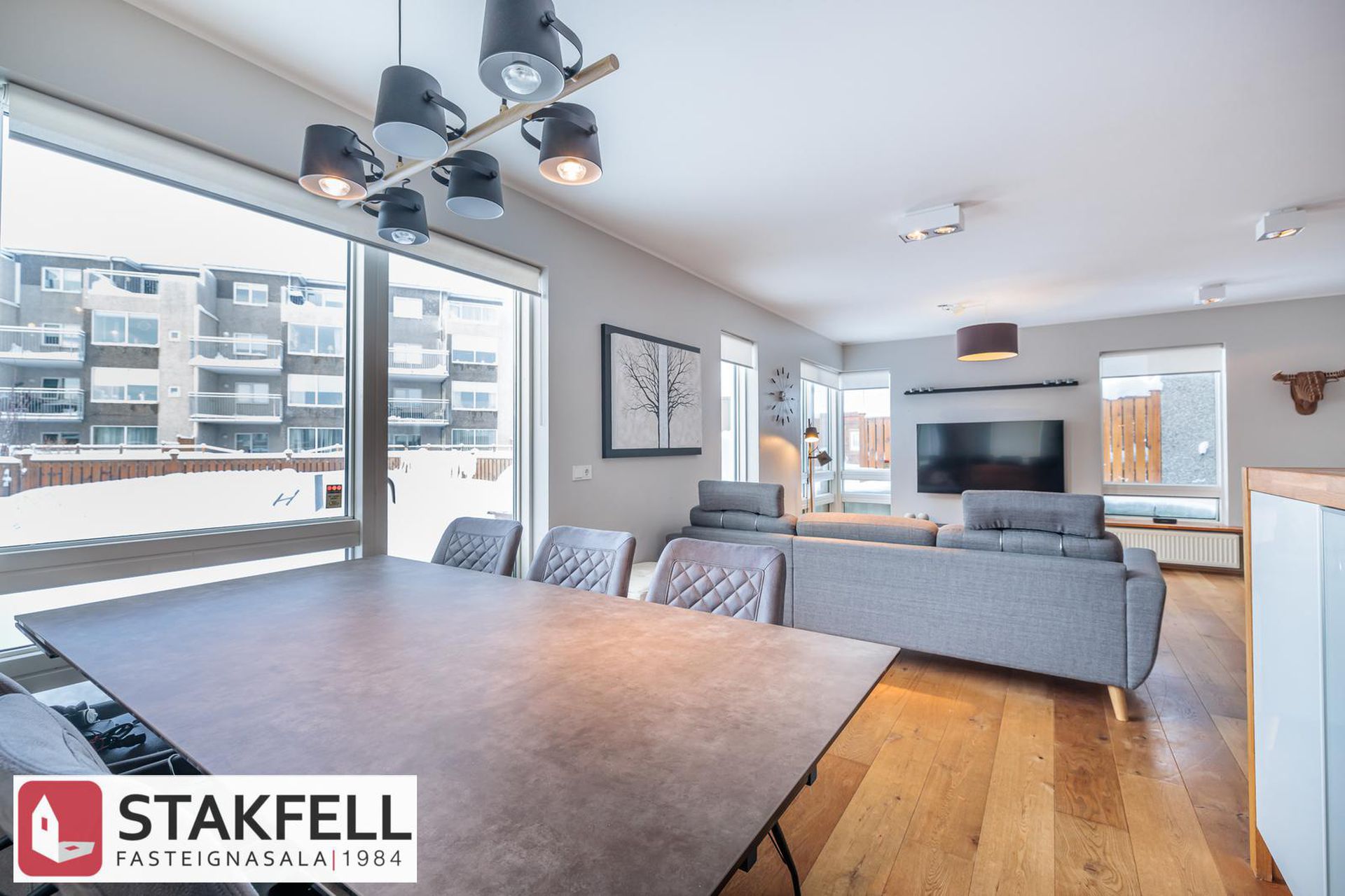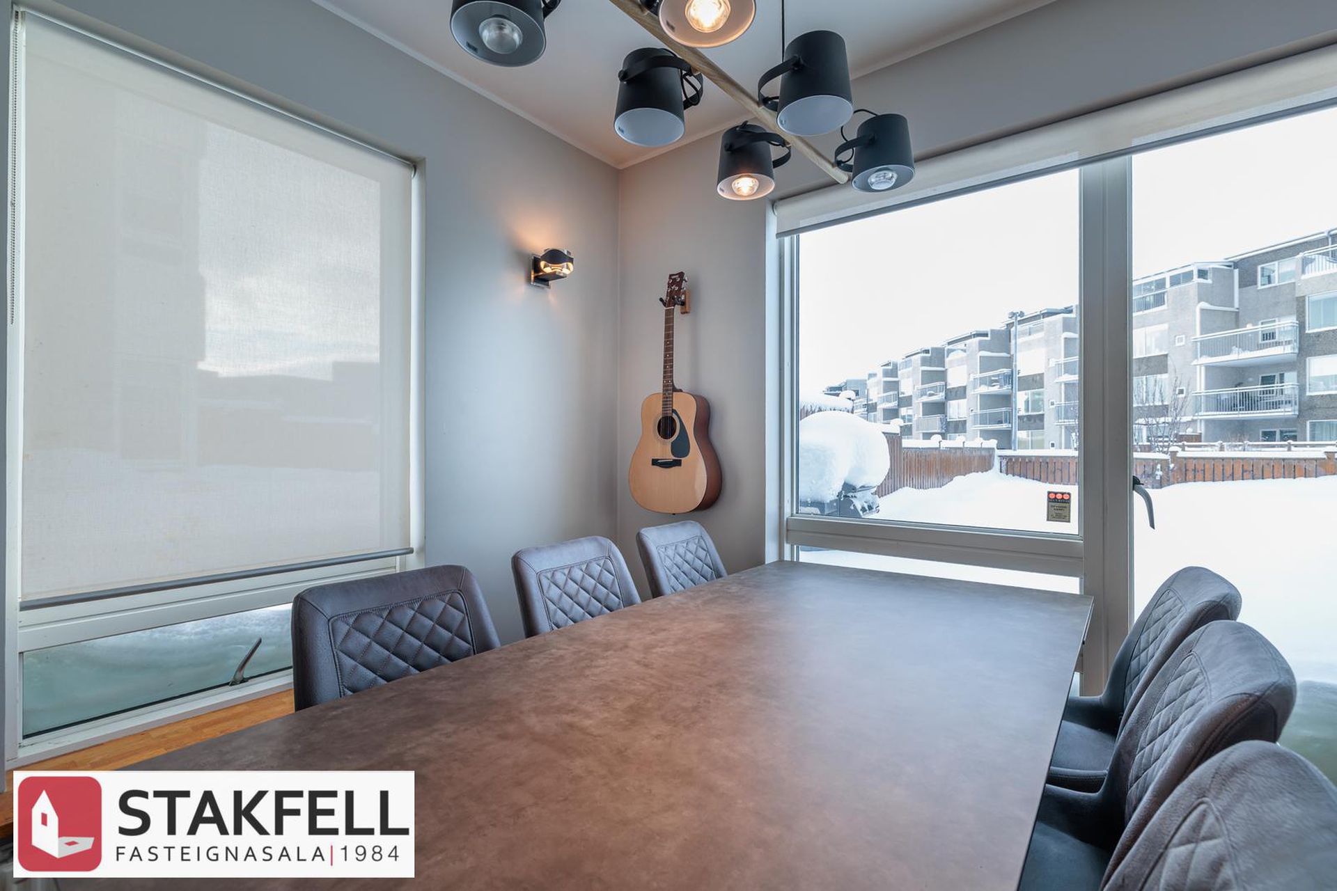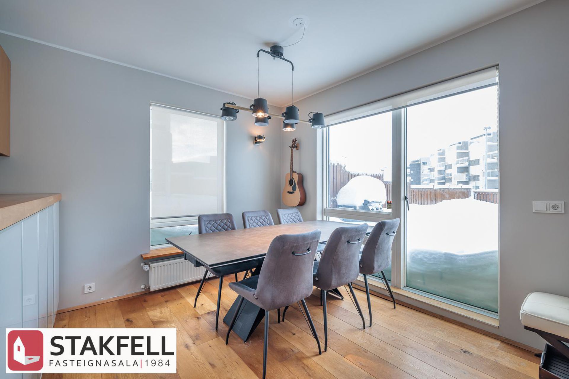 borðstofan eru með gólfsíðum gluggum til þriggja átta sem gefur mög góða birtu inn í rýmið. Úr stofu er gengið út á pall með skjólveggjum í suðvesturátt og afgirtan sér garð. Eigninni fylgir einnig sér geymsla við enda bílskúrs efri hæðar.
