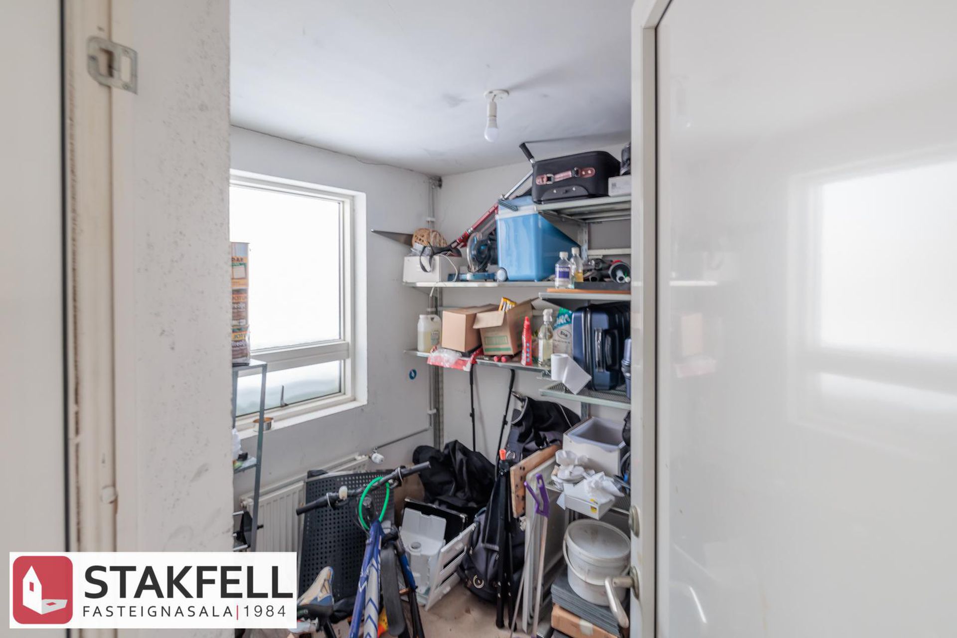 Geymsla innan íbúðar með hillum. Flísalagt