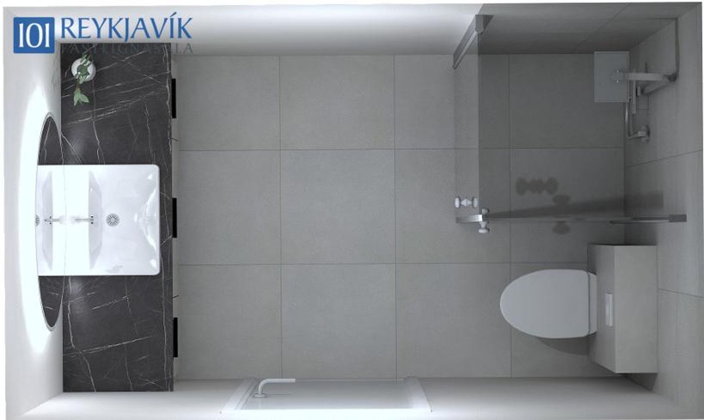 Baðherbergi, flísar á veggjum og gólfi, val um sturtu eða bað.