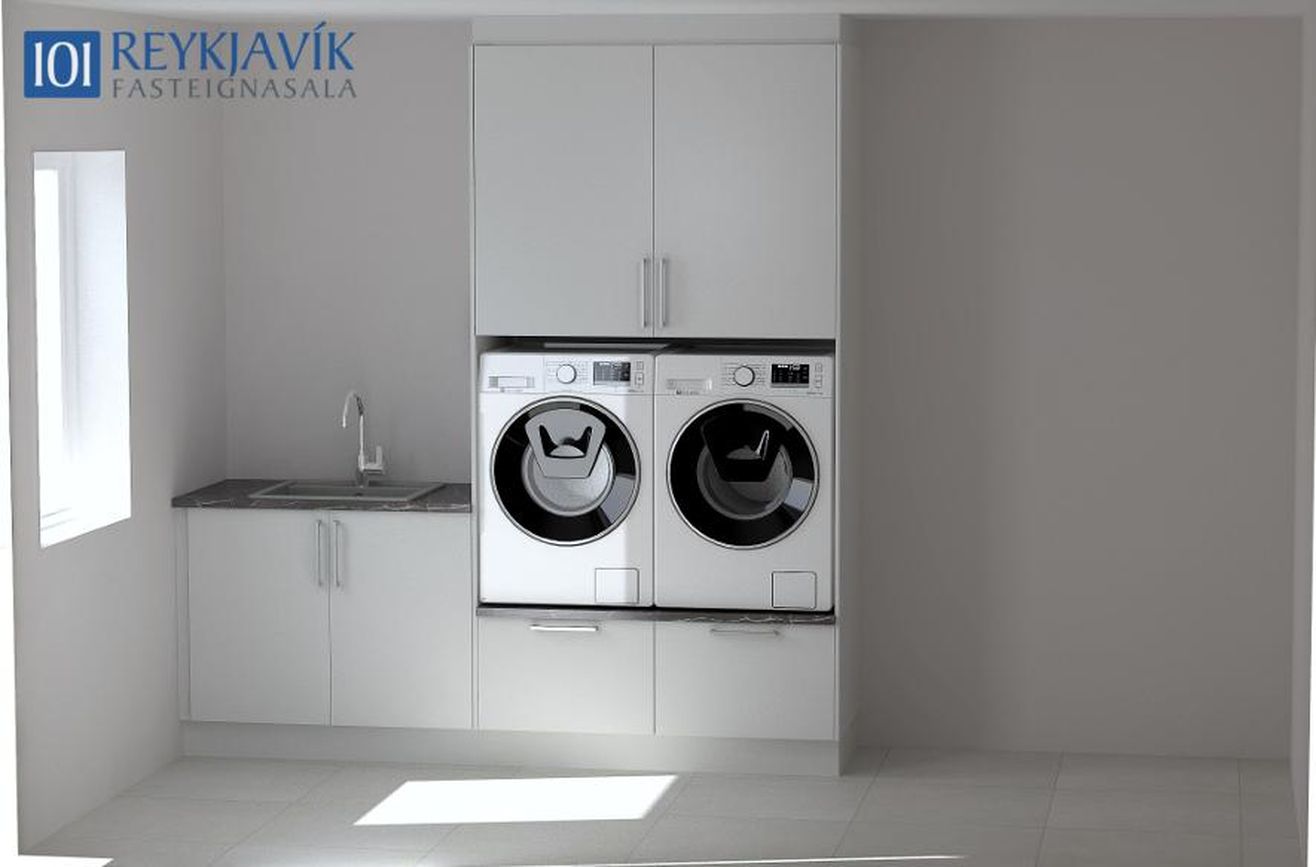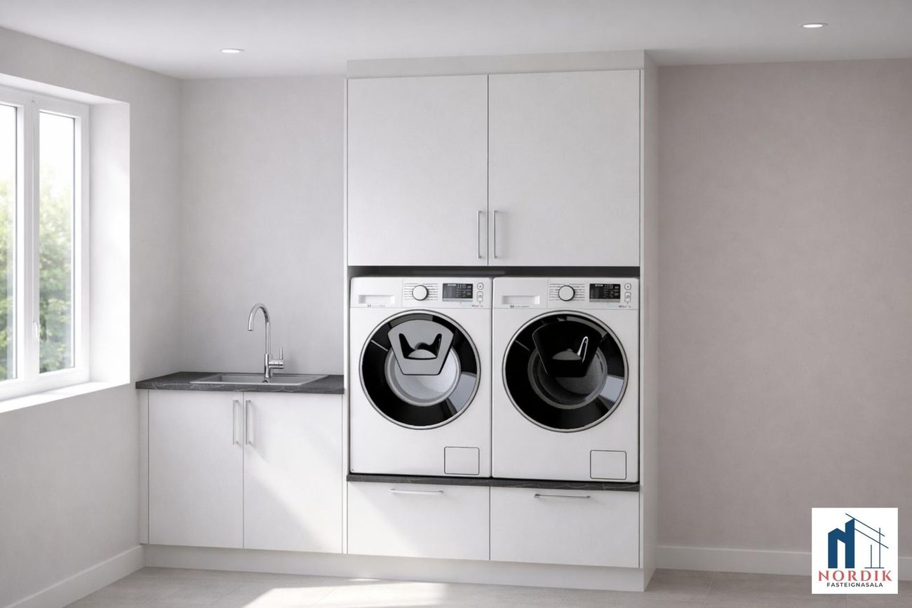 Þvottahús er flísalagt, innrétting þar sem þvottavél og þurrkara er lyft upp í þægilega vinnuhæð.