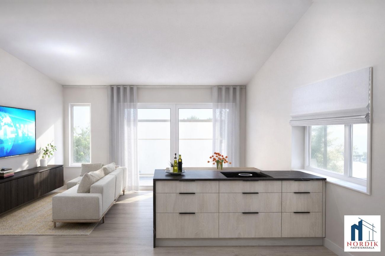 Eldhús og stofa, í einu alrými, aðskilin með eldhúseyju. Parket á gólfi. Val um hvort loft séu niðurtekin að hluta. Stórir gluggar. Gengið úr rýminu út á sólpall, tengi fyrir heitan pott.