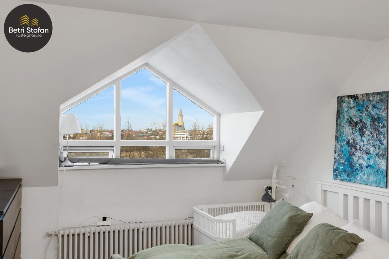 Hjónaherbergi: Rúmgott, fallegur kvistur, hvítur fataskápur, parket. Herbergi 2: Rúmgott, fallegur kvistur, innbyggður fataskápur, parket. Herbergi 3: Rúmgott, parket, hvítur fataskápur (var áður eldhús).