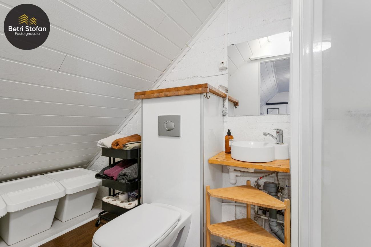 Hol: Parketlagt, innbyggður fataskápur, tenging við öll herbergi. Ris: Innréttuð stúdíóíbúð með baðherbergi (sturta) og eldhúskrók, parketlögð.