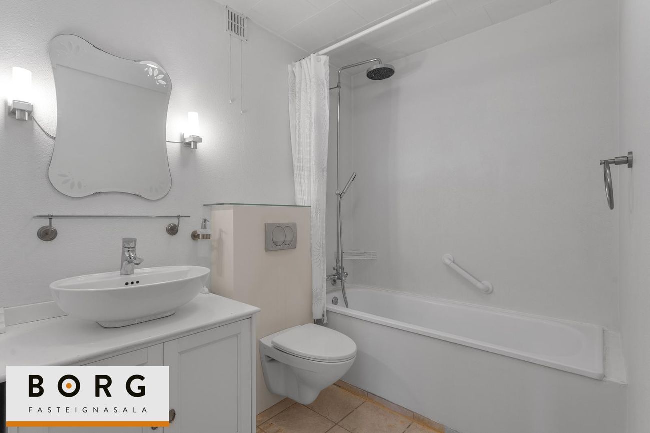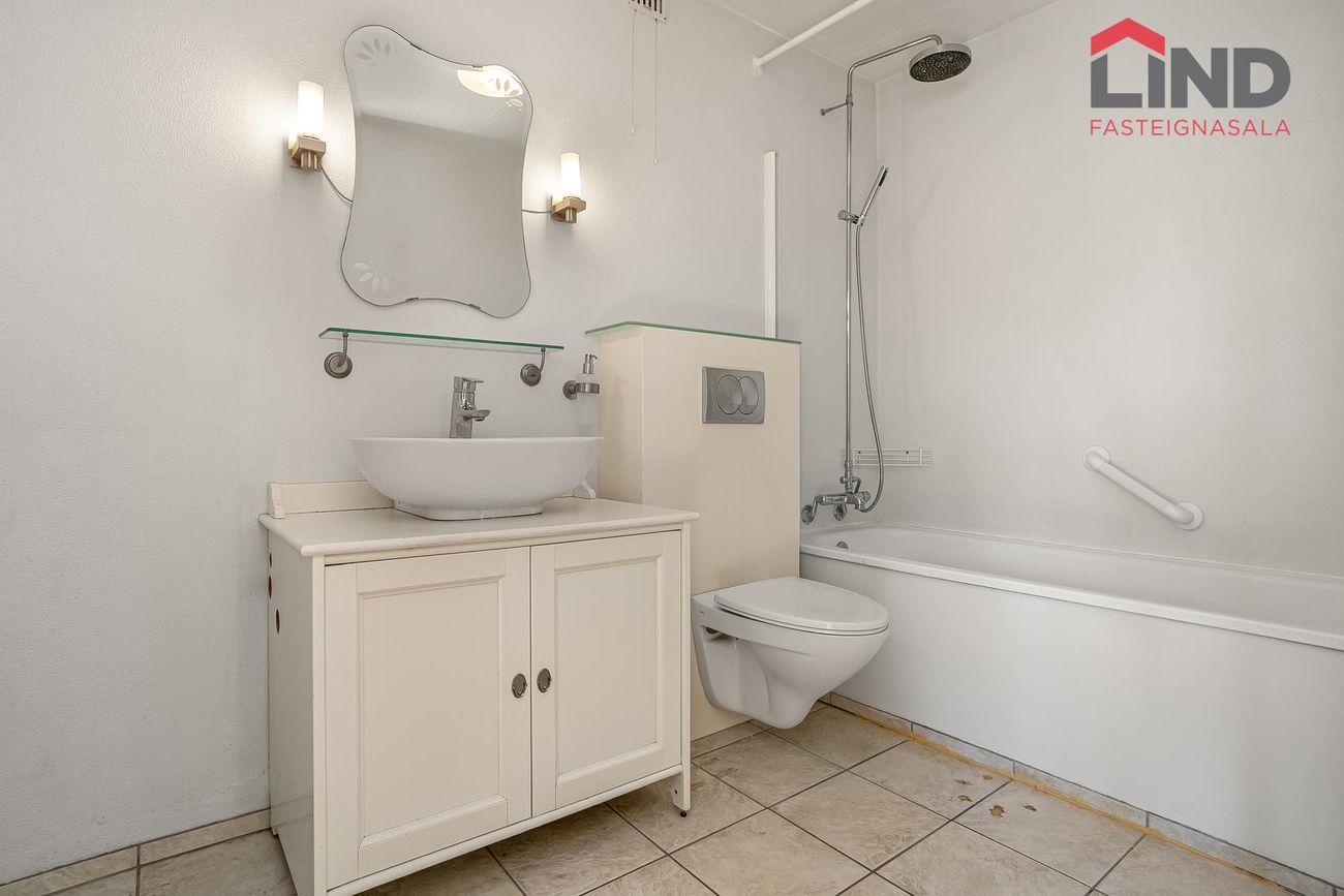 Baðherbergið er með innréttingu undir og við handlaug, baðkari, upphengdu salerni. Tengi er fyrir þvottavél inn á baðherbergi.
