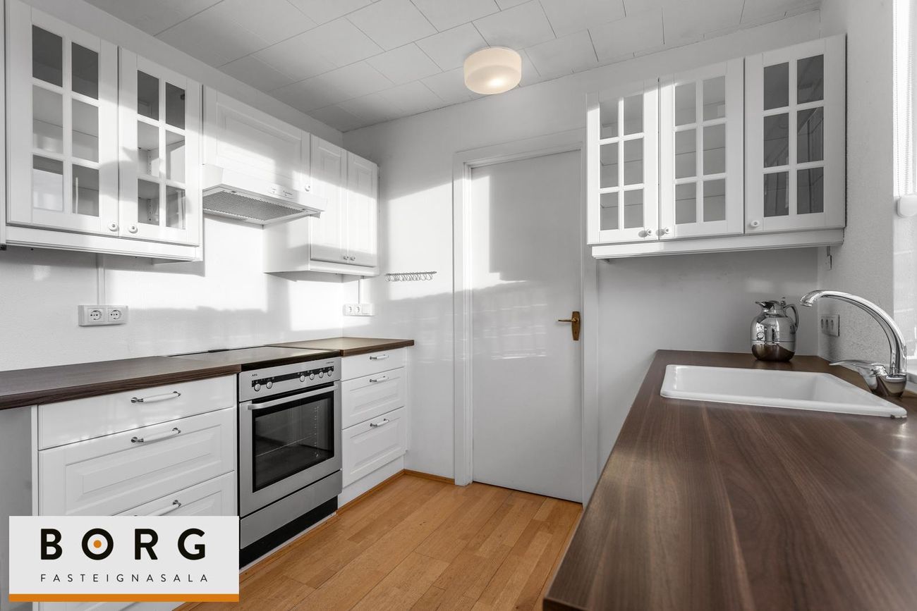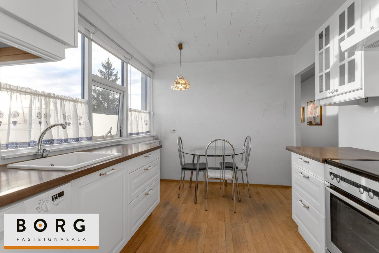 Eignin skiptist í: Forstofu, eldhús, búr, stofu, tvö svefnherbergi, baðherbergi og geymslu.