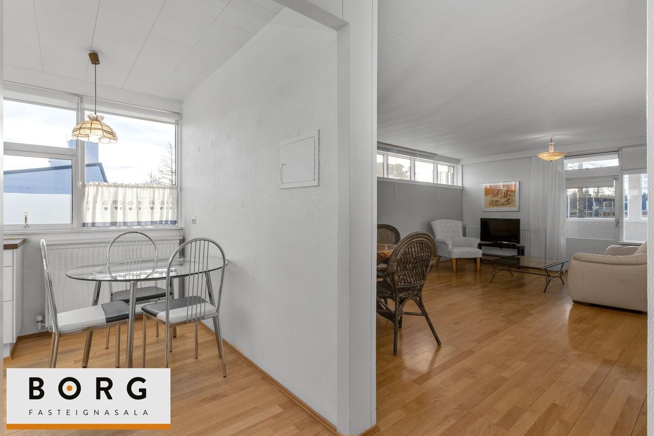 Stofan er rúmgóð með parket á gólfi. Gengið er út á svalir yfirbyggðar að hluta frá stofu sem snúa í vestur.