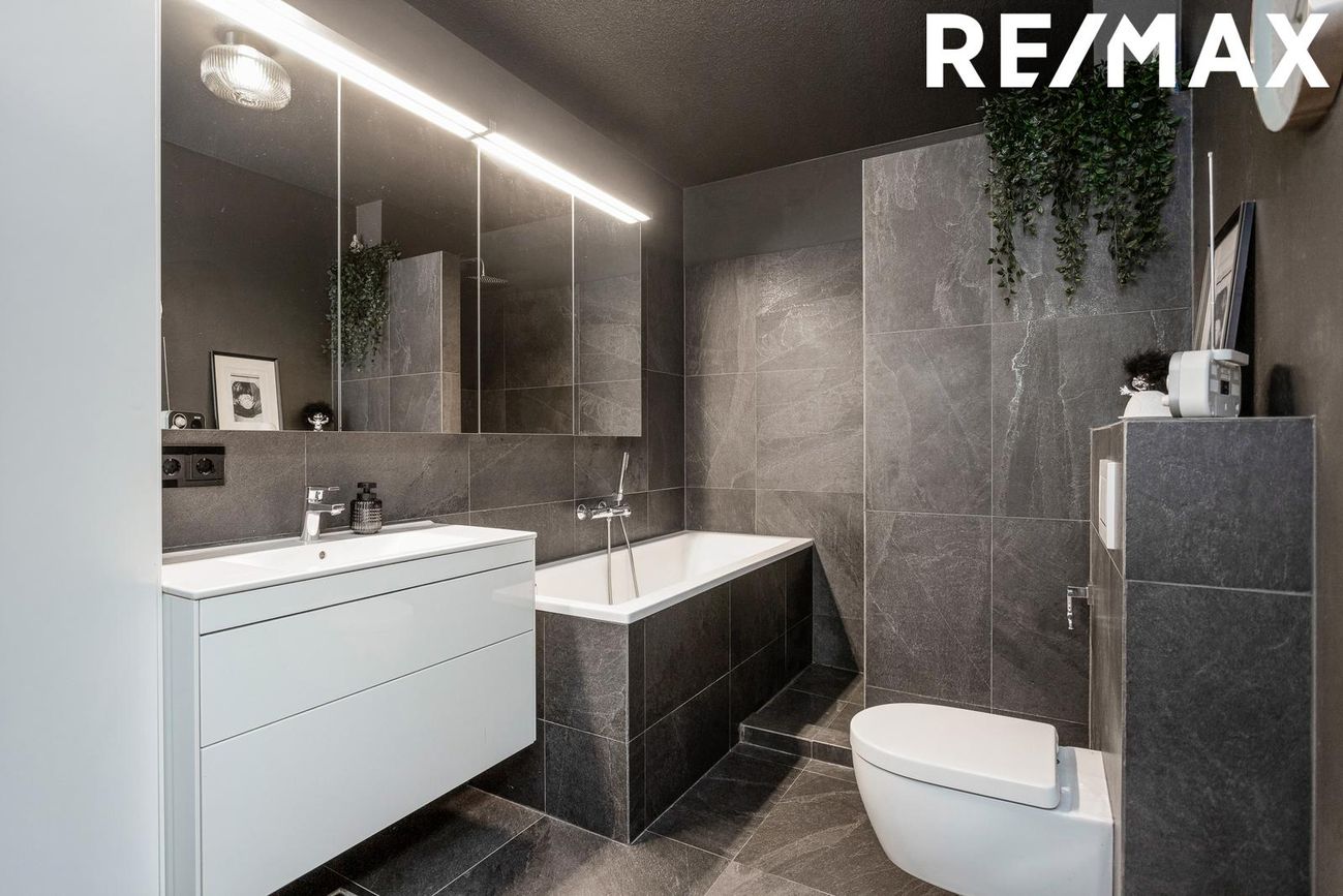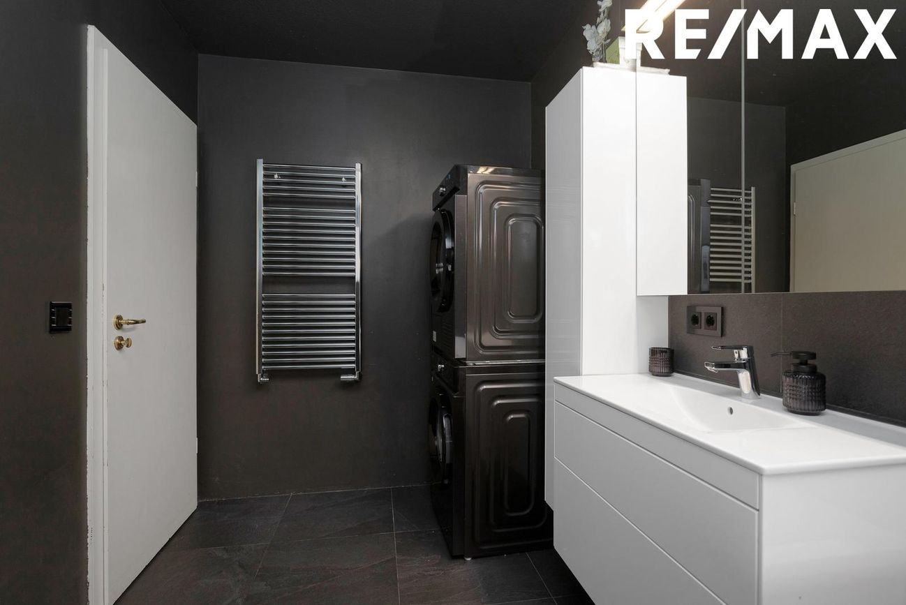 Baðherbergi: Flísar í hólf og gólf, walk-in sturta, baðkar, snyrtileg innrétting, tengi fyrir þvottavél & þurrkara.