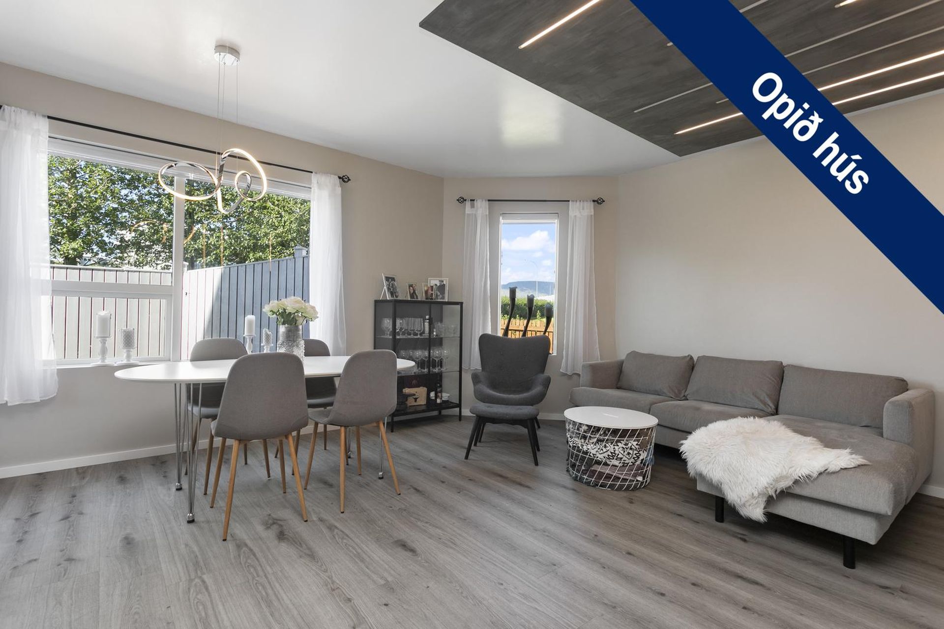 Stofa/borðstofa: Með parketi á gólfi opið inn í eldhús útgengt út á svalir.