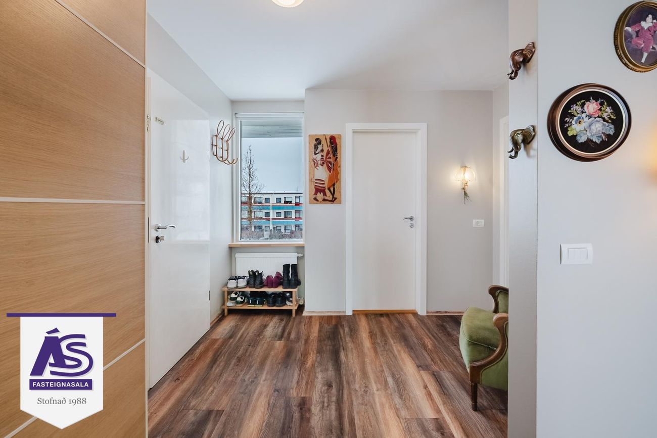 Forstofa björt með góðum glugga og parket á gólfi.