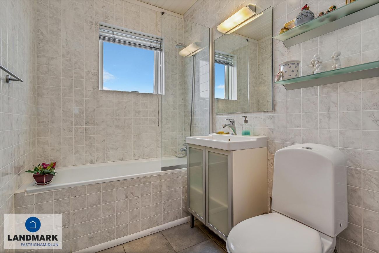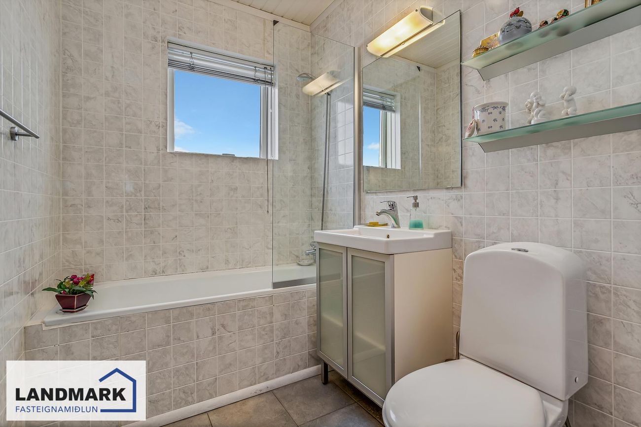 Baðherbergi var endurnýjað fyrir einhverjum árum síðan og eru flísar á gólfi og flísaplötur á veggjum, handklæðaofn, baðkar með sturtuhengi og er gluggi á baðherbergi.