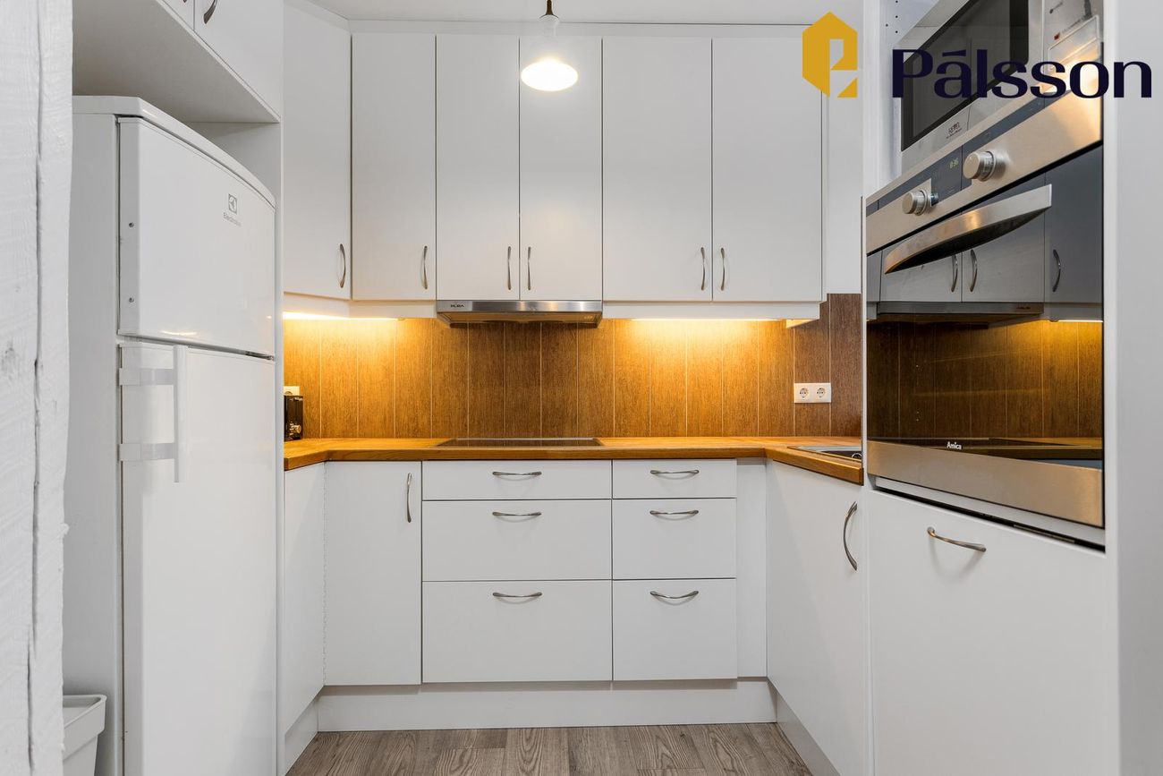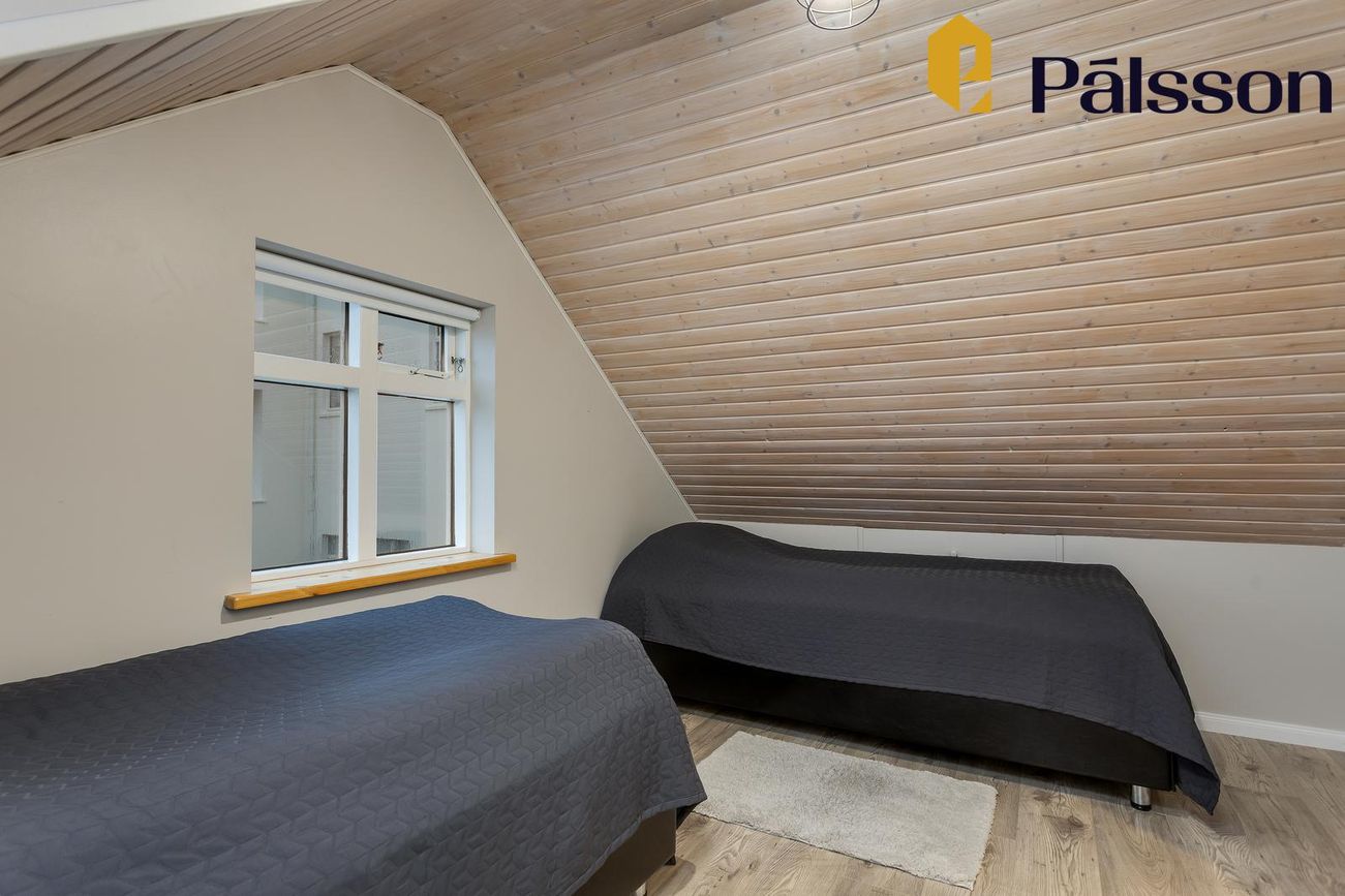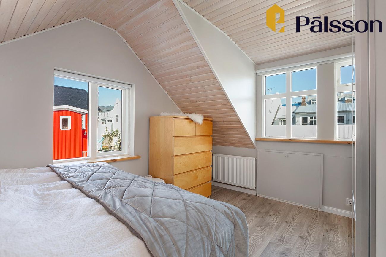 Svefnherbergin eru með parket á gólfi og fataskápum. Geymslupláss undir súð í báðum herbergjum.