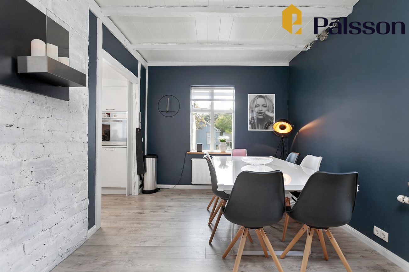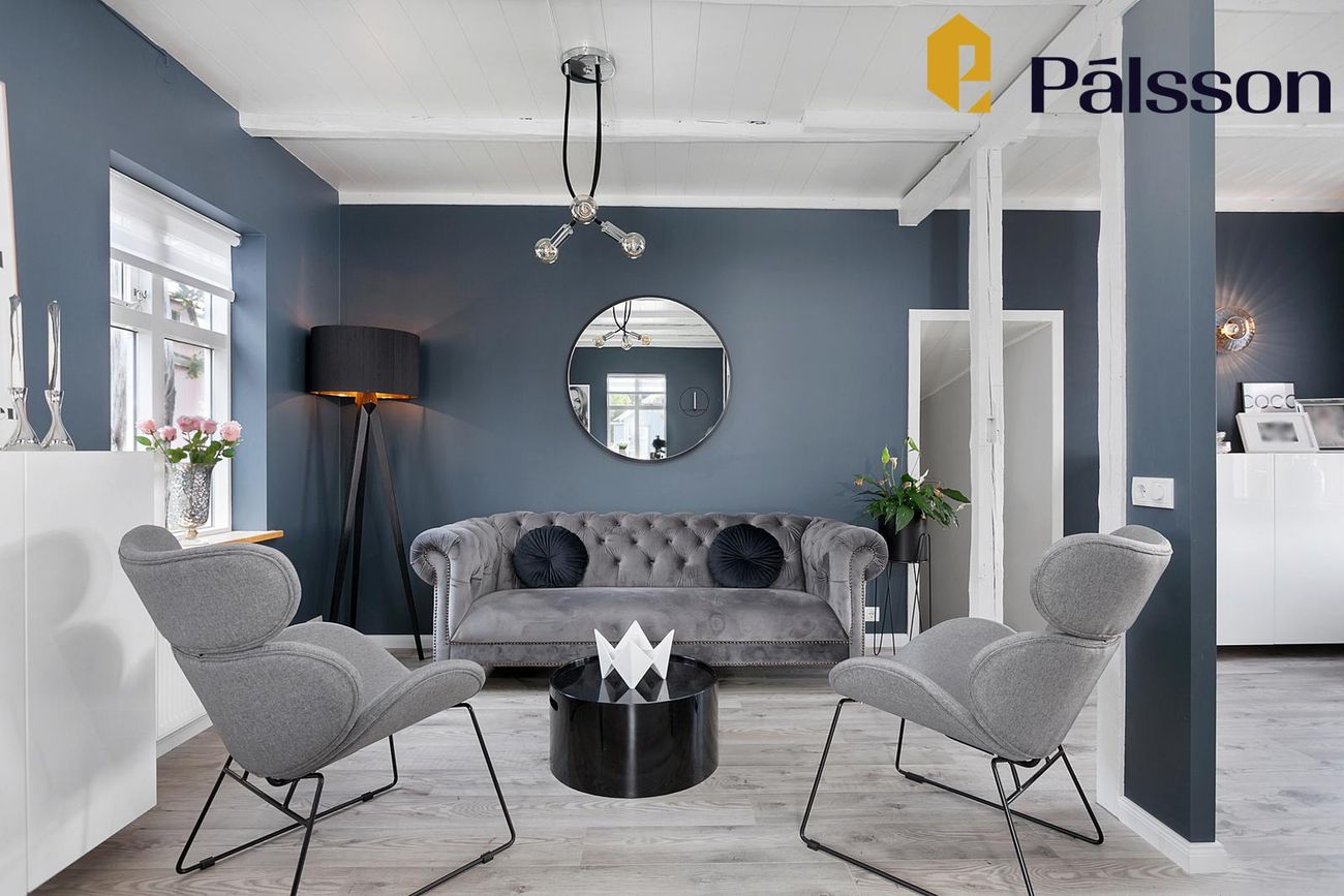 Parketlagt rými með hvítmálaða viðarstólpa og skorstein sem setja fallegan svip á rýmið. Opin tenging við eldhús.
