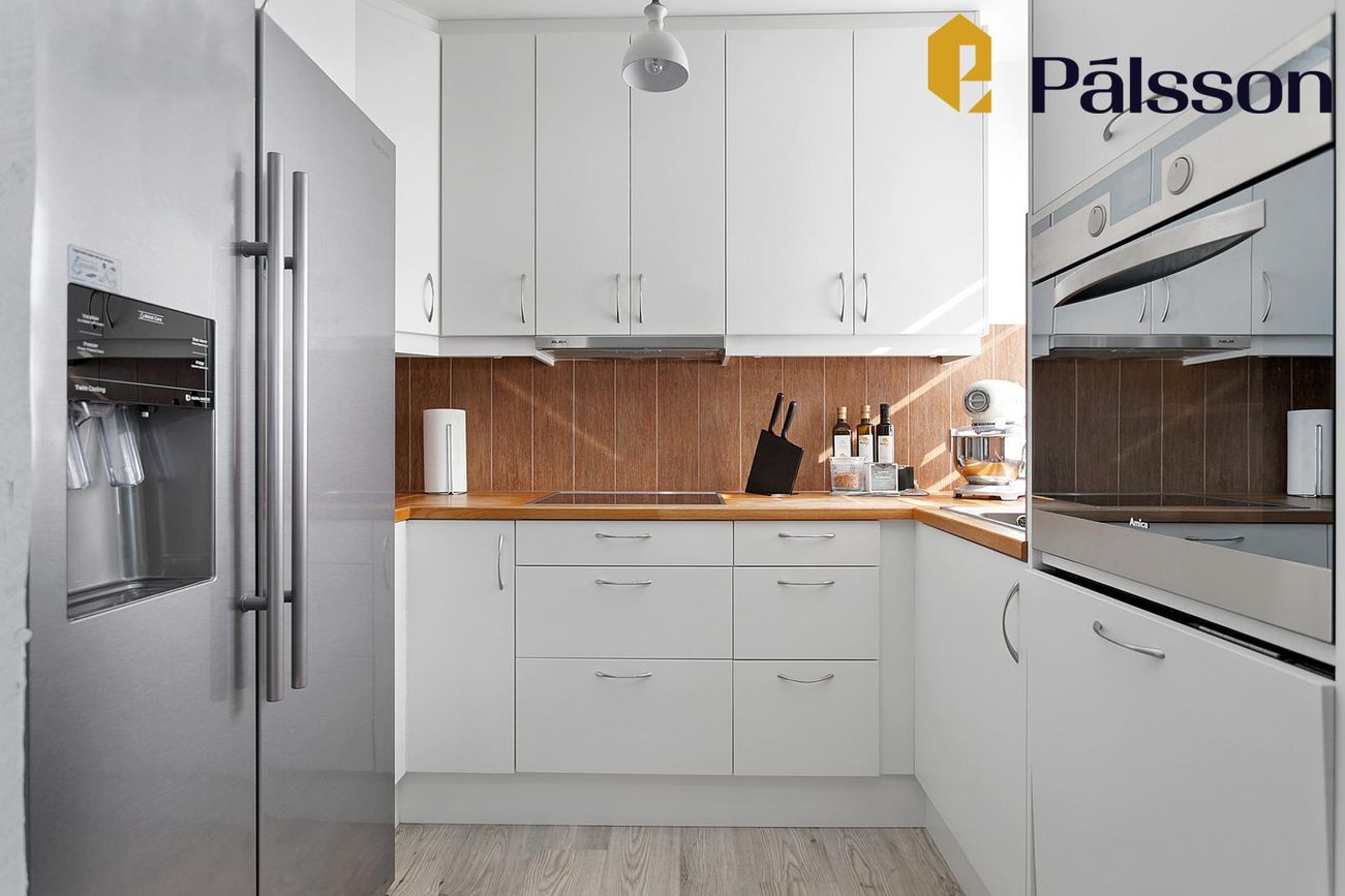 U-laga innrétting með pláss fyrir amerískan ísskáp. Innbyggð uppþvottavél, bakarofn í vinnuhæð, helluborð, vifta og vaskur við glugga. Eldhús í einni íbúð sett upp 2020.