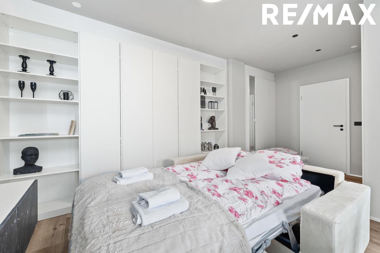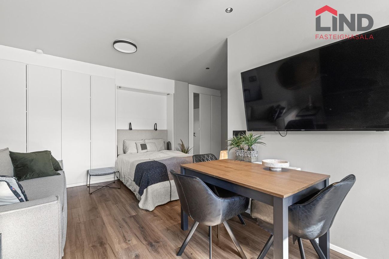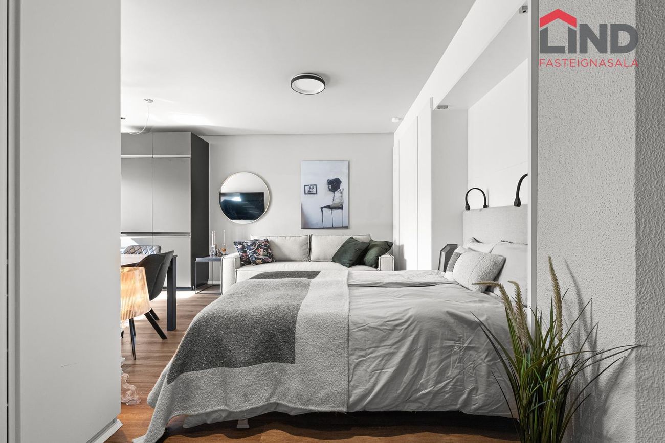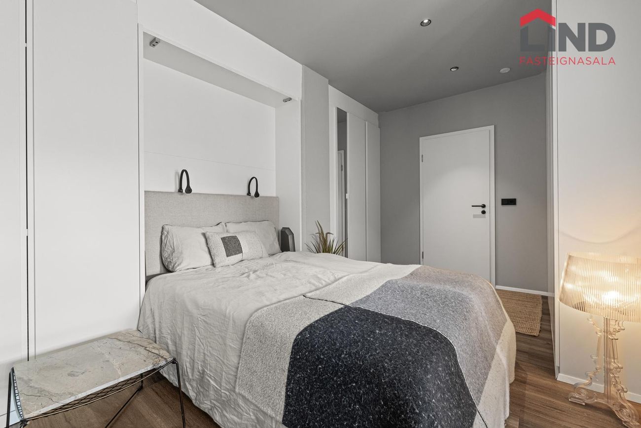 Alrými með innbyggðu fellirúmi og góðu skápaplássi, parket á gólfi.