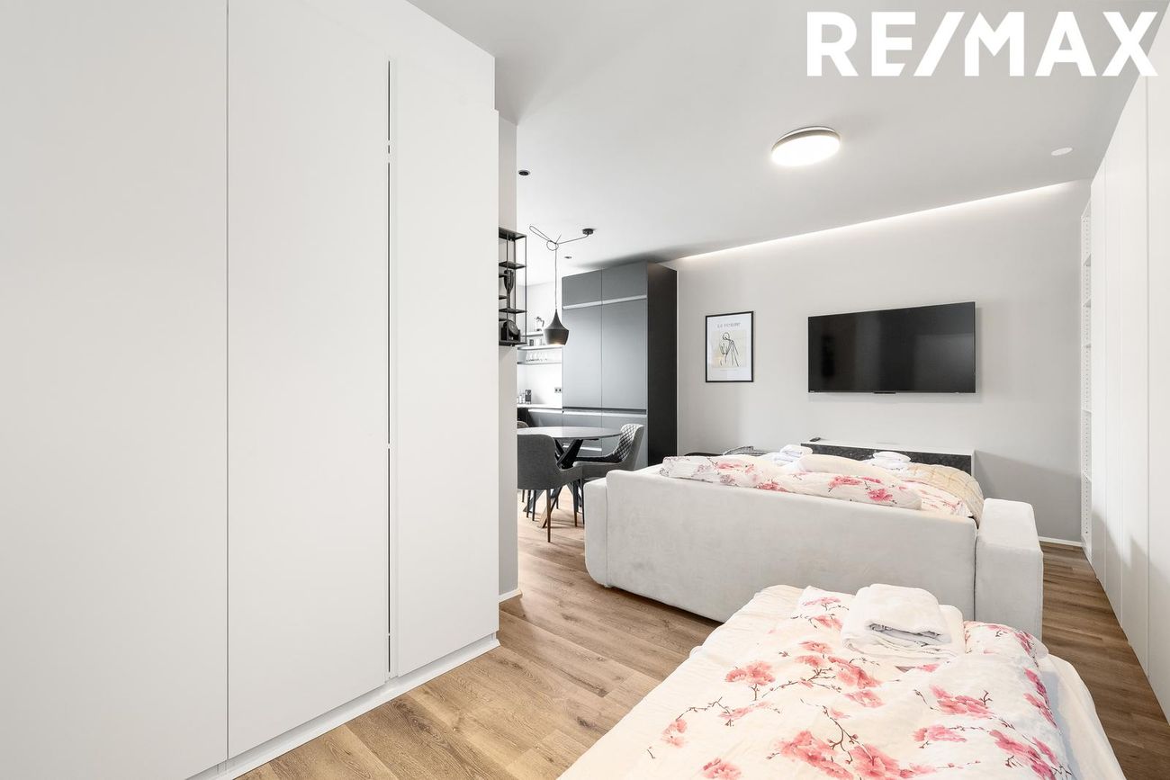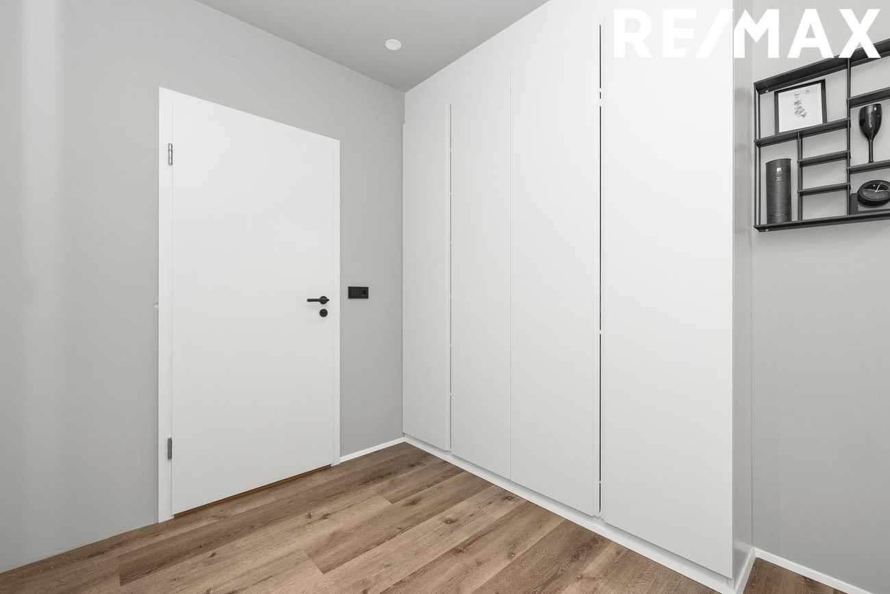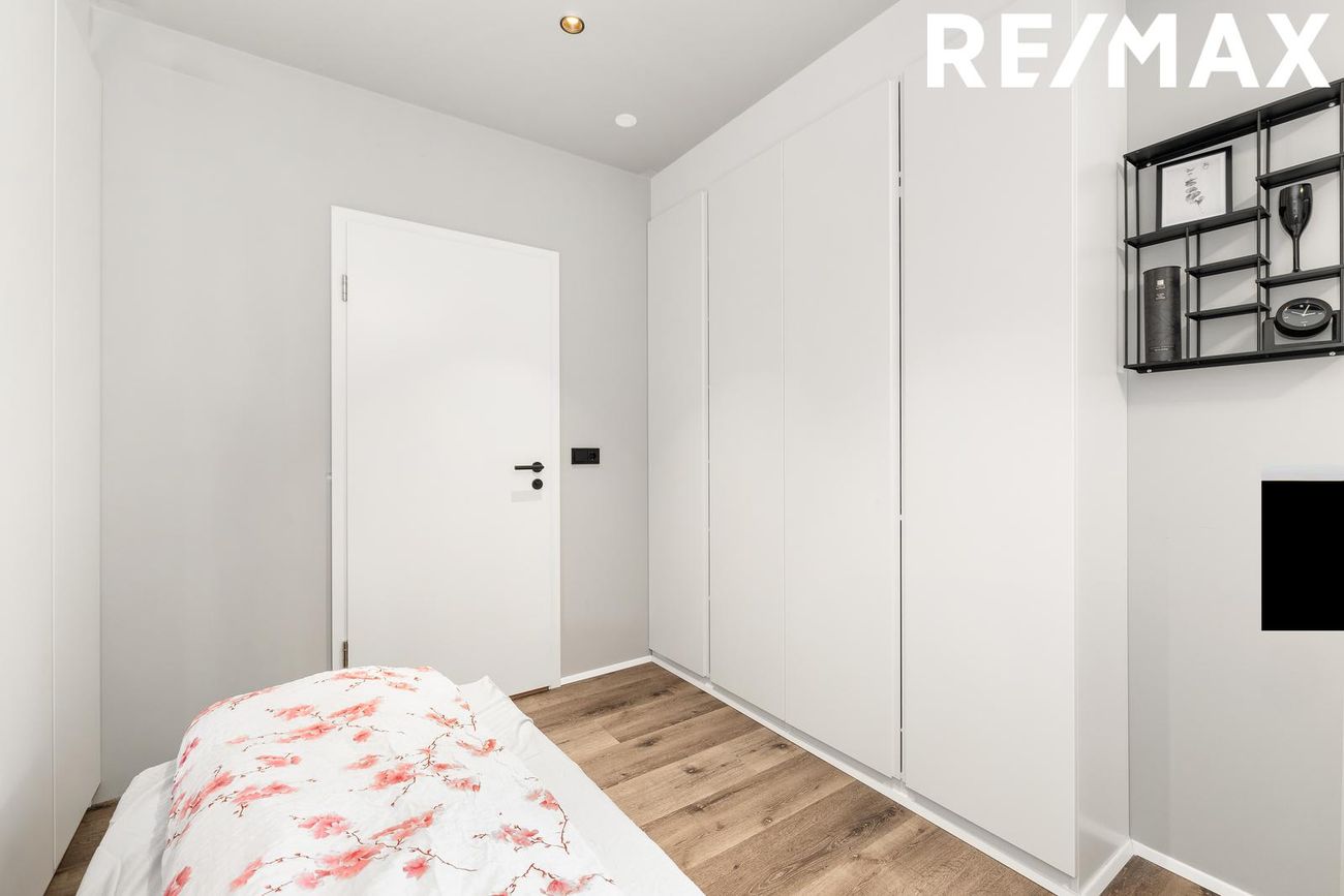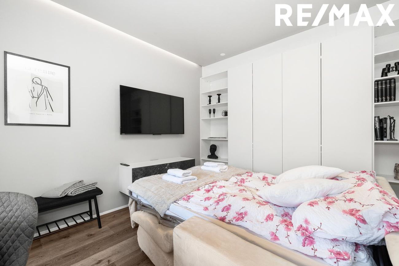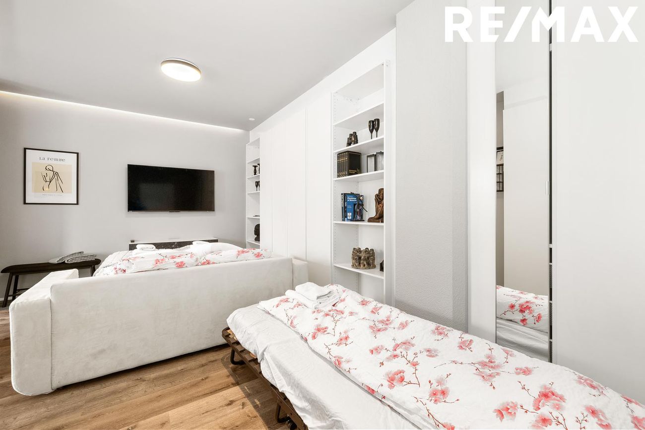 Alrými með innbyggðu fellirúmi og góðu skápaplássi, parket á gólfi.