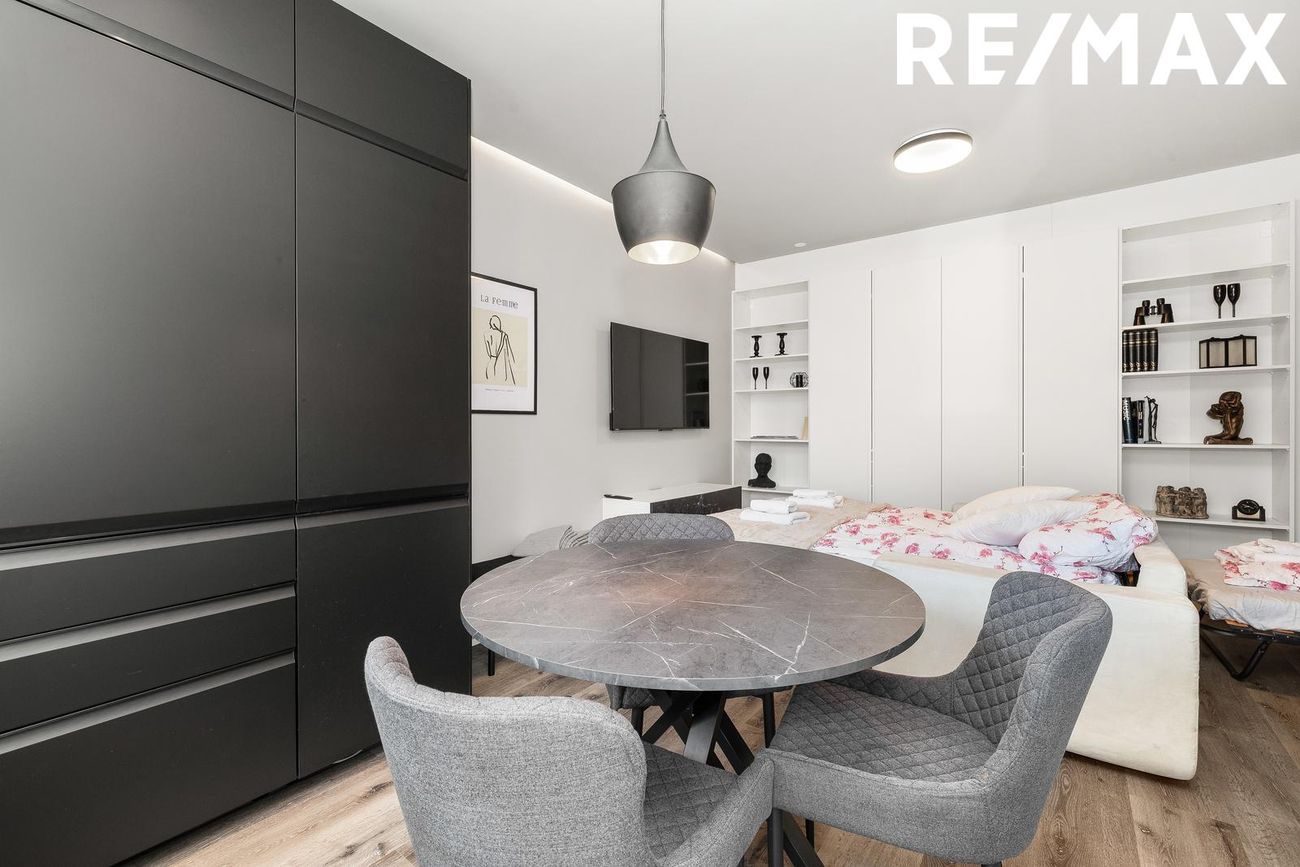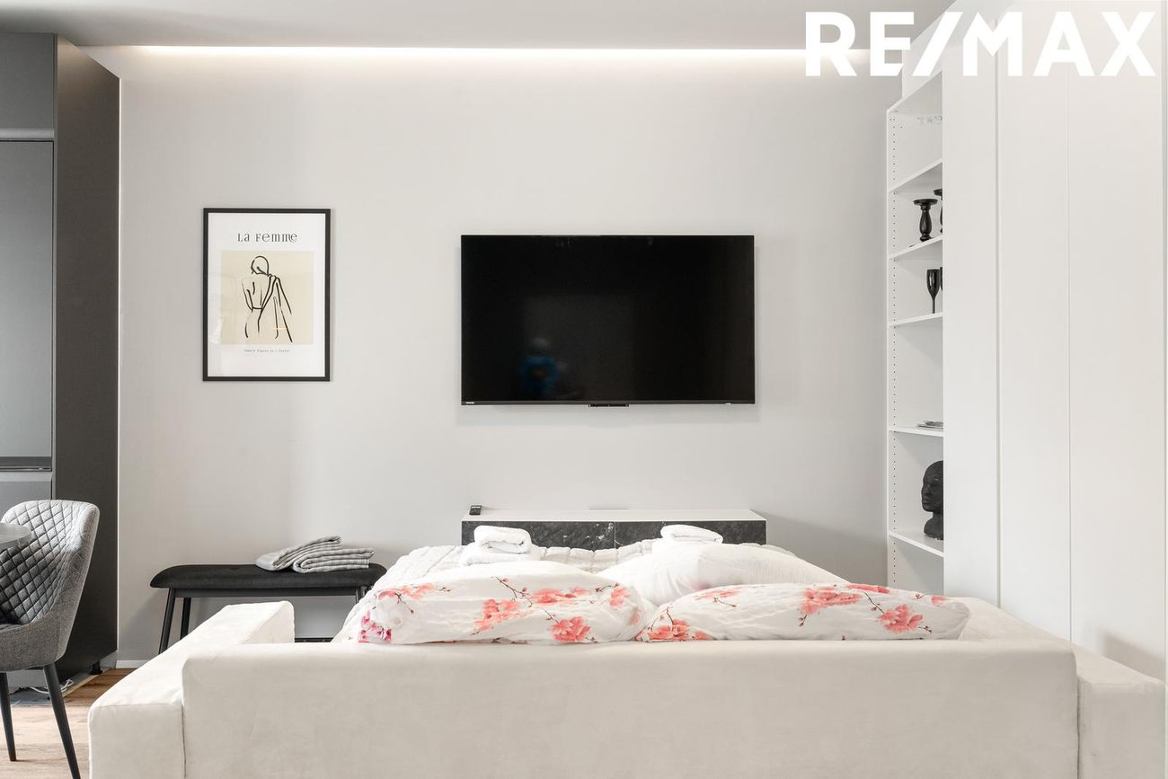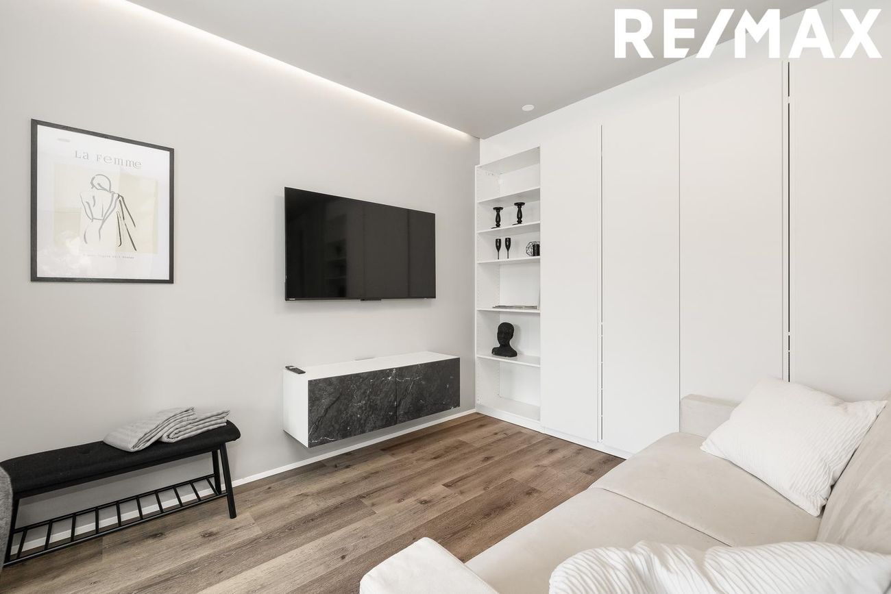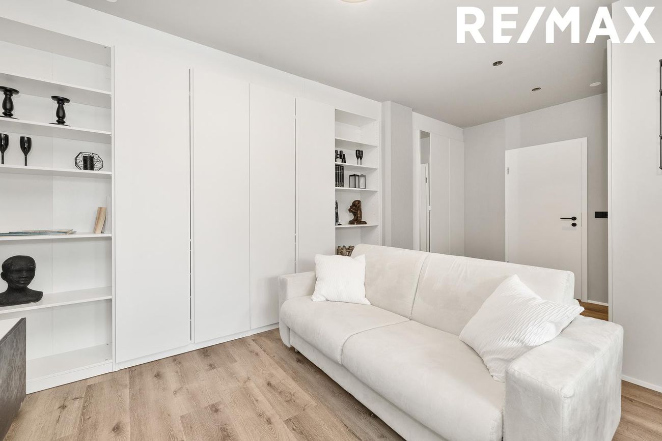 Alrými með innbyggðu fellirúmi og góðu skápaplássi, parket á gólfi.