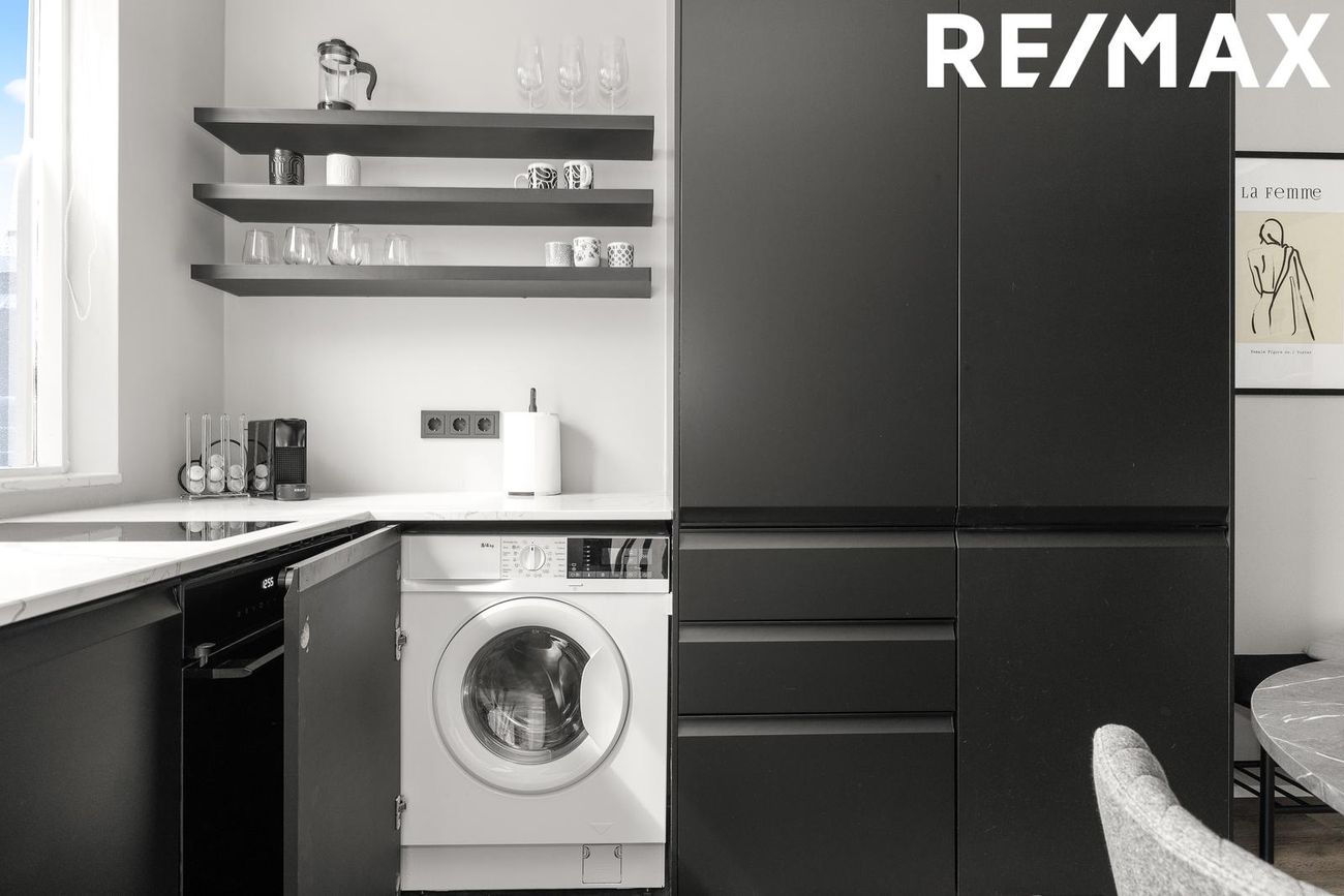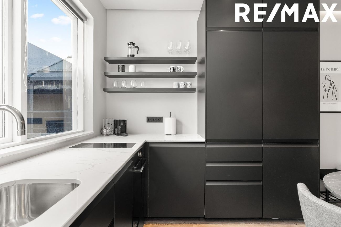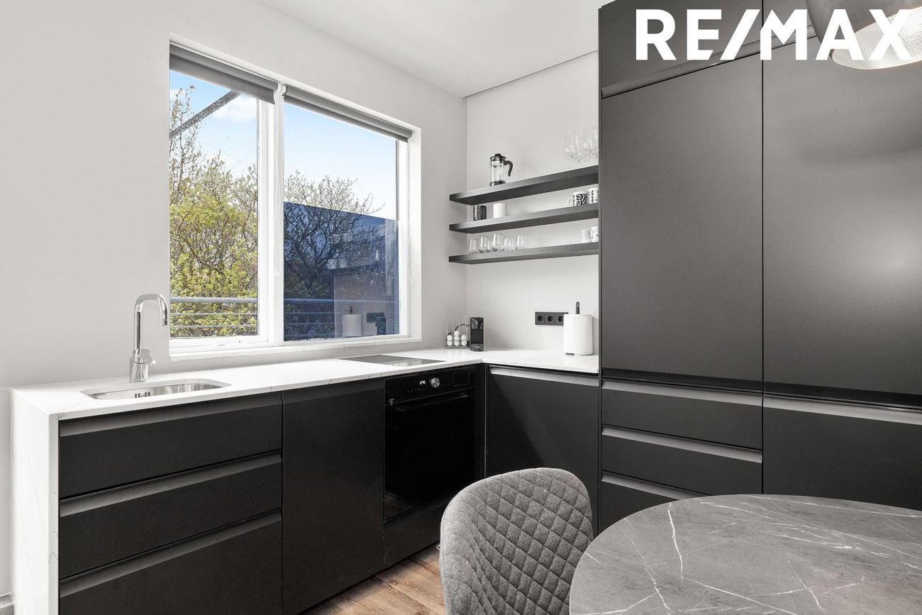 Eldhús með nýlegri innréttingu, spanhelluborði, innbyggðum tækjum sem fylgja, steinn á borði og útgengi á suðursvalir, parket á gólfi.