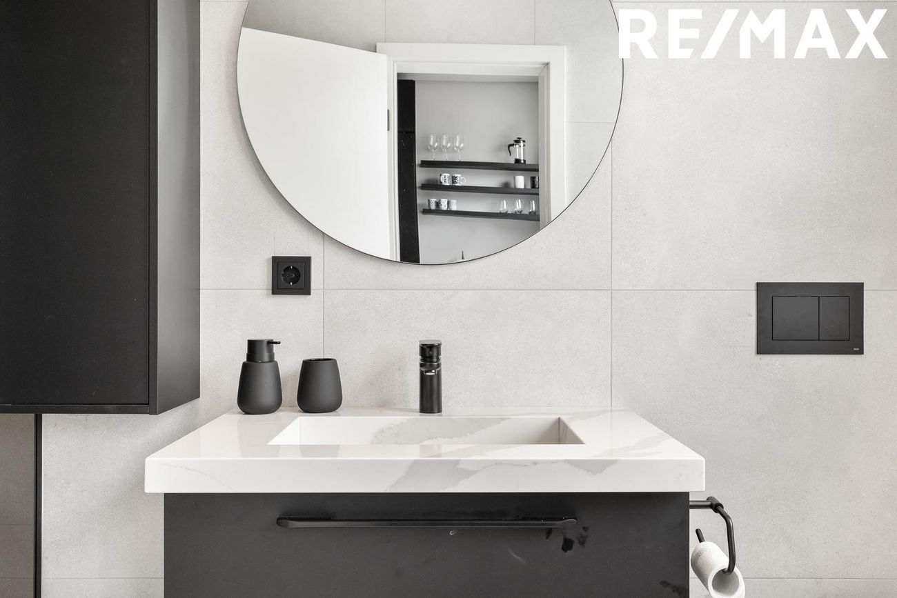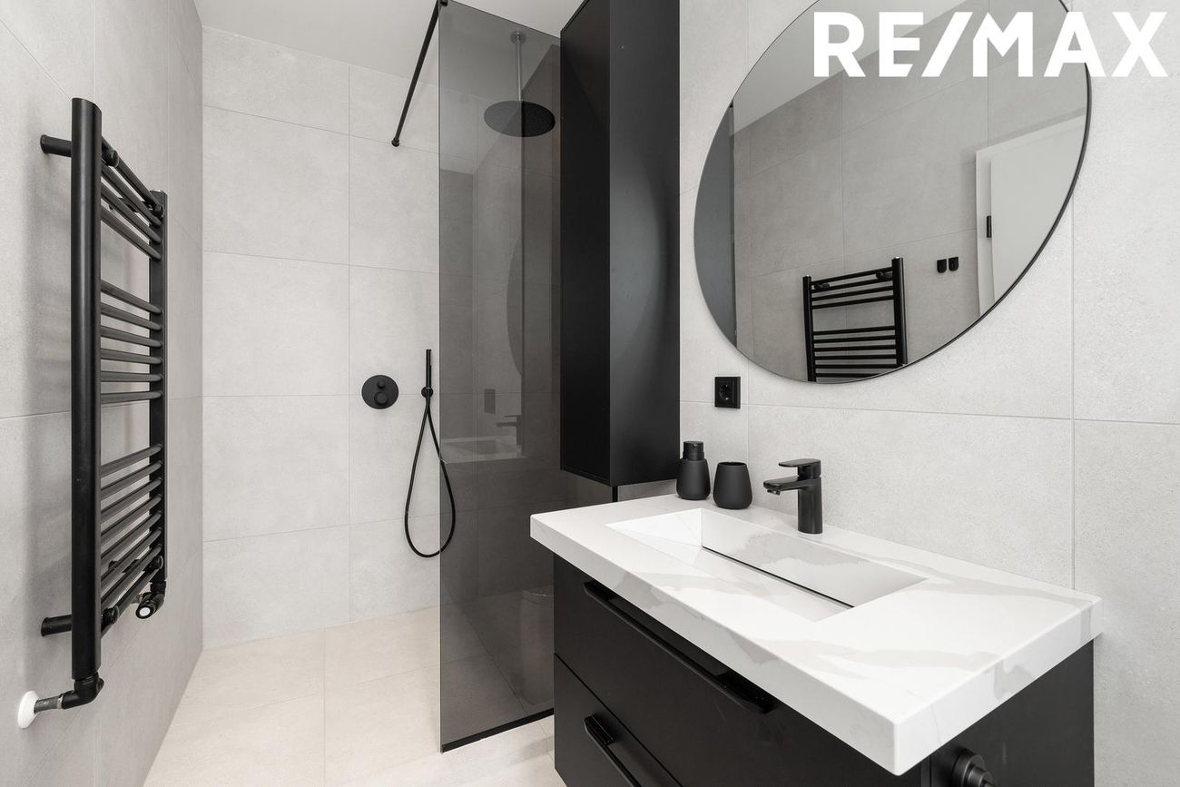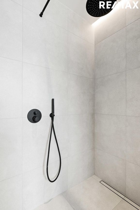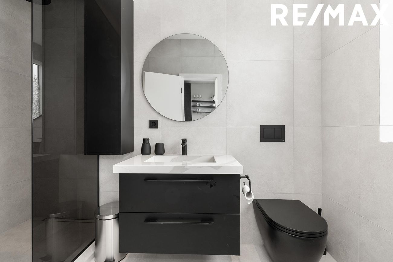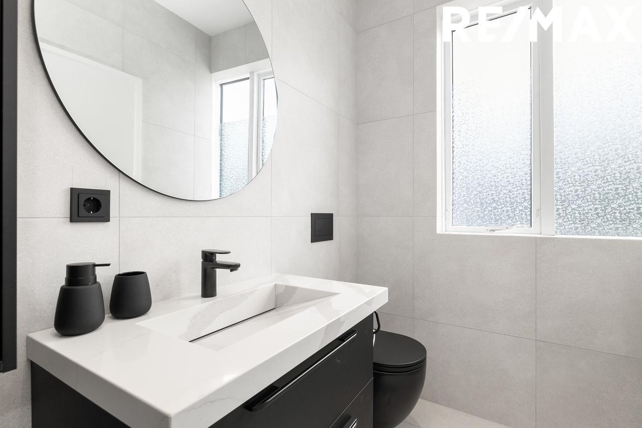 Baðherbergi með glugga, flísalagt í hólf og gólf með innfelldri sturtuaðstöðu, handlaug úr steini frá S. Helgasyni og upphengt salerni.