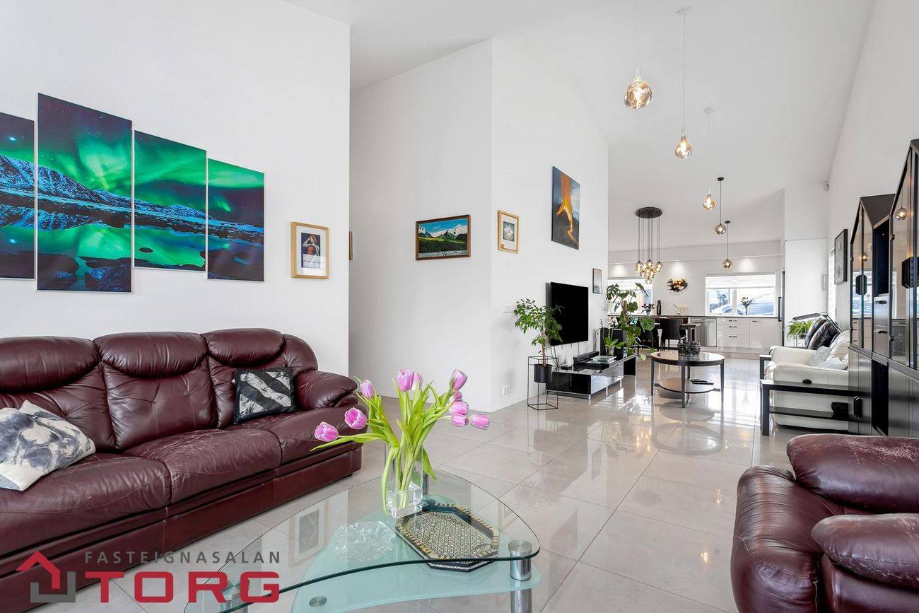 Fasteignasalan TORG kynnir: ENDARAÐHÚS Á EINNI HÆÐ – ÆÐISLEGT STÓRT ELDHÚS – 3 SVEFNHERBERGI – 1 BAÐHERBERGI – GESTASNYRTING – GÓLFHITI - FLÍSAR Á GÓLFUM – AUKIN LOFTHÆÐ - BÍLSKÚR ! Allar nánari upplýsingar veitir Jóhanna Kristín Tómasdóttir, lgfs. í síma 837.8889 hjá johanna@fstorg.is Fjölskylduvænt, vel skipulagt og fallegt 203,6 FM endaraðhús á einni hæð með aukinni lofthæð byggt 2019 í góðu og rólegu hverfi í Leirvogstungu. Húsið skiptist í forstofu, stórt og fjölskylduvænt eldhús, stofur, 3 svefnherbergi og baðherbergi og gestasnyrtingu og innbyggðan bílskúr. Hiti í bílastæði fyrir framan bílskúr. Steyptur veggur meðfram lóðinni en að öðru leiti er garðurinn ófrágenginn. Allar nánari upplýsingar veitir Jóhanna Kristín Tómasdóttir, lgfs. í síma 837.8889 hjá johanna@fstorg.is