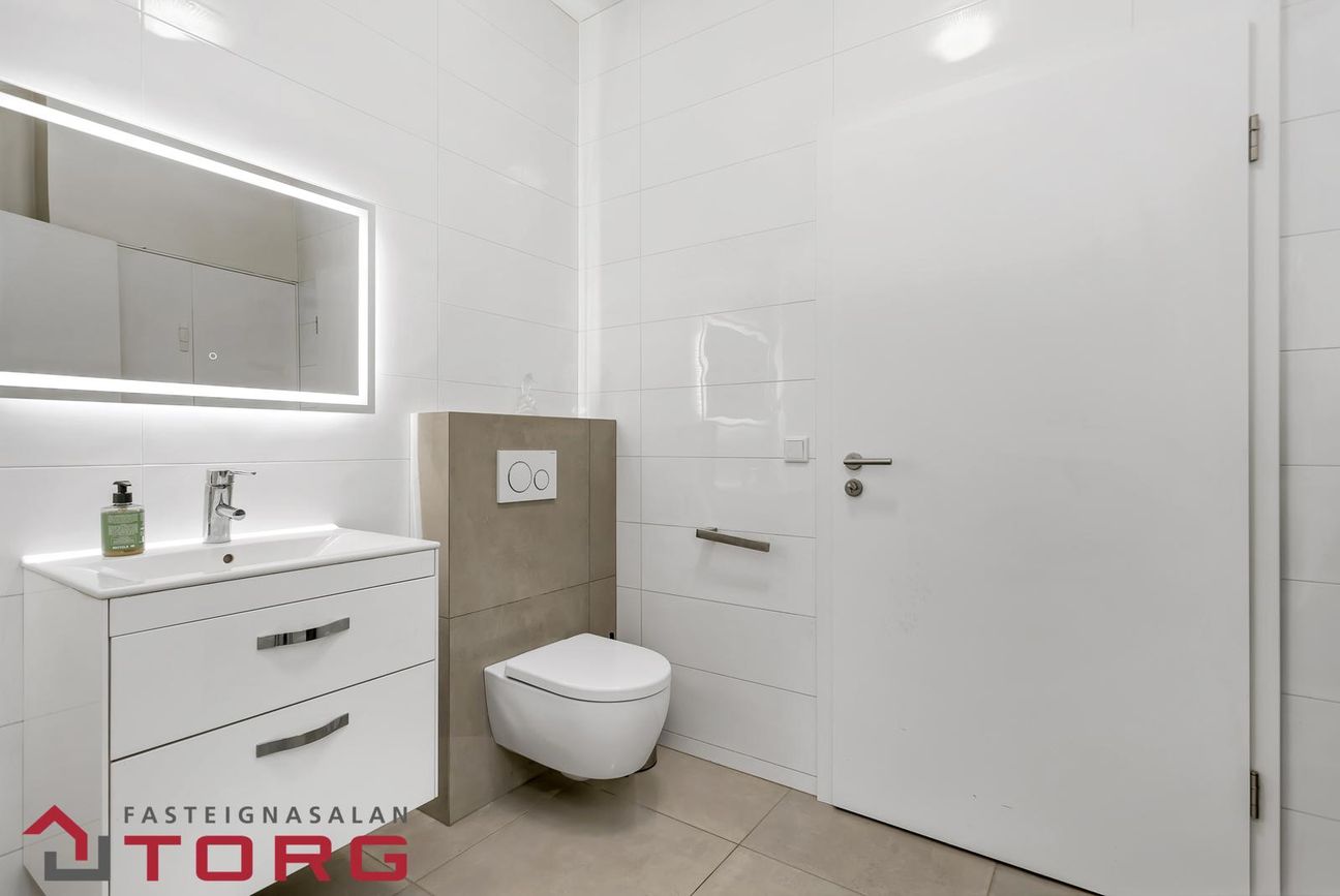 Gestasnyrting: Inn af forstofu á vinstri hönd. Flísalagt hólf í gólf með upphengdu salerni og hvítri háglans innréttingu.