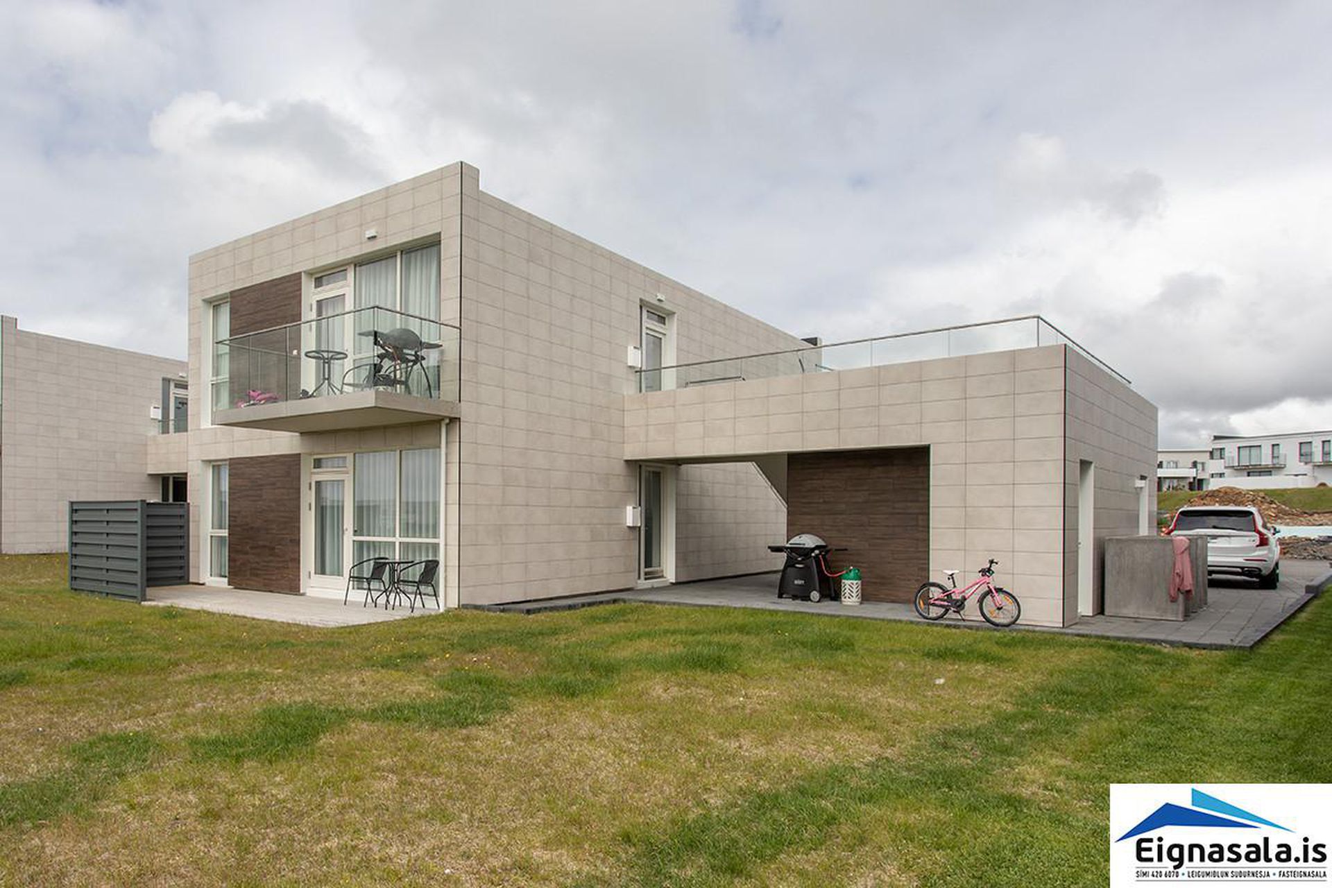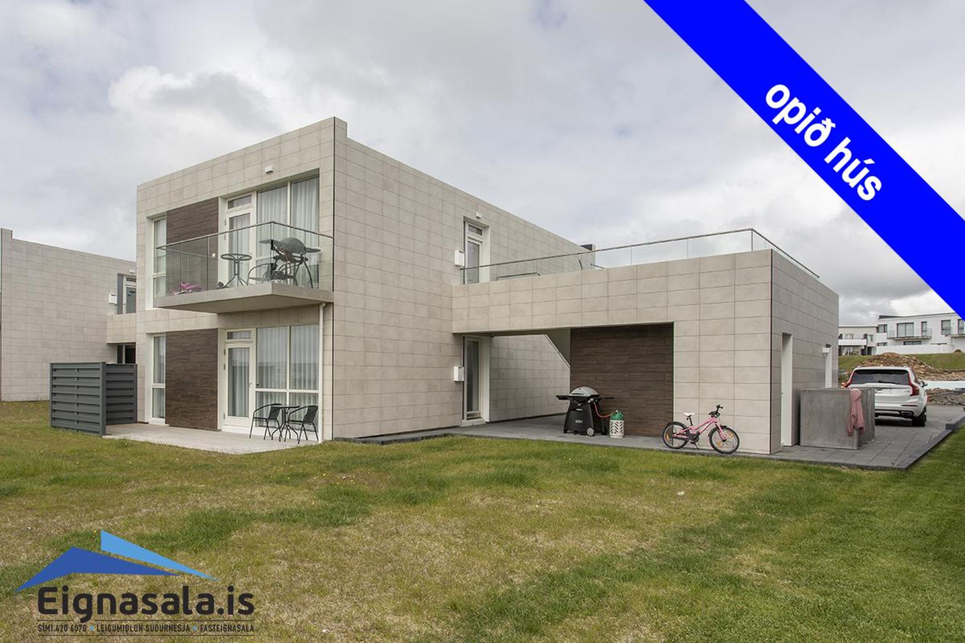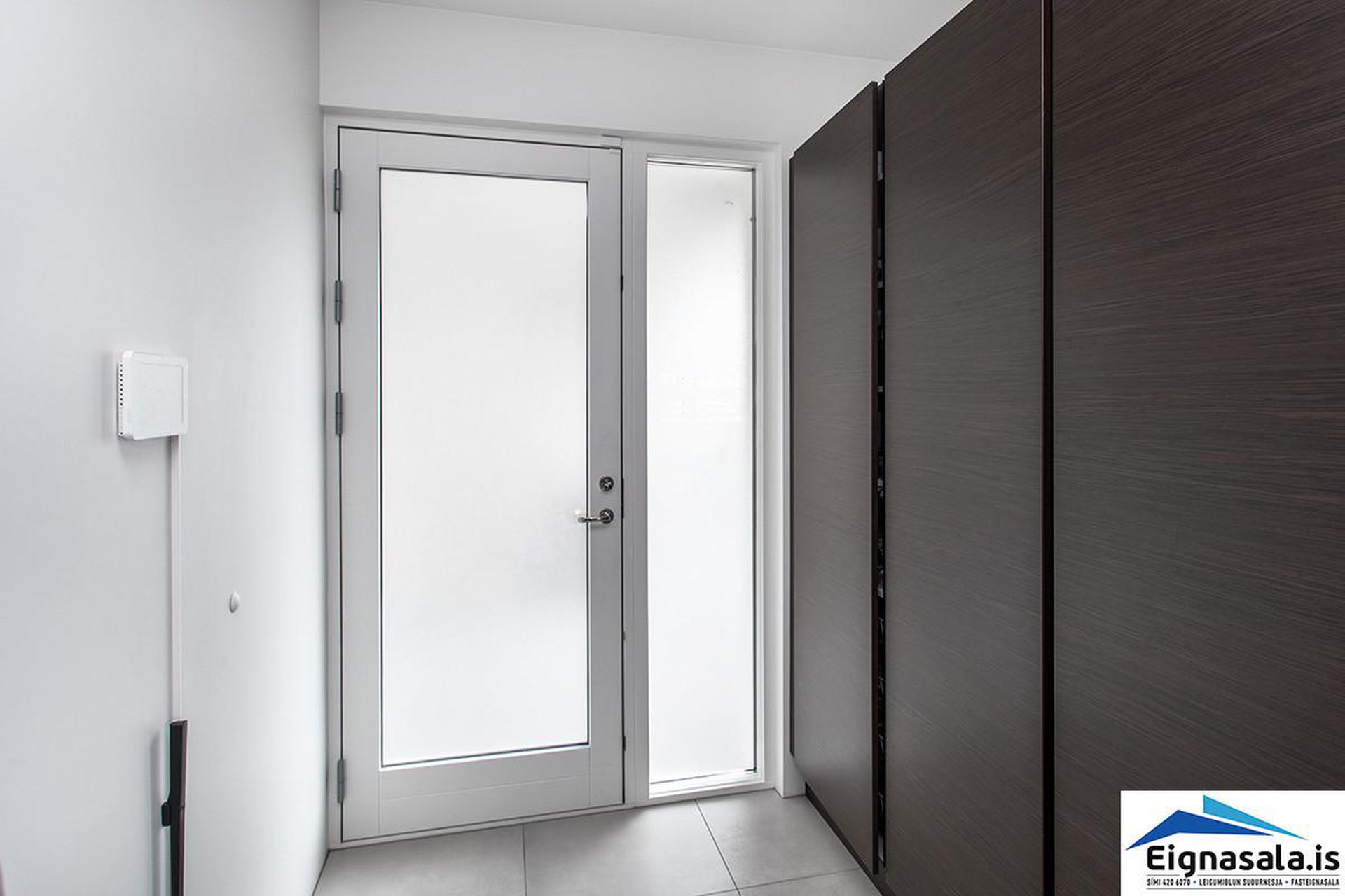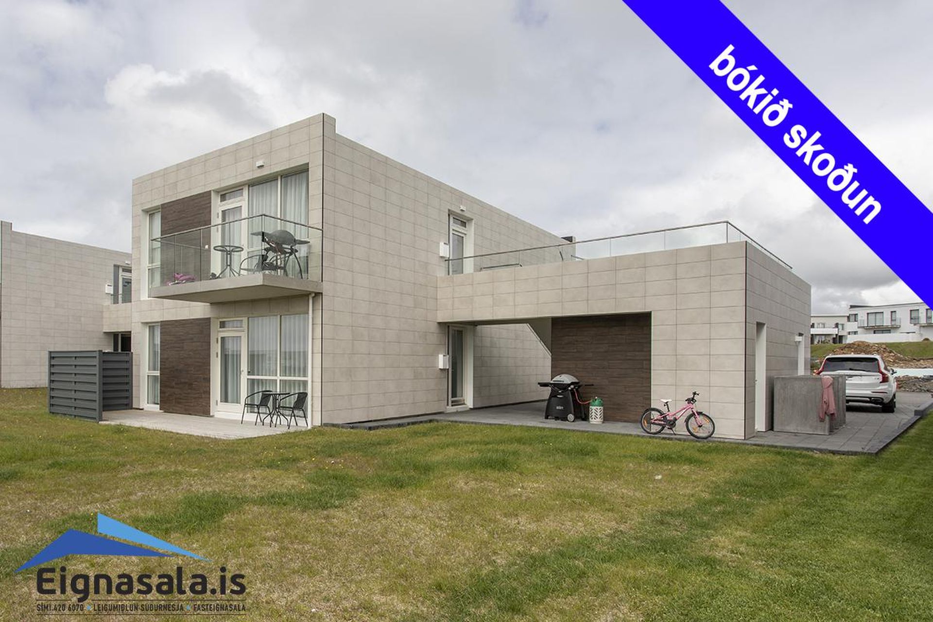Lóð er fullfrágengin með hitalögn í gönguleið. Handrið eru úr hertu öryggisgleri.