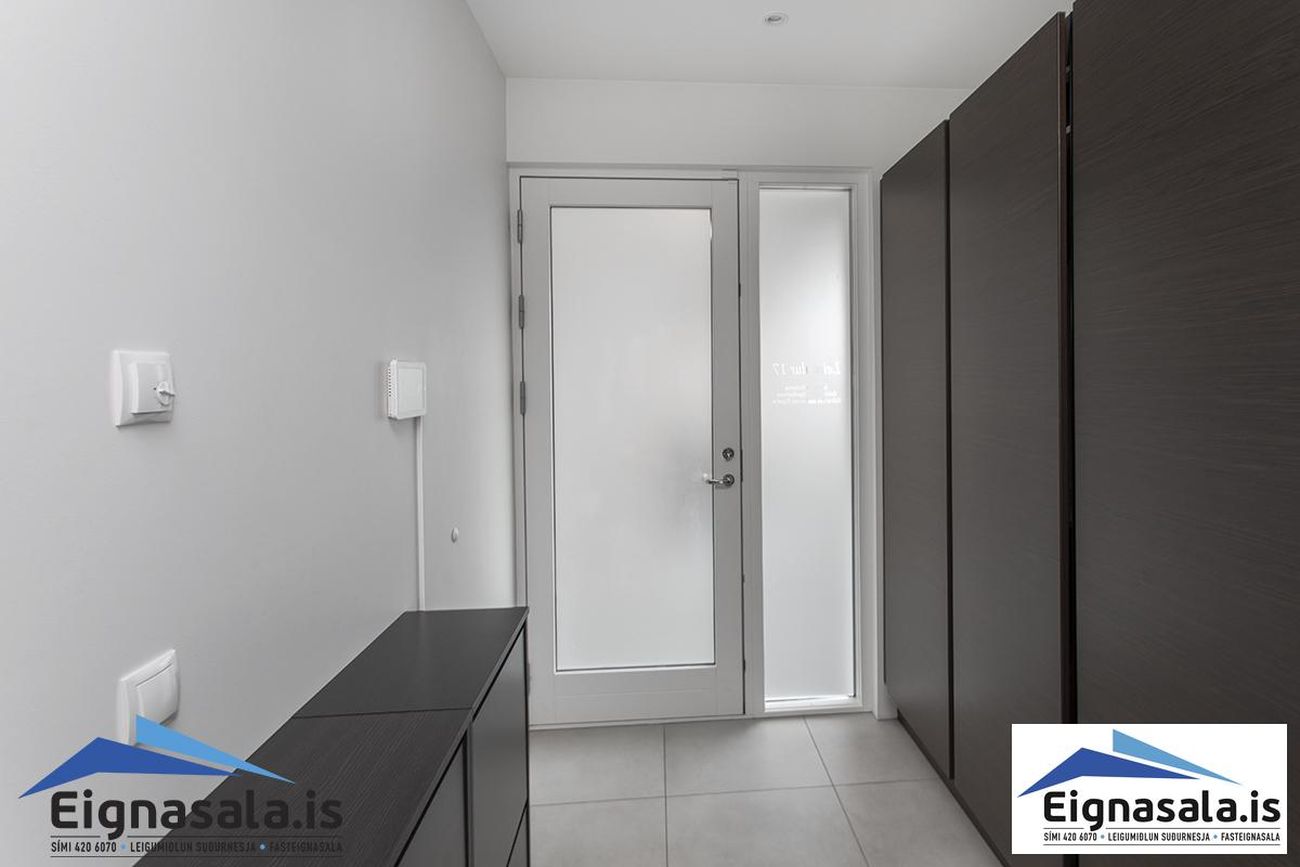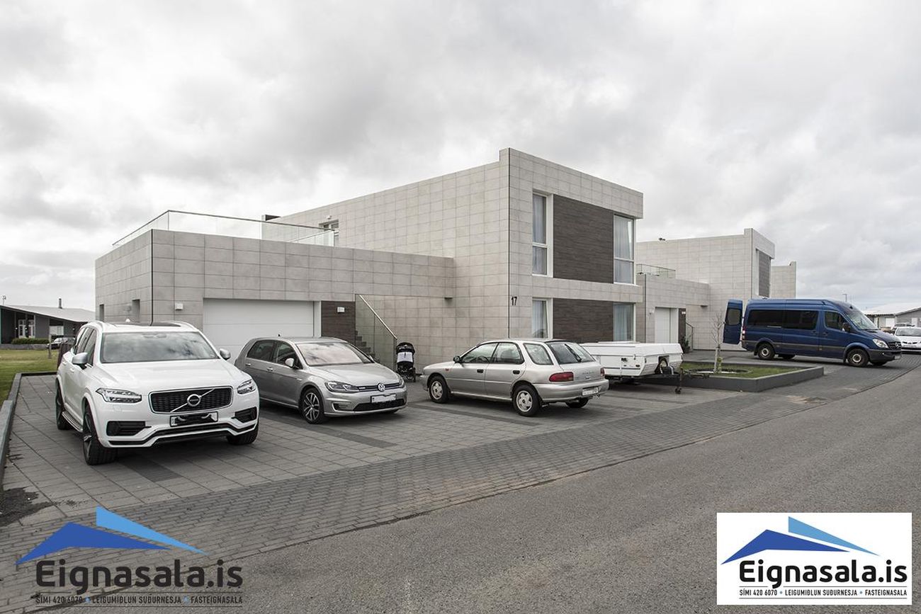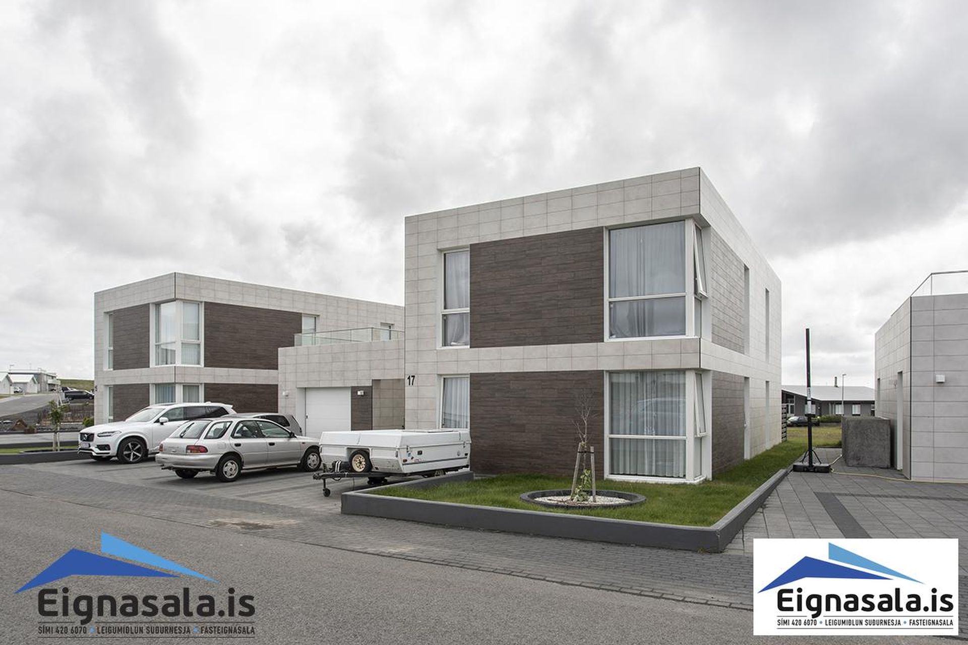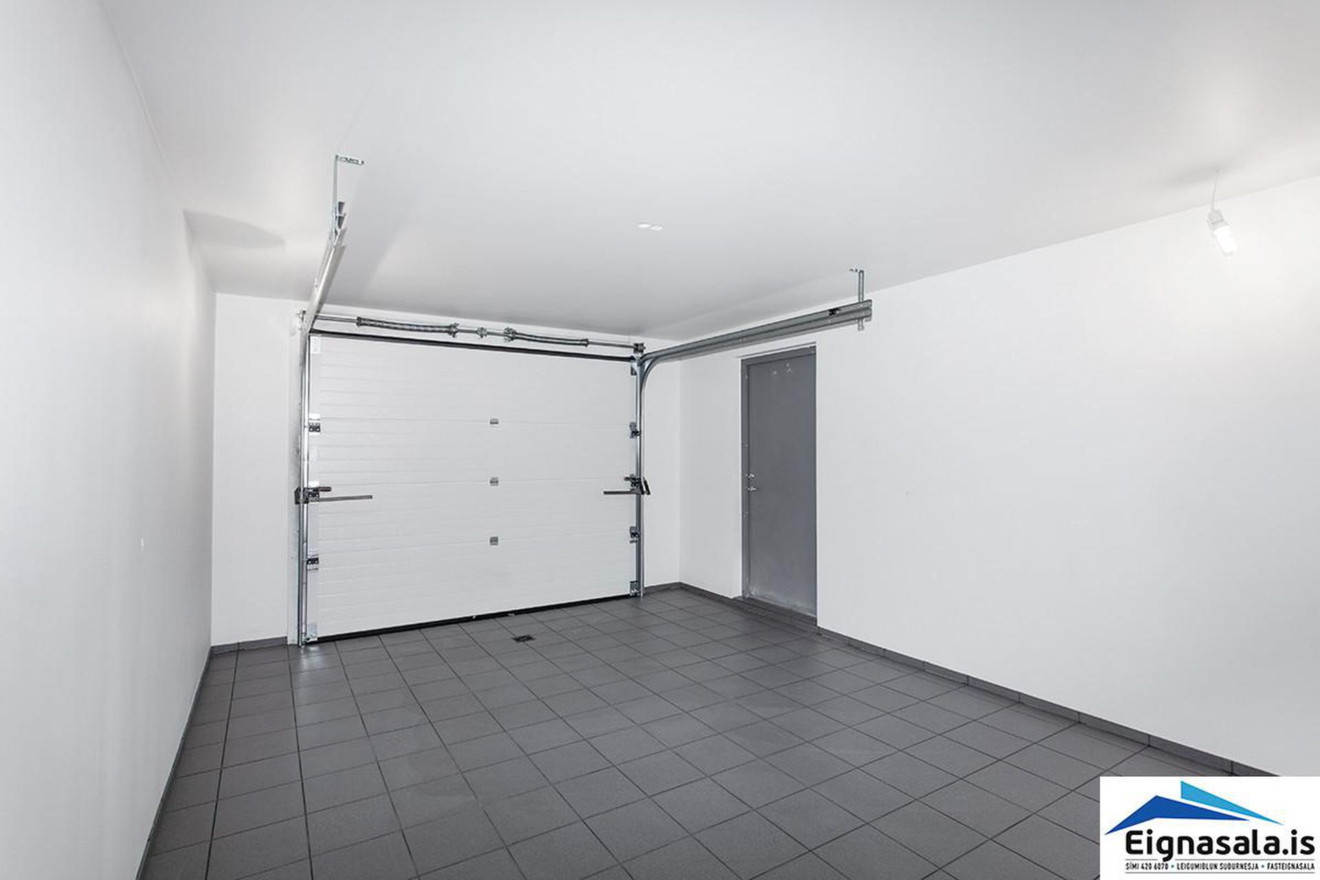 Lóð er fullfrágengin með hitalögn í gönguleið. Handrið eru úr hertu öryggisgleri.