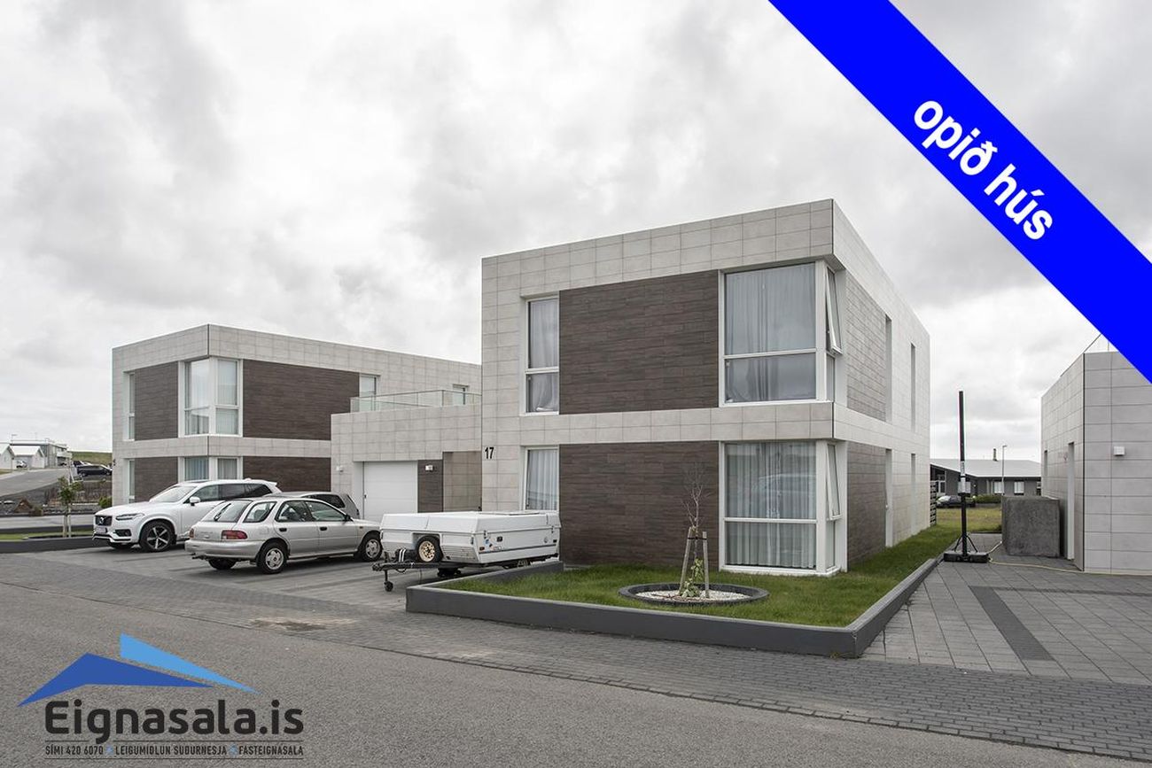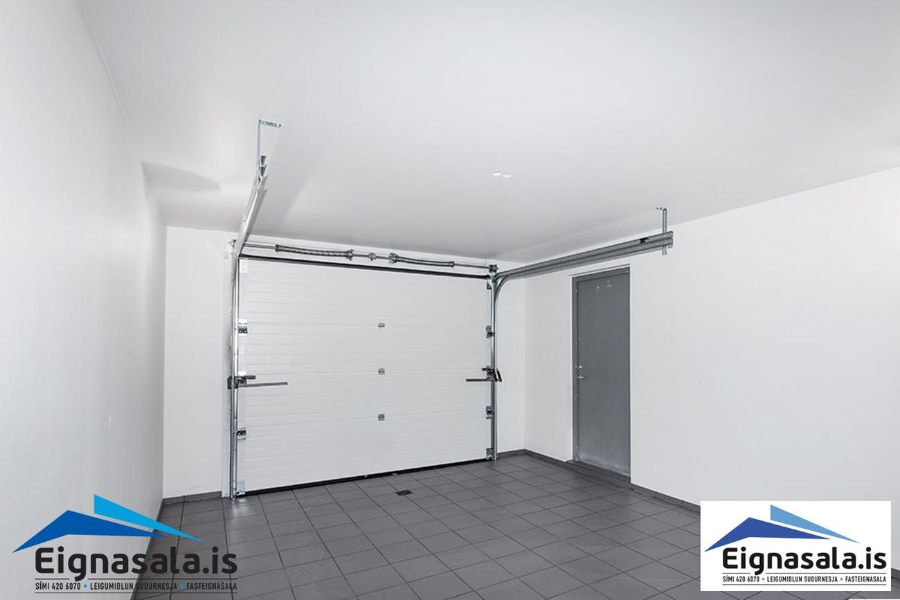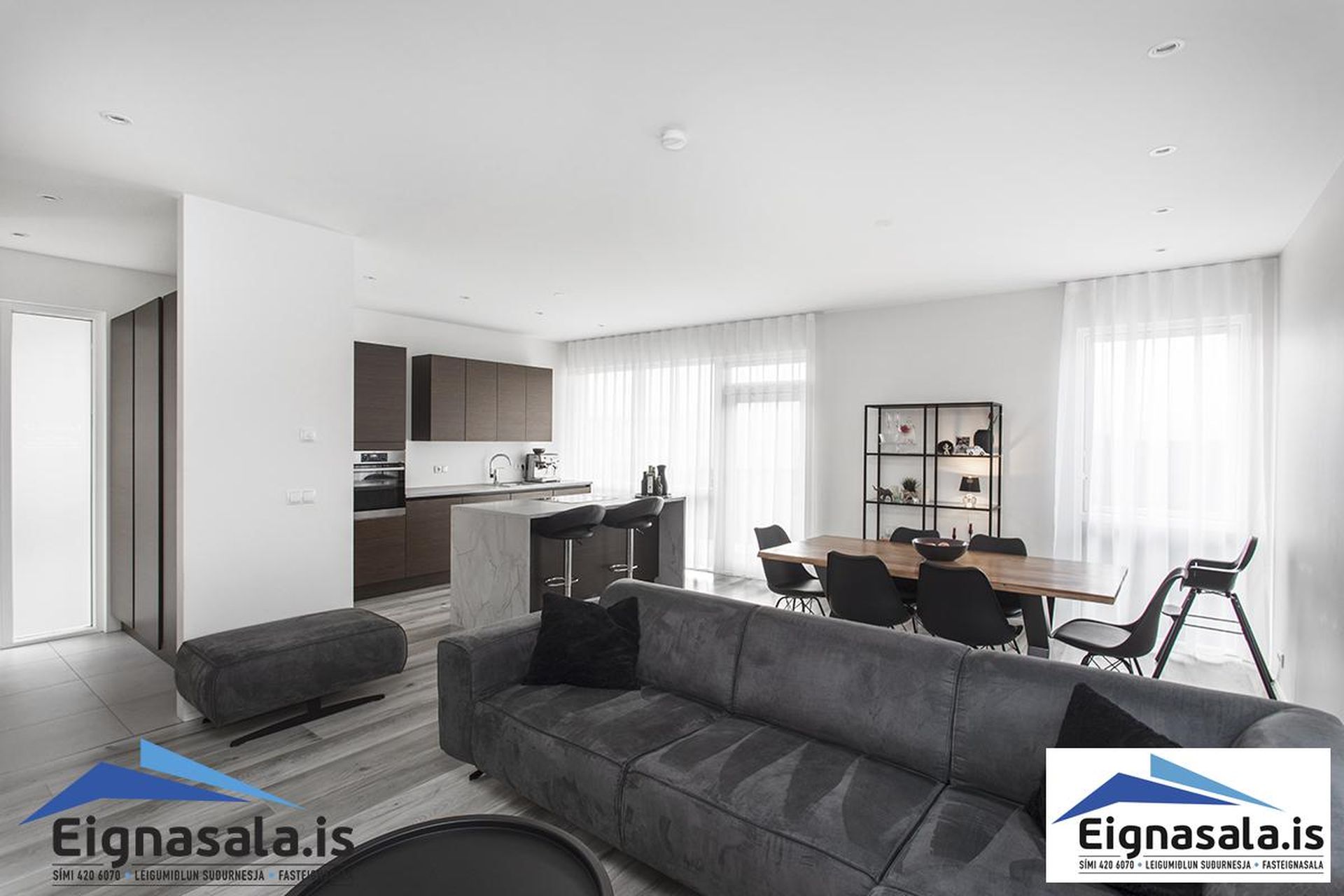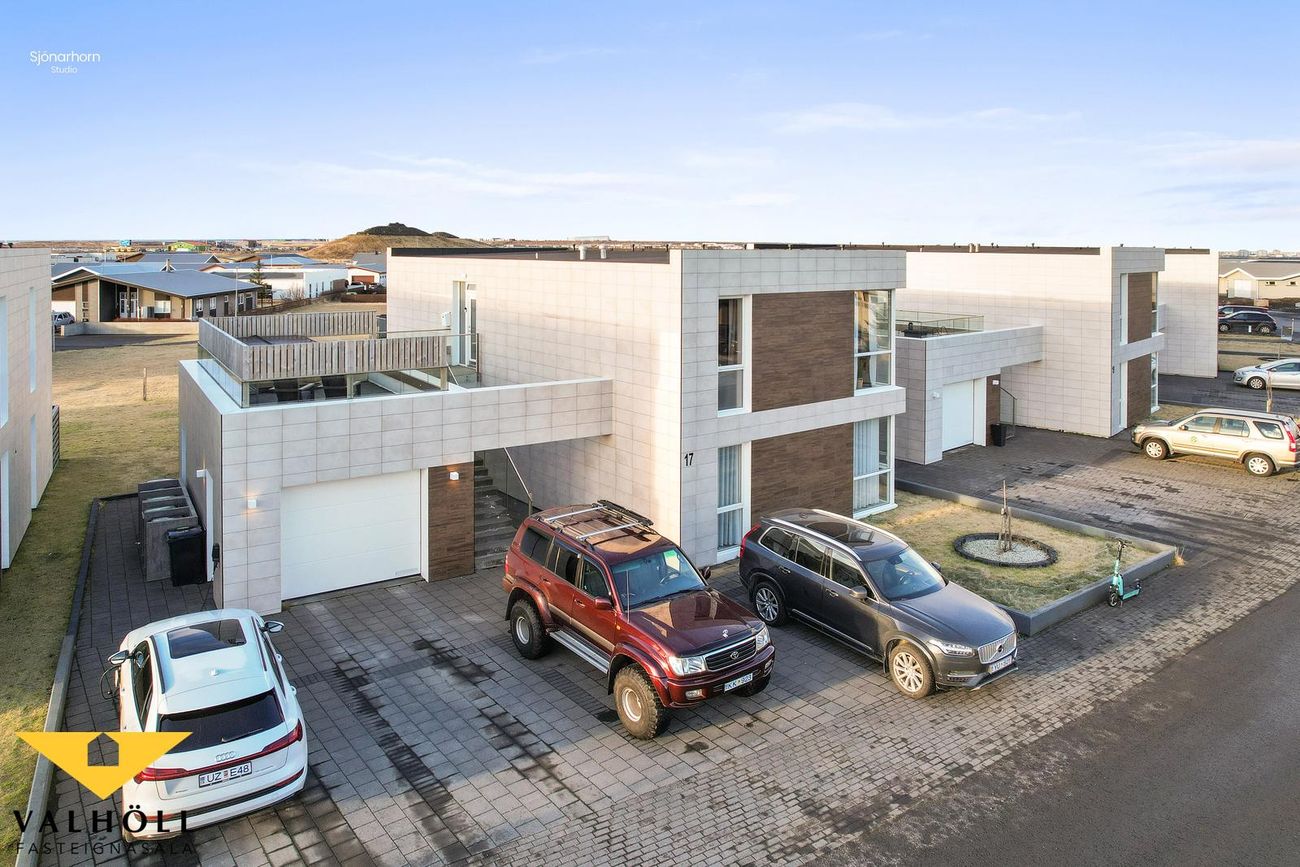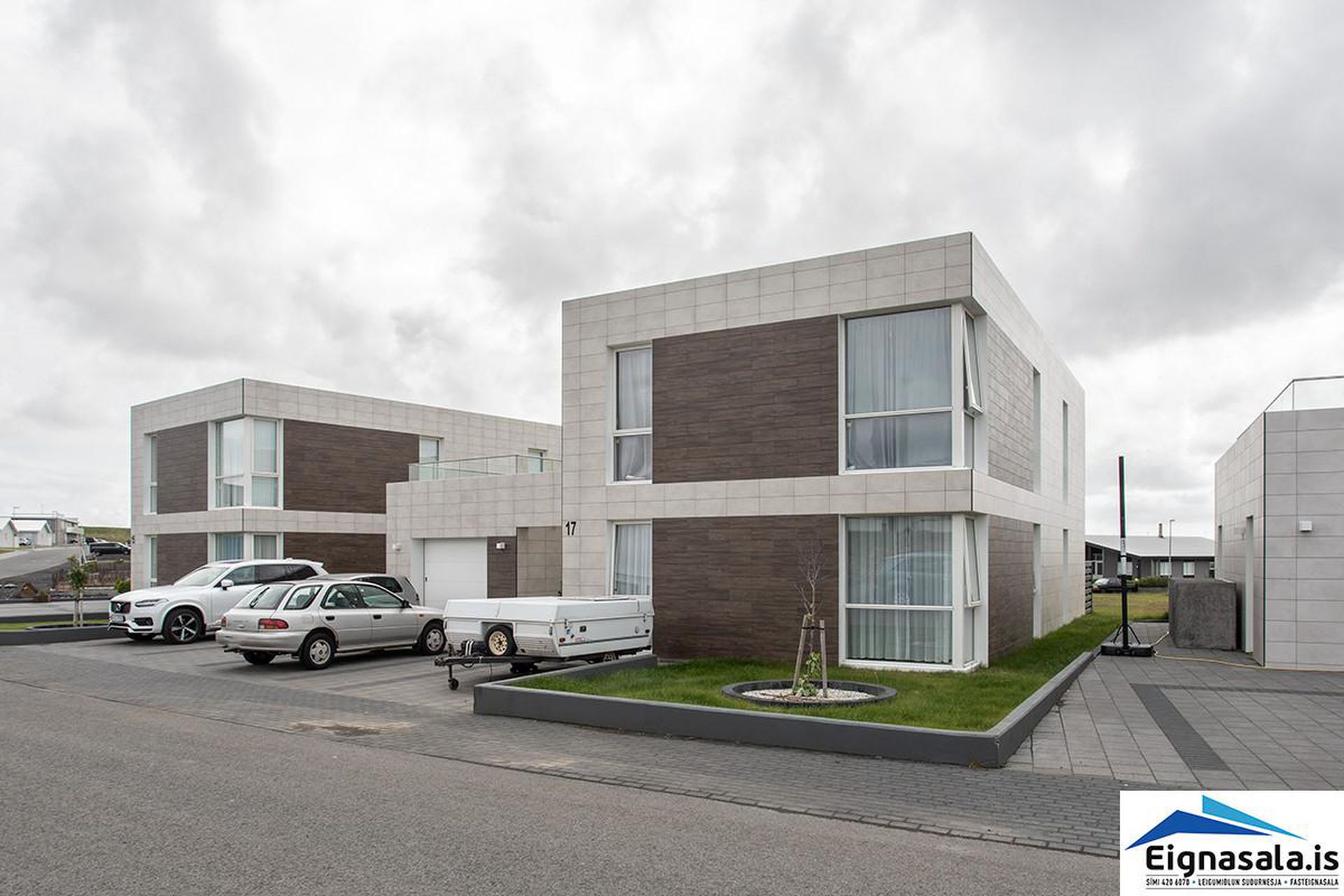 Lóð er fullfrágengin með hitalögn í gönguleið. Handrið eru úr hertu öryggisgleri.