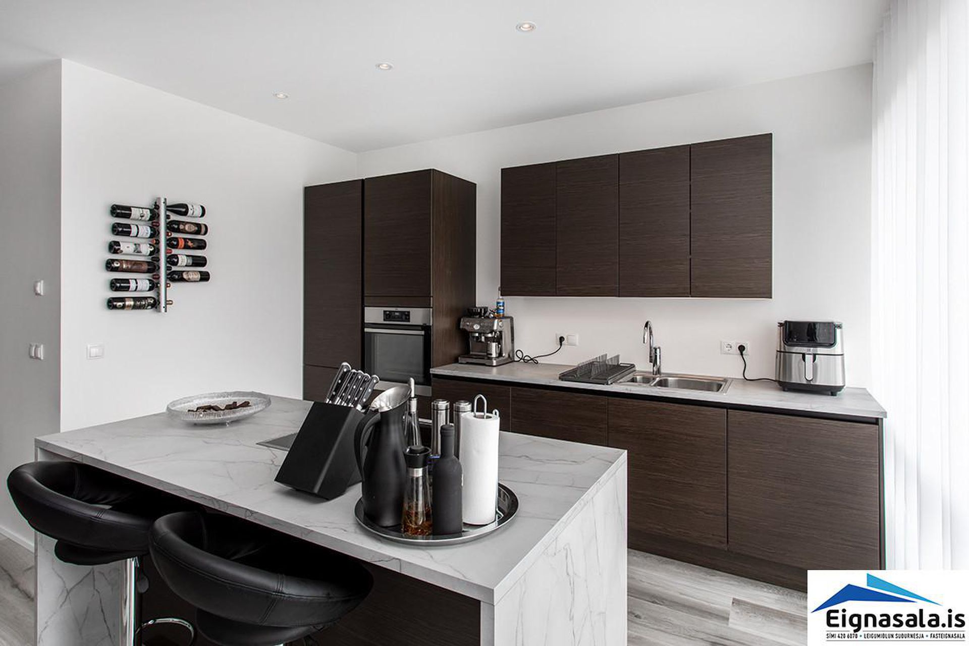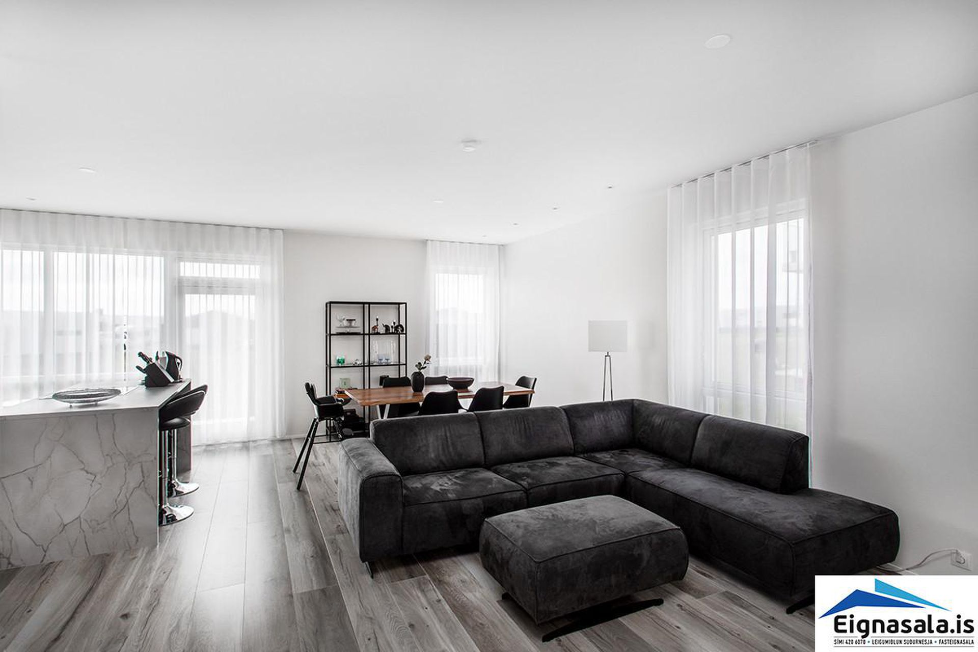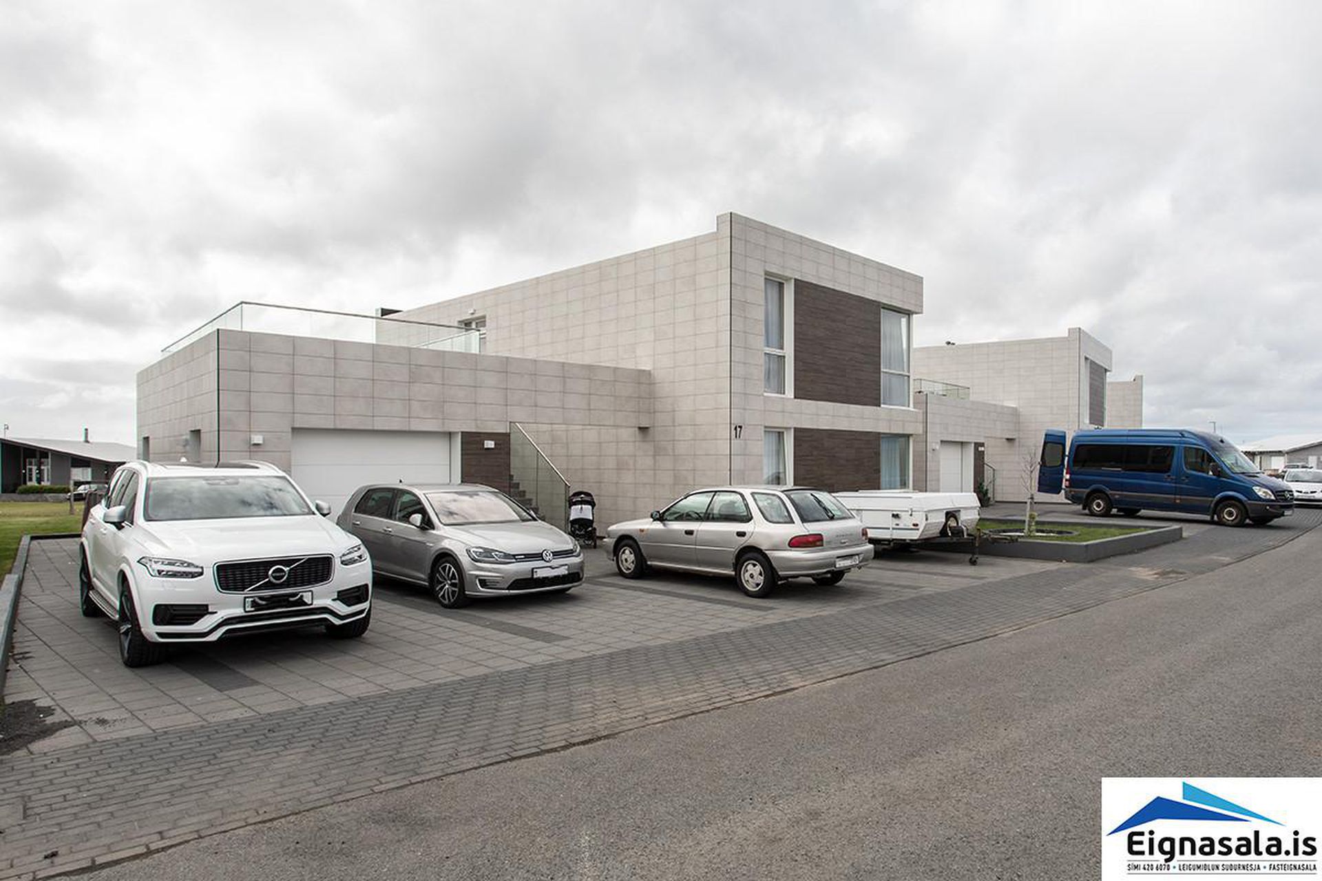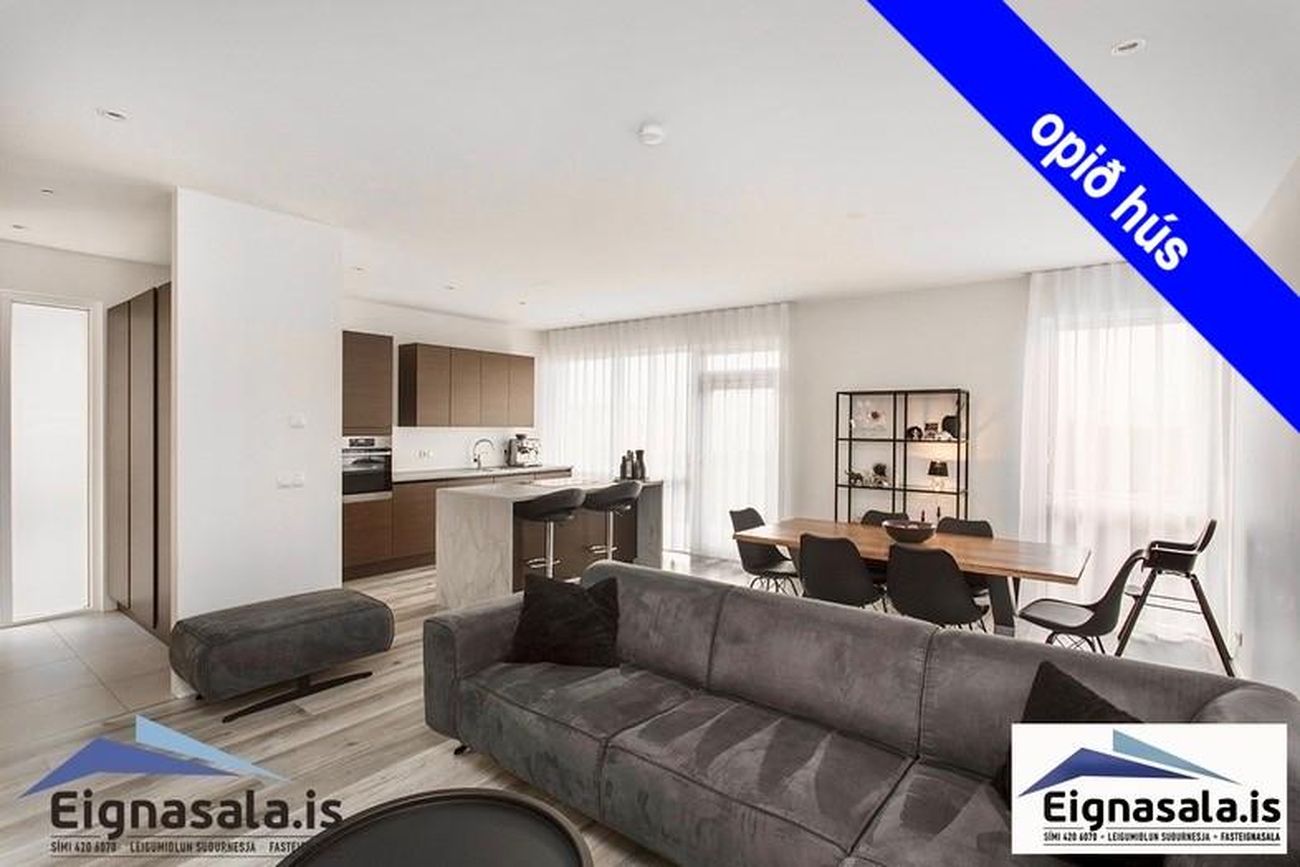 Lóð er fullfrágengin með hitalögn í gönguleið. Handrið eru úr hertu öryggisgleri.