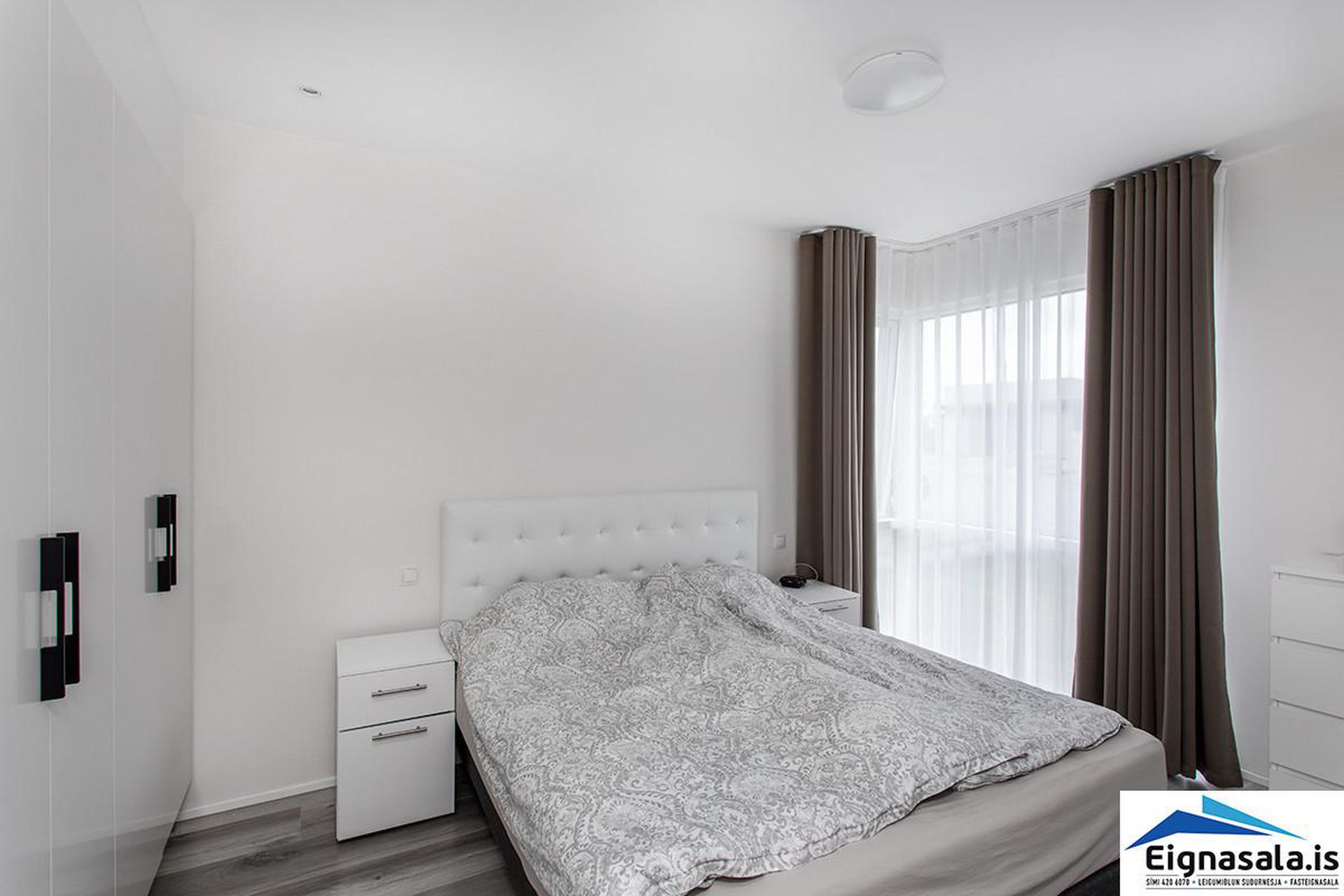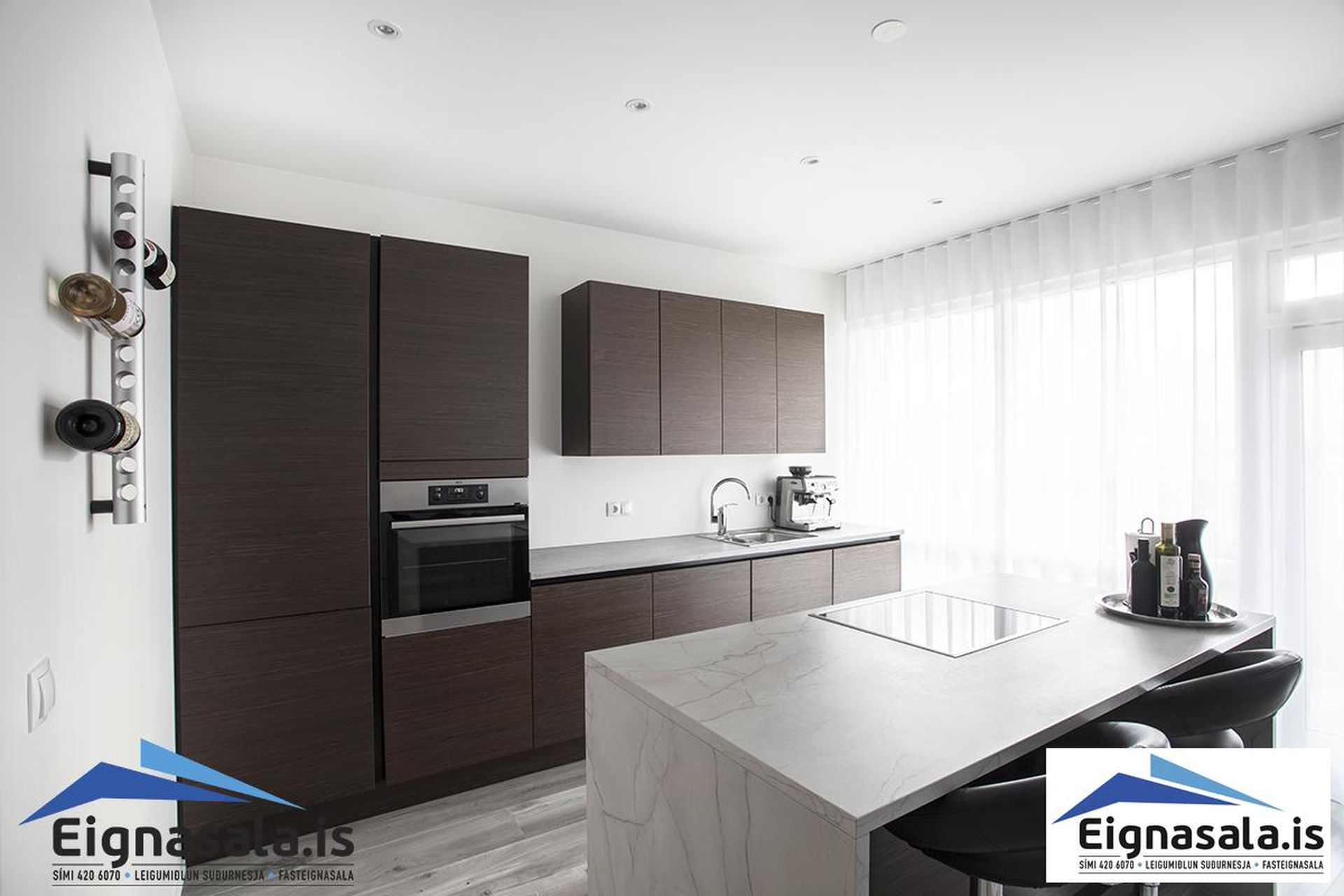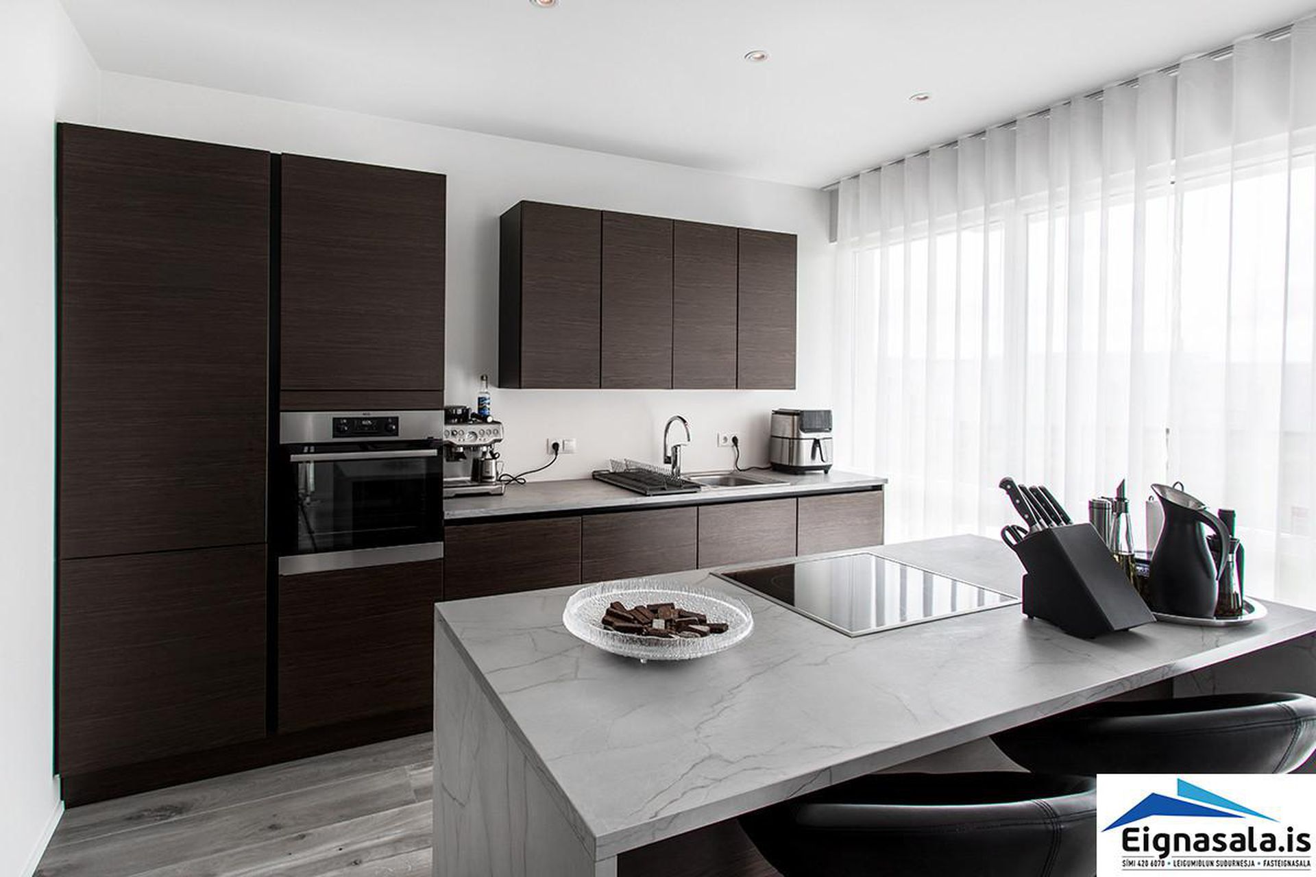 Sérsmíðaðar innréttingar eru á eldhúsi, baði og þvottahúsi sem og fataskápar og eru innréttingarnar úr reyktri eik frá Ormsson/HTH og fataskápar eru hvítir frá Ormsson/HTH. Innihurðar eru sprautulakkaðar hvítar og koma frá Birgisson. Eldhústæki sem eru bökunarofn og helluborð eru af gerðinni AEG frá Ormsson, uppþvottavél og ísskápur fylgja