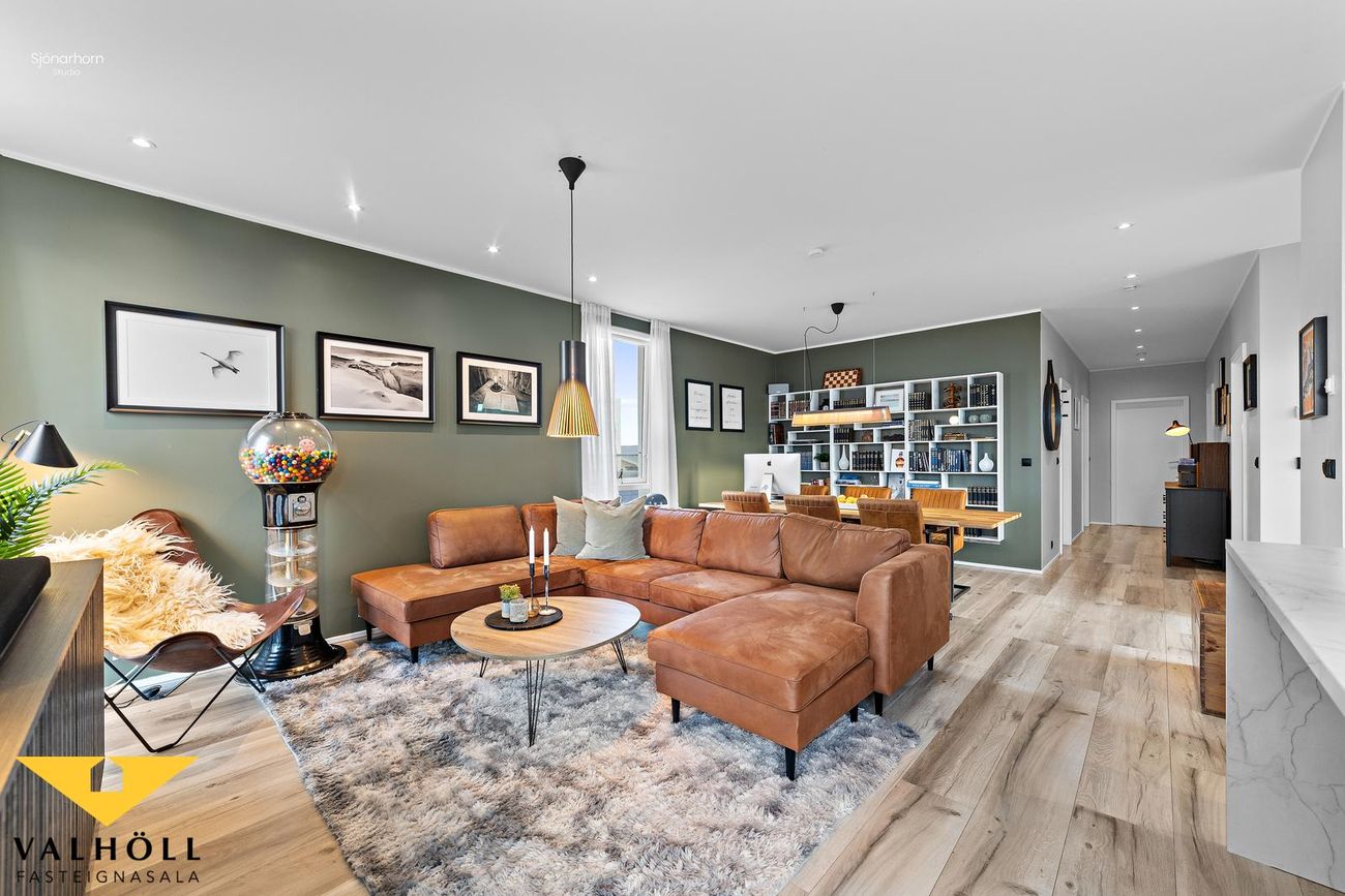 Stofa og eldhús í opnu rými við eldhús, parket á gólfi og útgengt út á svalir