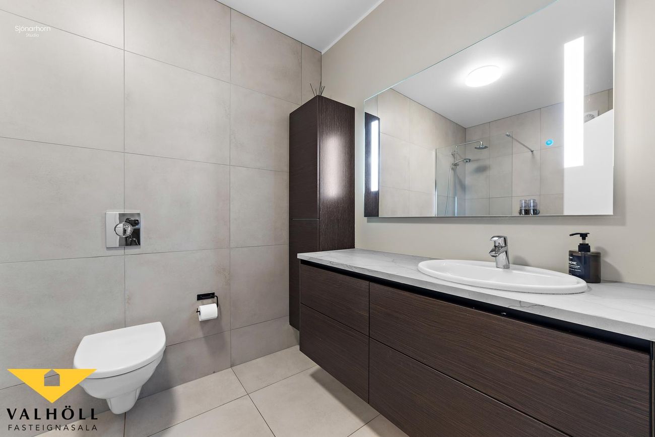 Eigininni fylgja tvö bílastæði hleðslustöð. Tæknirými er fyrir aftan bílskúr neðri hæðar.