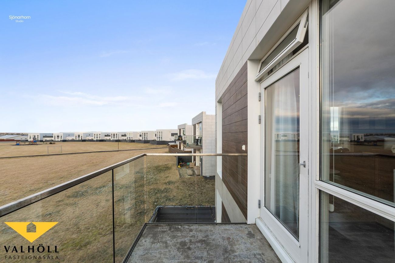 Barnaherbergin eru tvö, parketlögð með fataskápum. Gólfsíðir gluggar