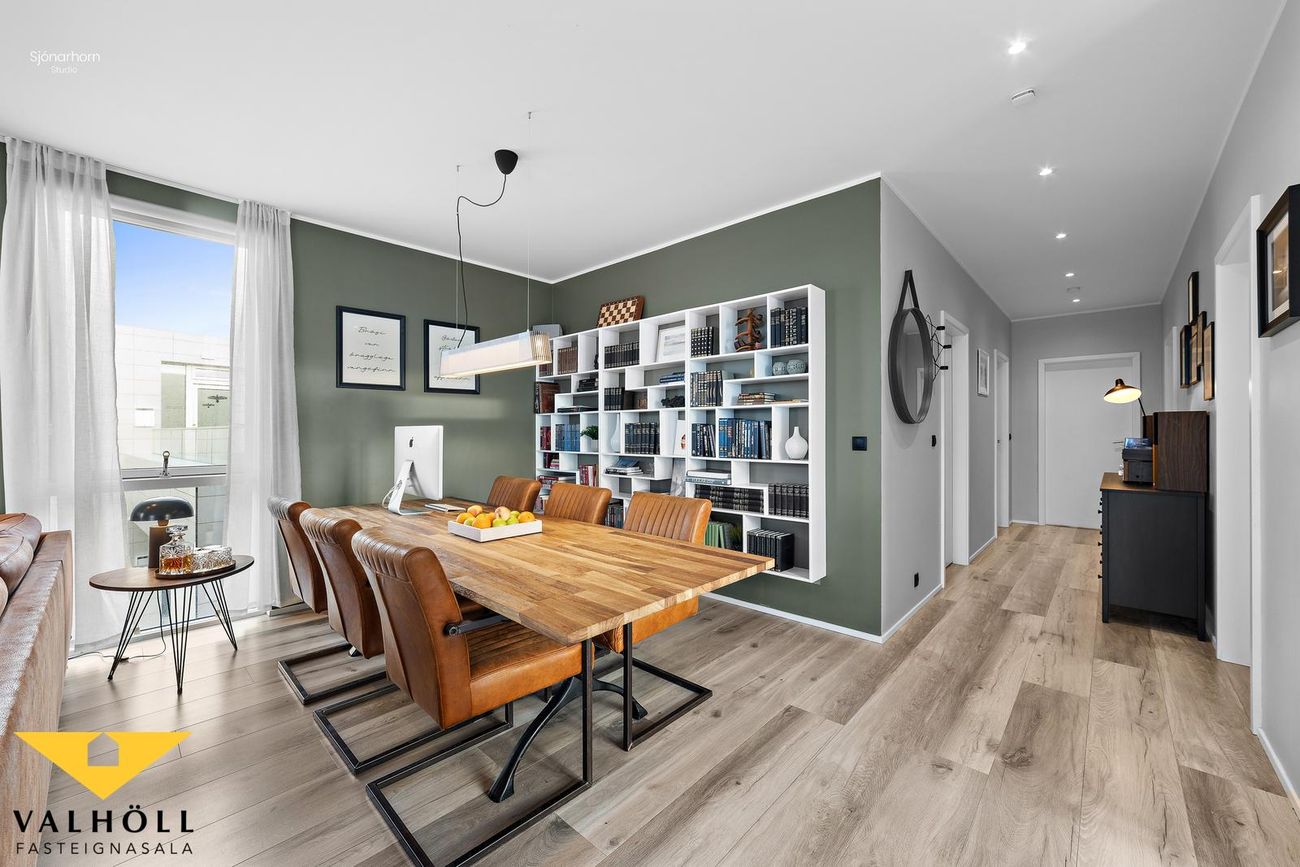Stofa og eldhús í opnu rými við eldhús, parket á gólfi og útgengt út á svalir