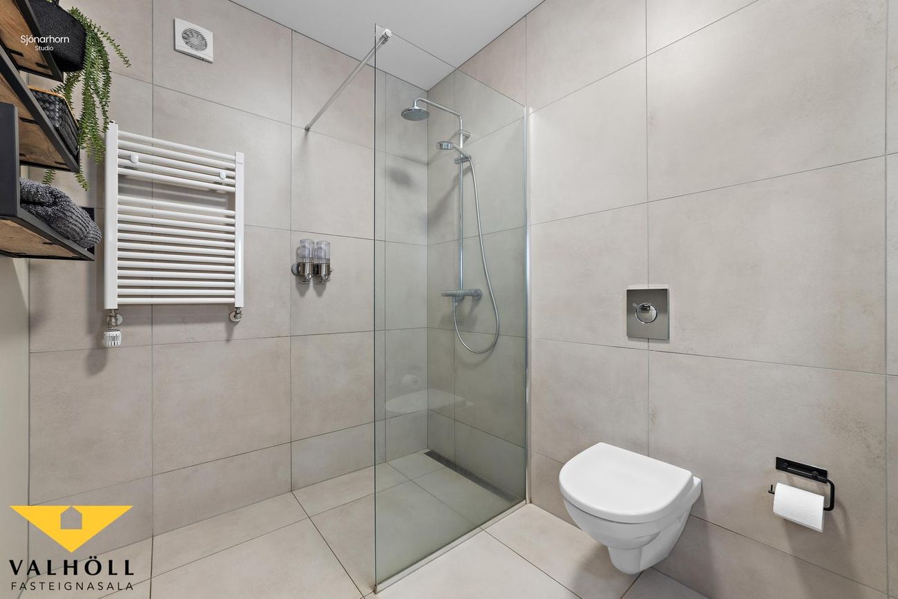Baðherbergi flísalagt með upphengdu salerni, walk in sturtu og góðri innréttingu