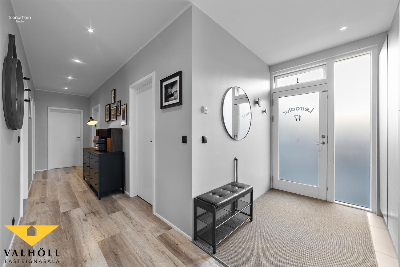 Valhöll fasteignasala og Gylfi Þór löggiltur fasteignasali sími 7704040 kynna í einkasölu eignina Leirdalur 17, Fjögurra herbergja 109,5m2 efri sérhæð með stórri verönd ásamt heitum pott. Vel skipulögð og viðhaldslítið ytrabyrgði.Gengið frá hellulögðu bílastæði upp steyptan stiga, þar er rúmgóður sérafnota sólpallur með rafmagnspotti sem fylgir kaupum. Eigandi hefur látið teikna upp einskonar spa og geta teikningar fylgt kaupum á eigninni. Eignin skiptist í forstofu, hol, stofa og borðstofa opið við eldhús. Herbergjagangur með baðherbergi, þvottahúsi hjónaherbergi og tvö barnaherbergi