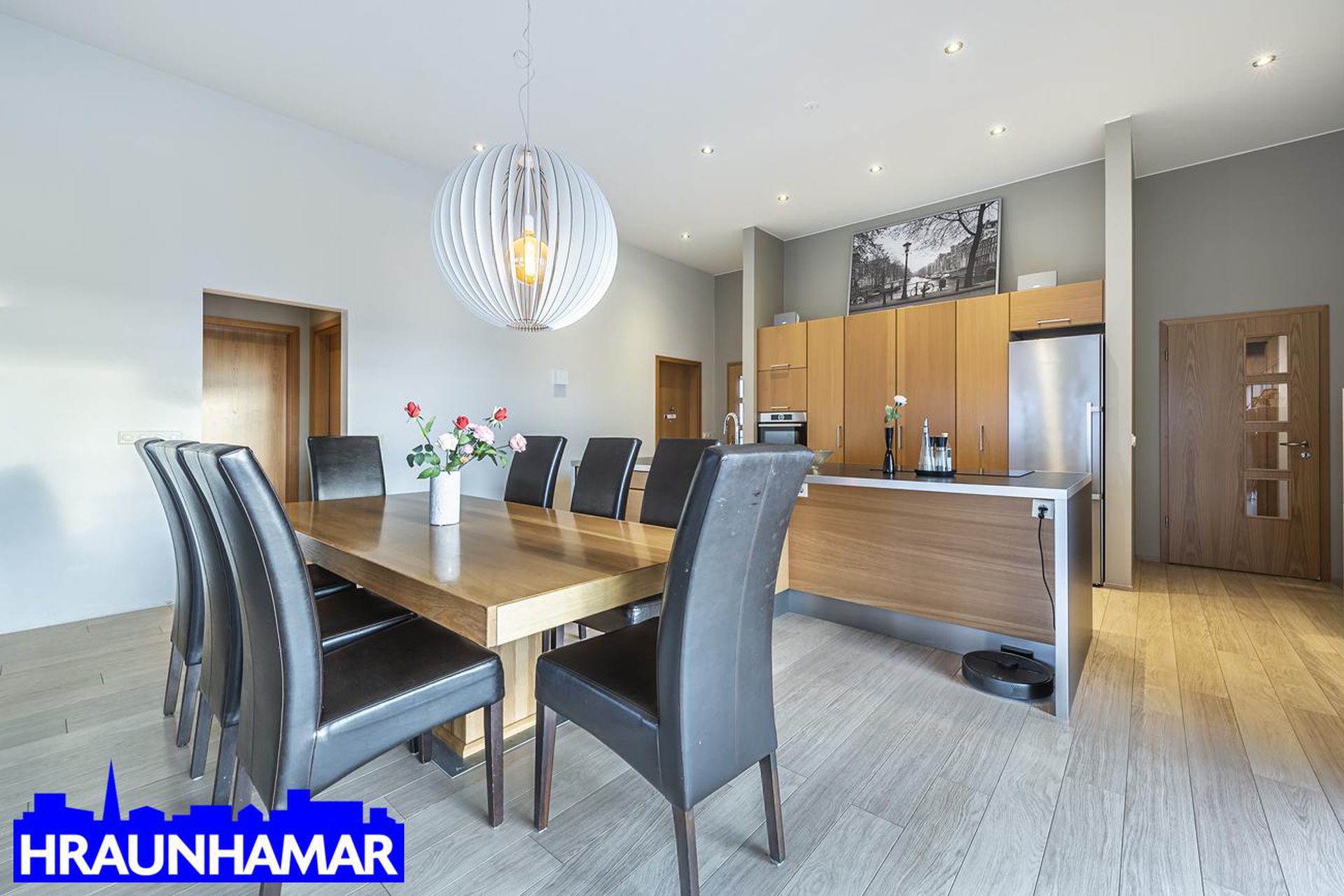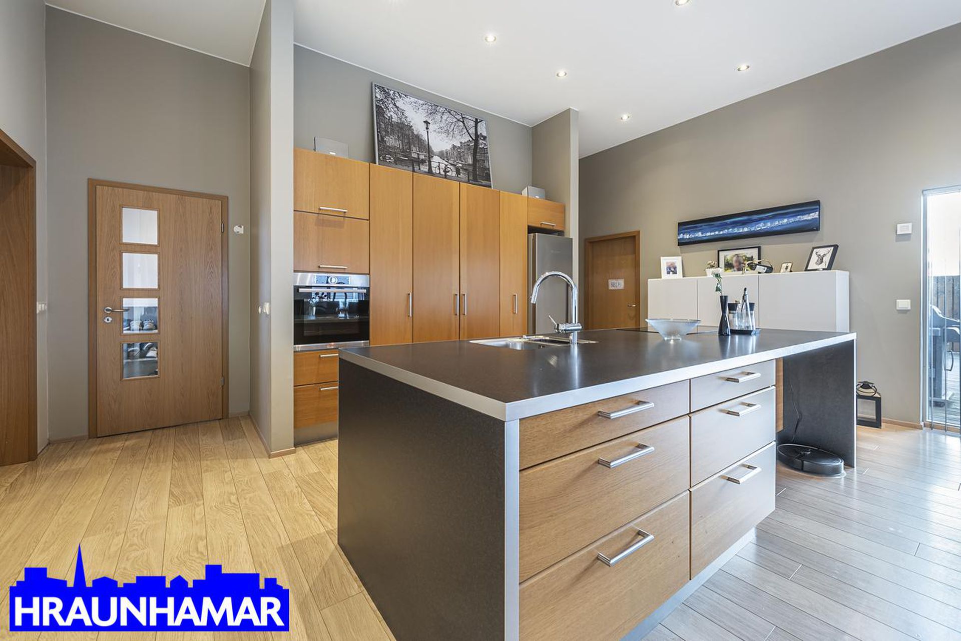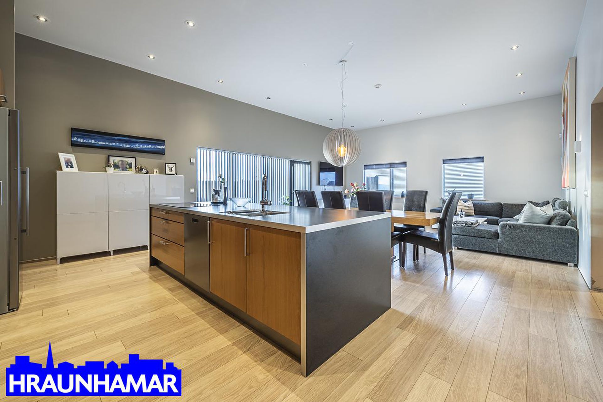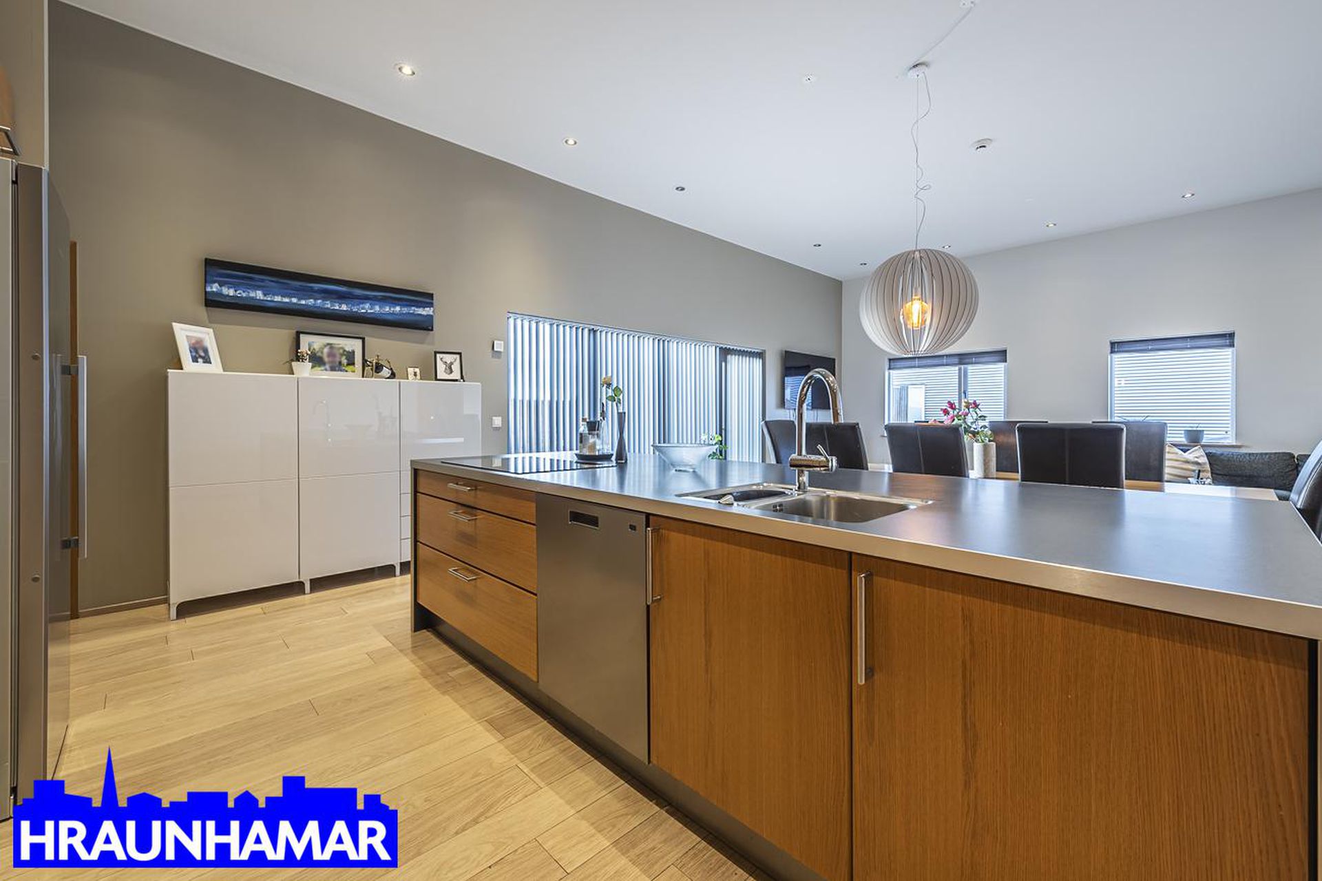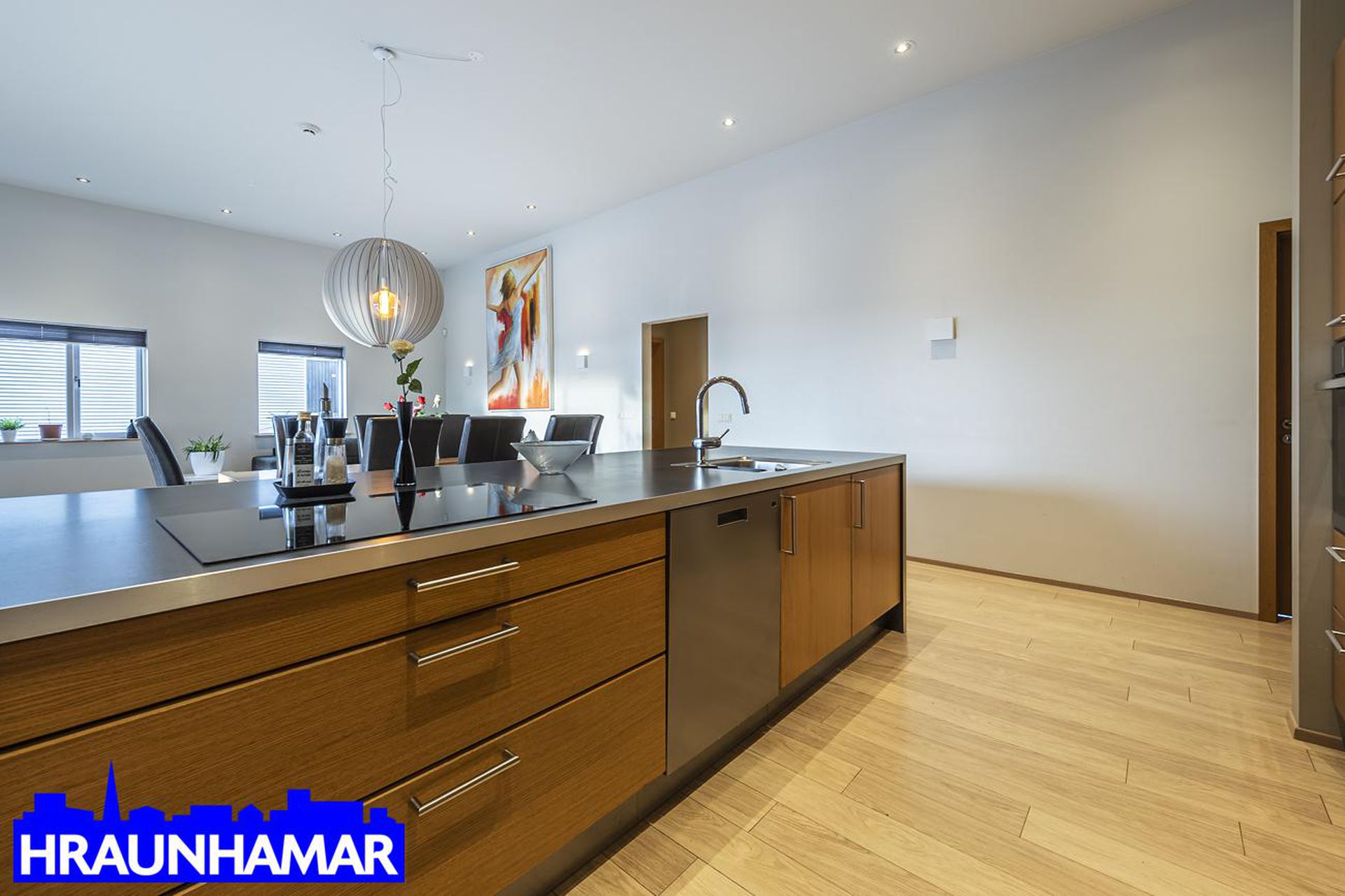 Eldhús, borðstofa, og rúmgóð stofan eru í opnu rými með hárri lofthæð. Eldhúsið er mjög