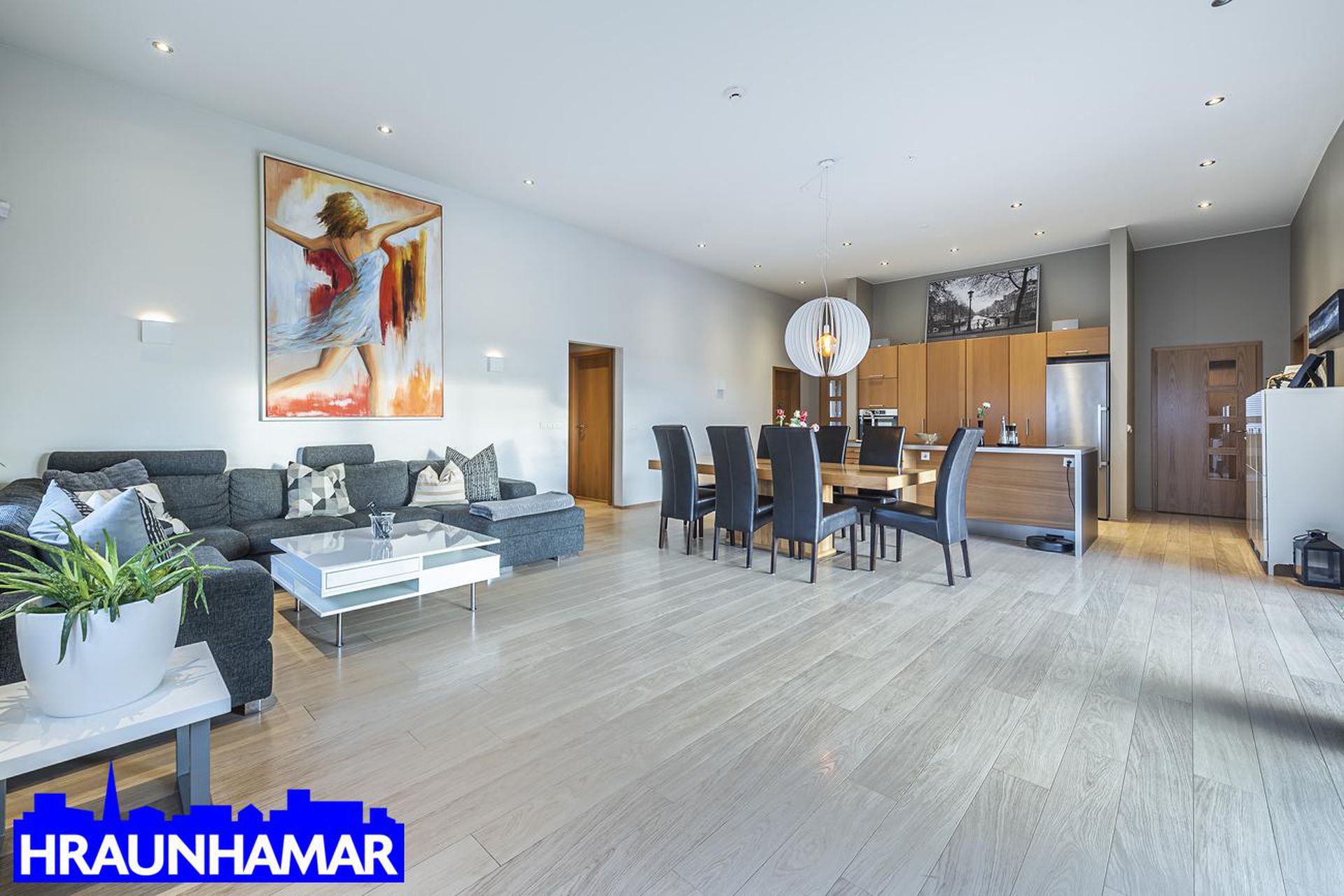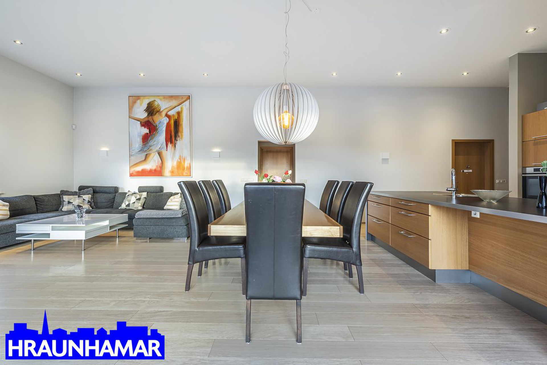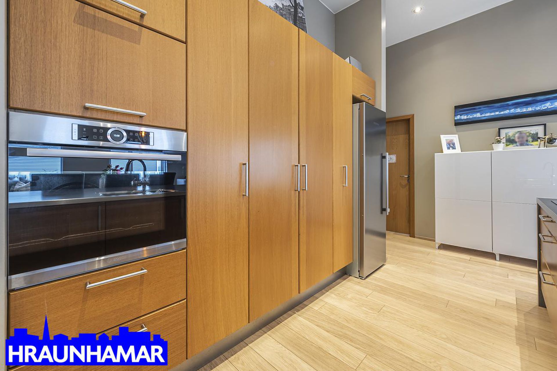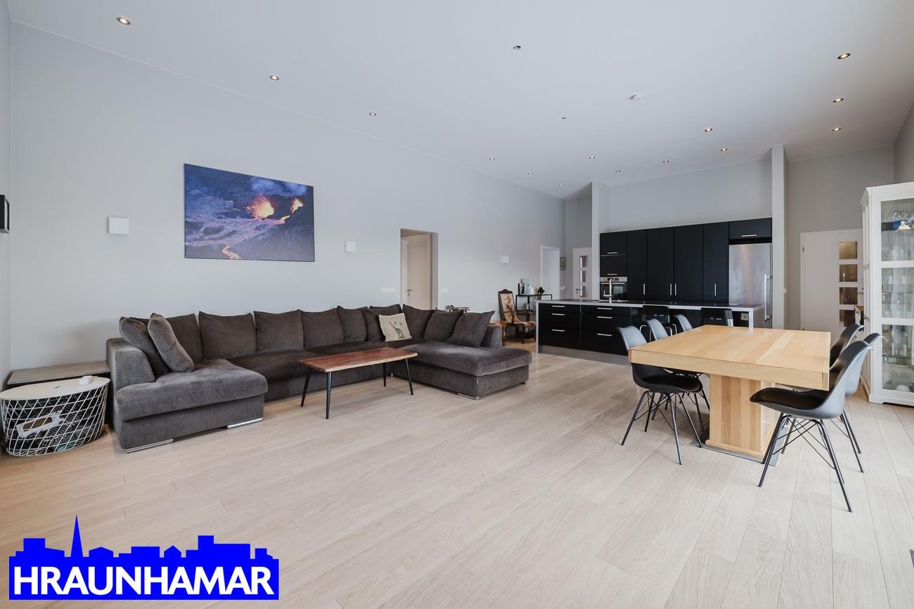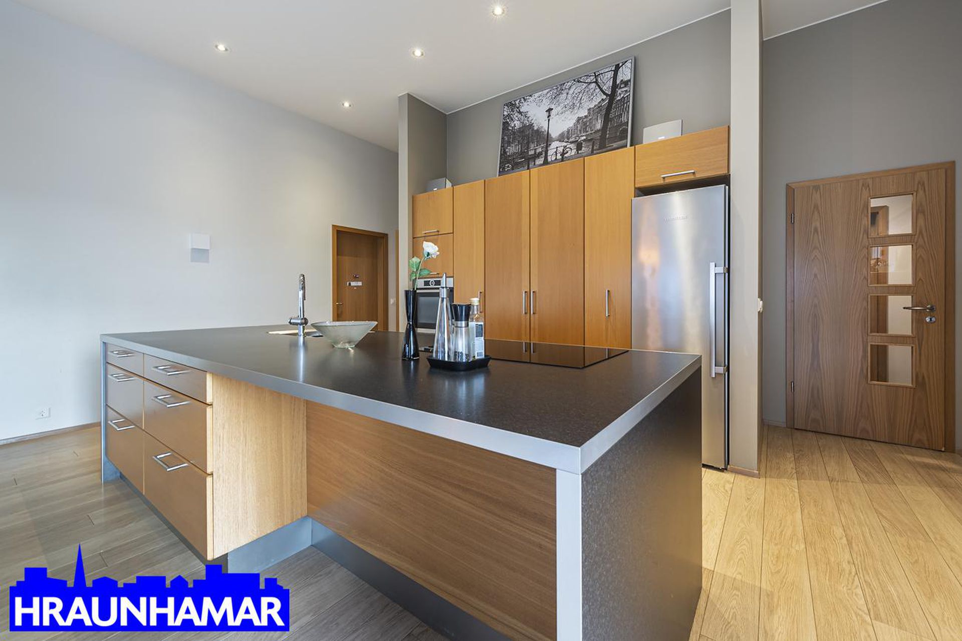 Eldhús, borðstofa, og rúmgóð stofan eru í opnu rými með hárri lofthæð. Eldhúsið er mjög