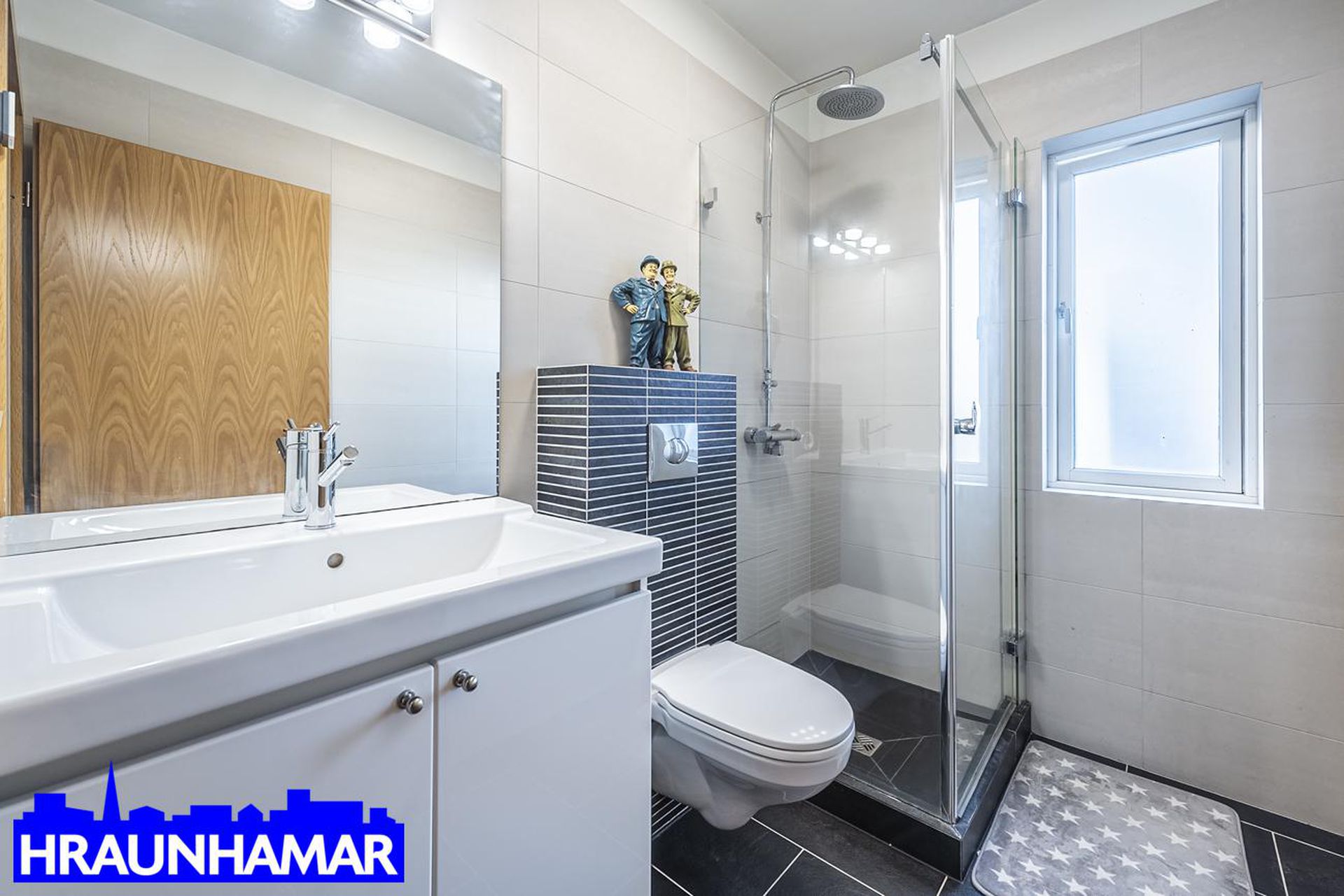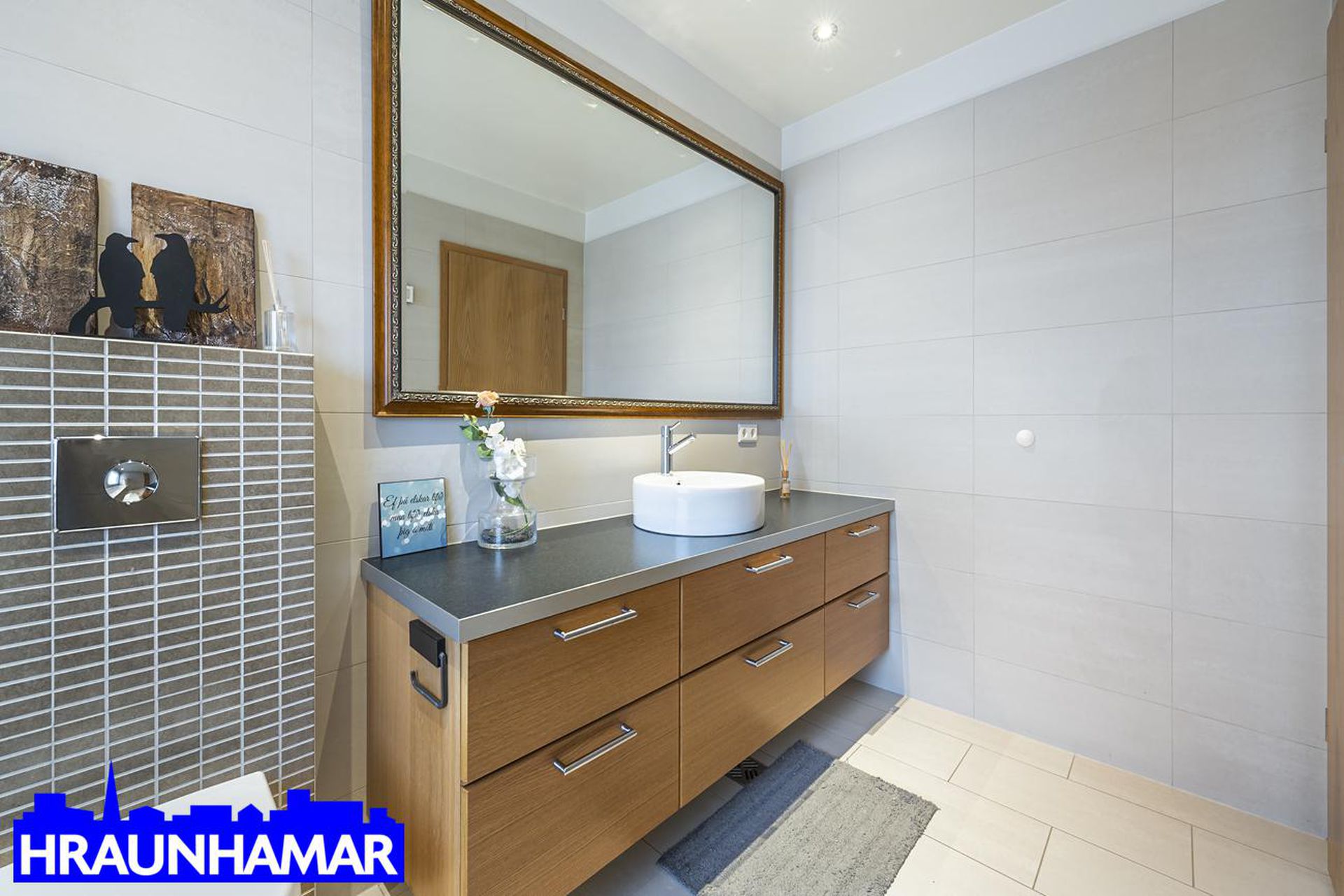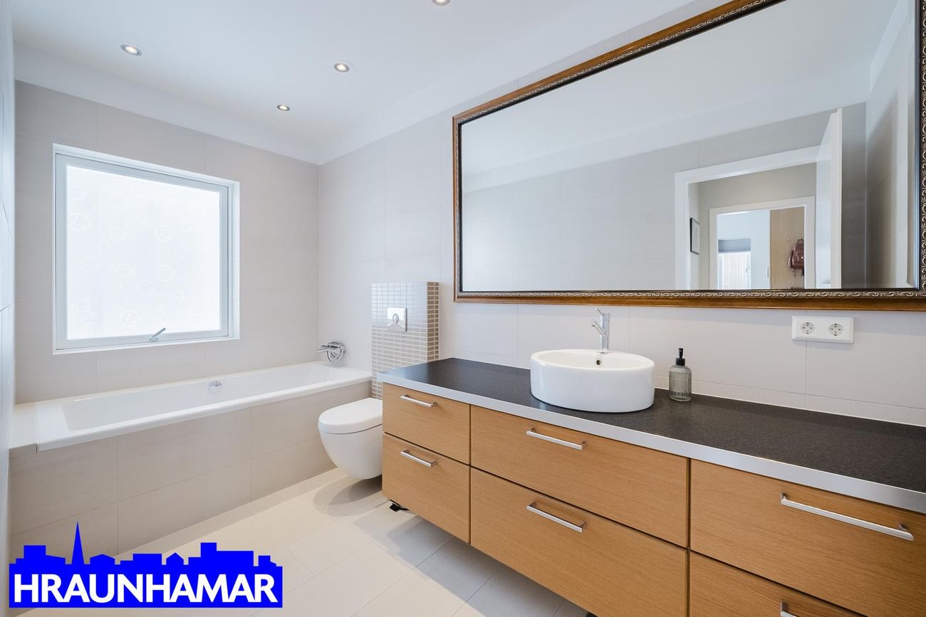 Mjög fallegt baðherbergi með upphangandi salerni og vandaðri eikar innréttingu, baðkar, flísar. Síðan er
