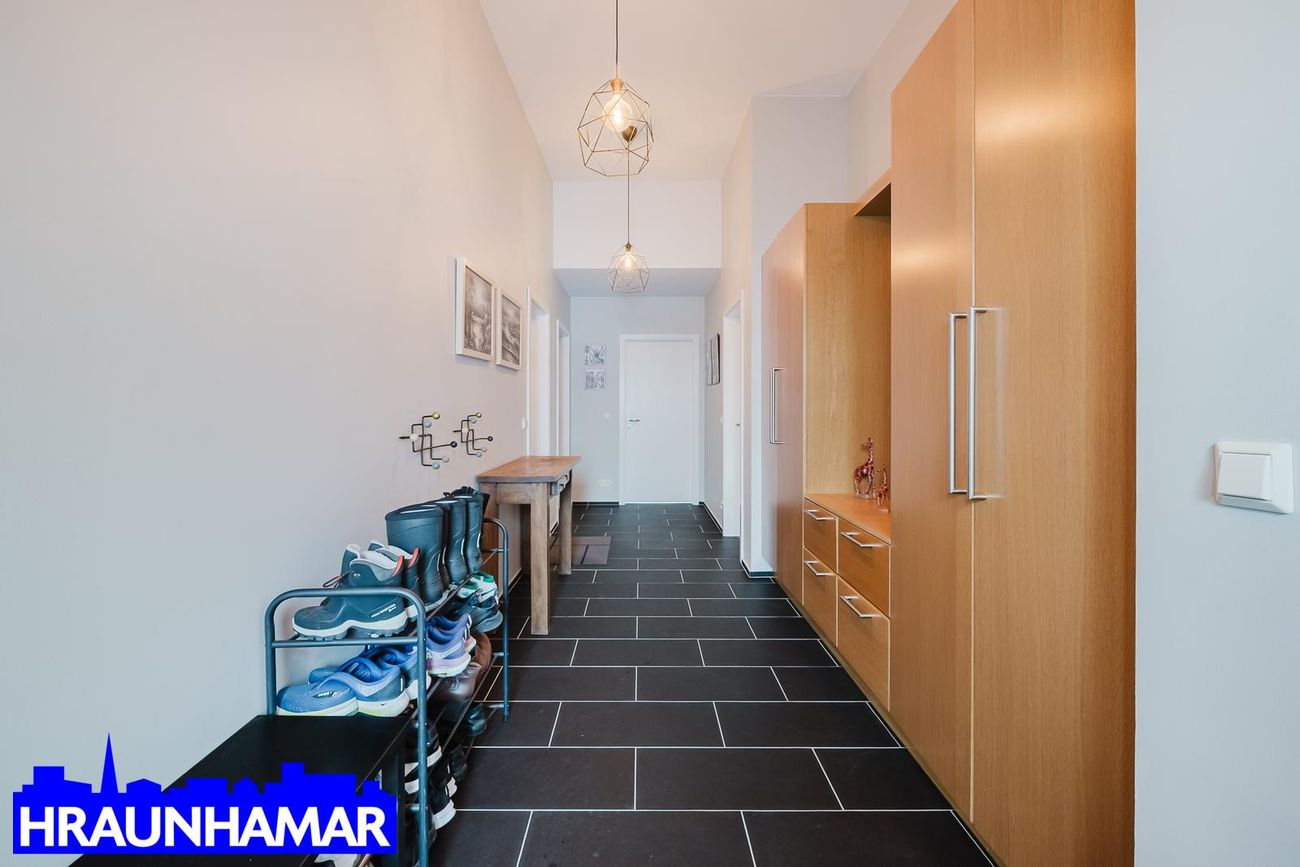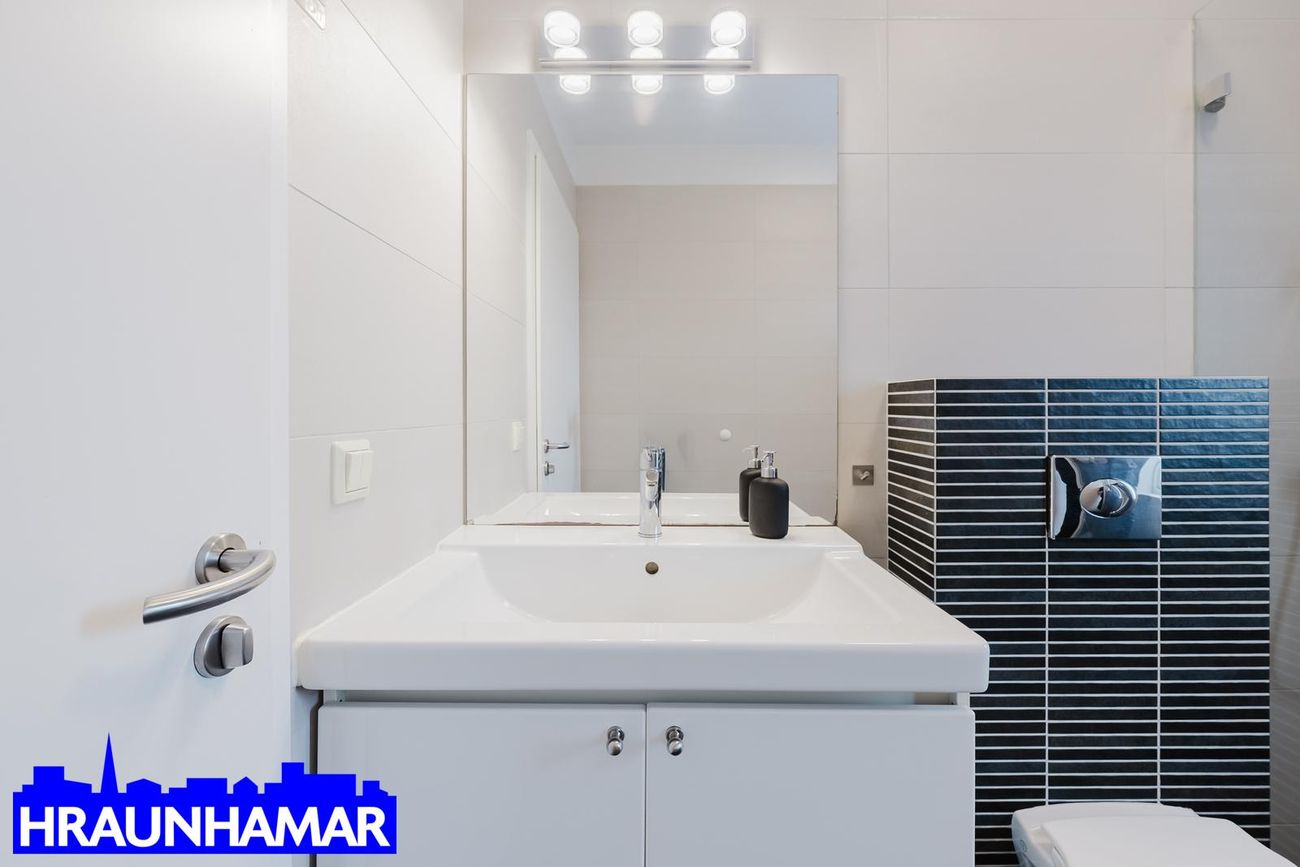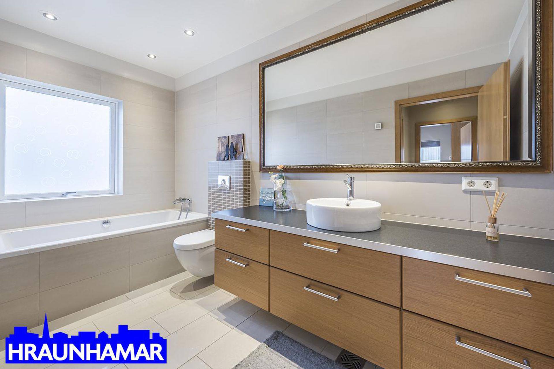 Mjög fallegt baðherbergi með upphangandi salerni og vandaðri eikar innréttingu, baðkar, flísar. Síðan er