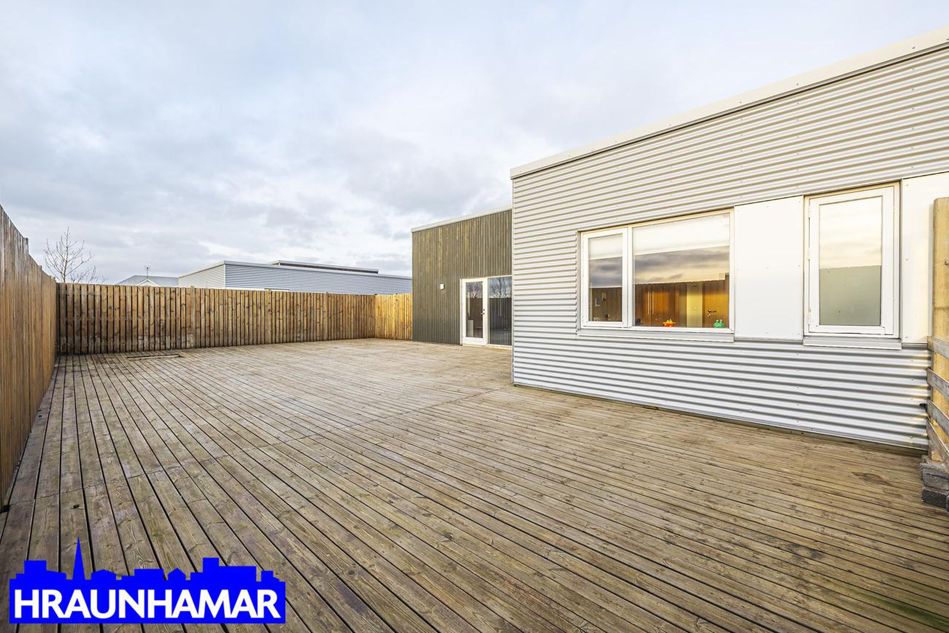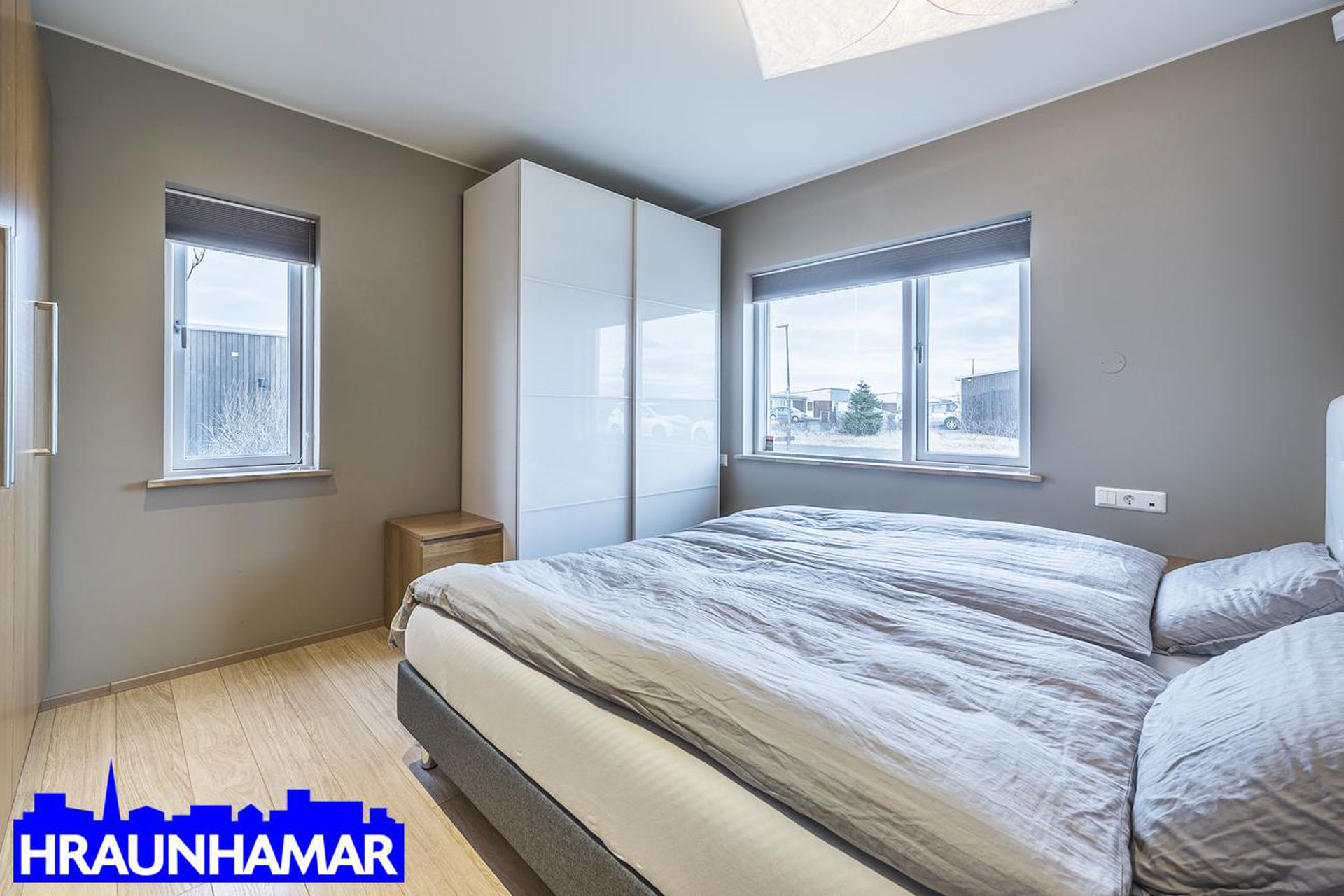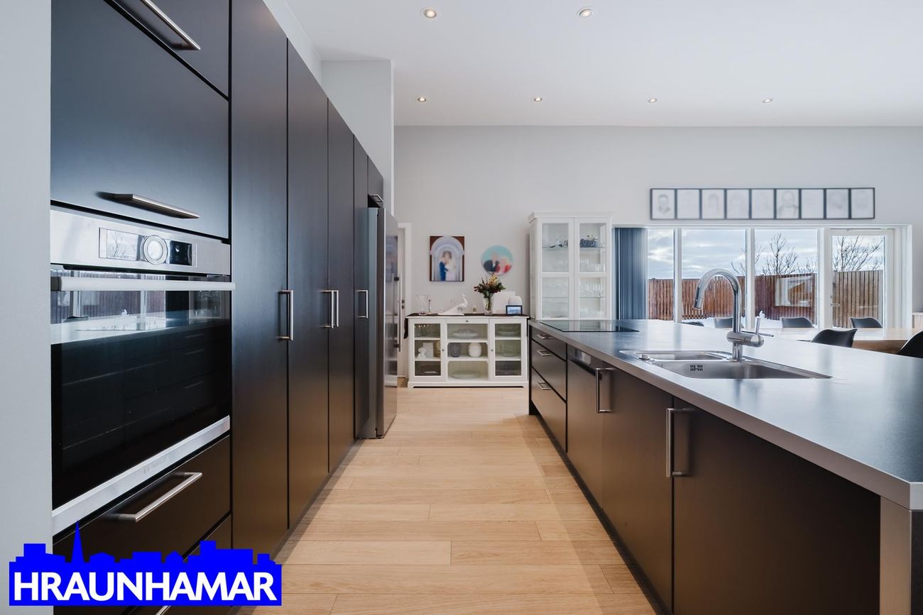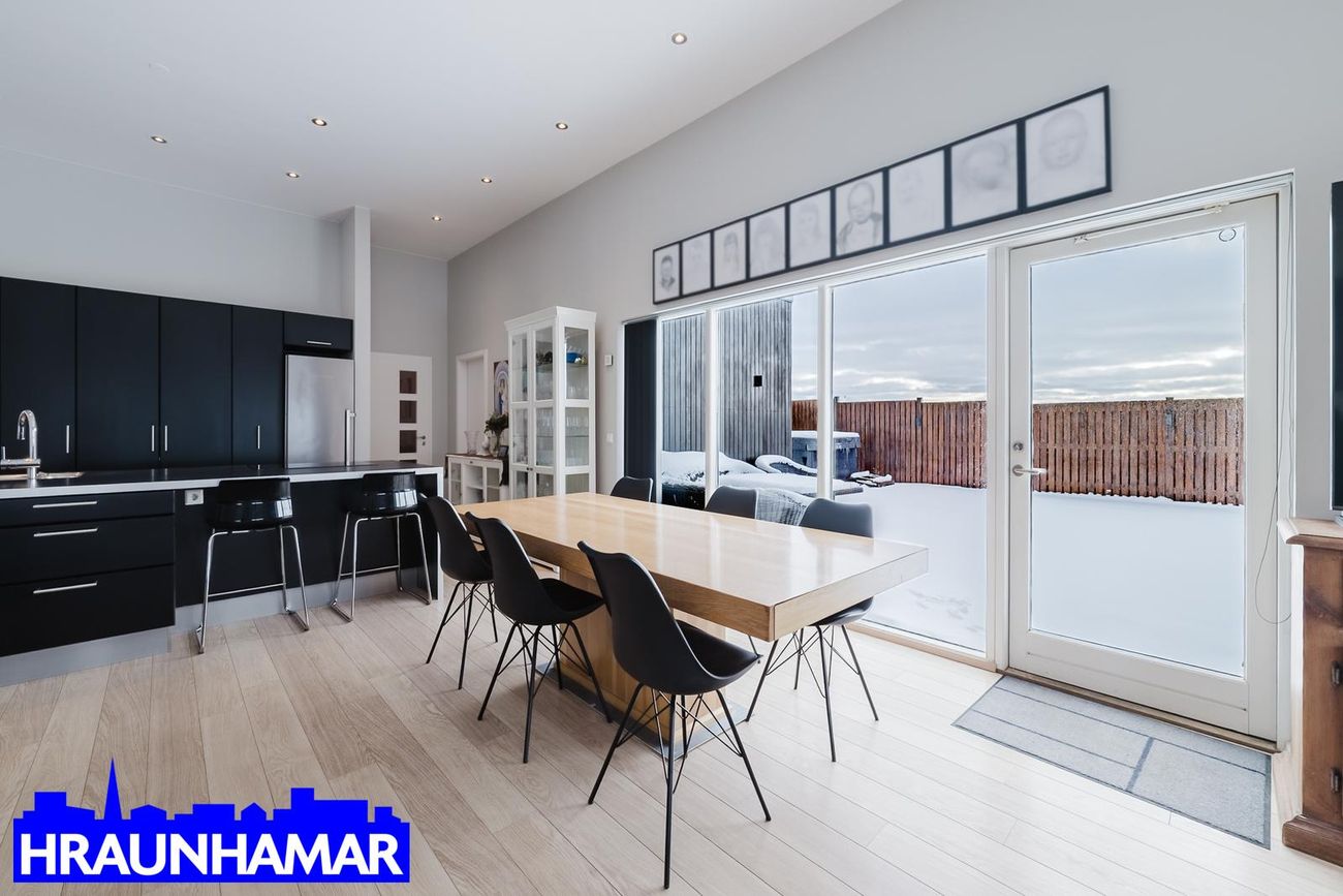 Mikil lofthæð er í húsinu og stórir gluggar. Fjögur til fimm svefnherbergi ofl. Pallur afgirtur í suður er óvenju stór. Allar innréttingar eru sérsmíðaðar frá HTH ehf (ljós eik). Hiti í gólfum. Nýlegt þráðlaust danfoss hitakerfi. Nýleg led lýsing.
