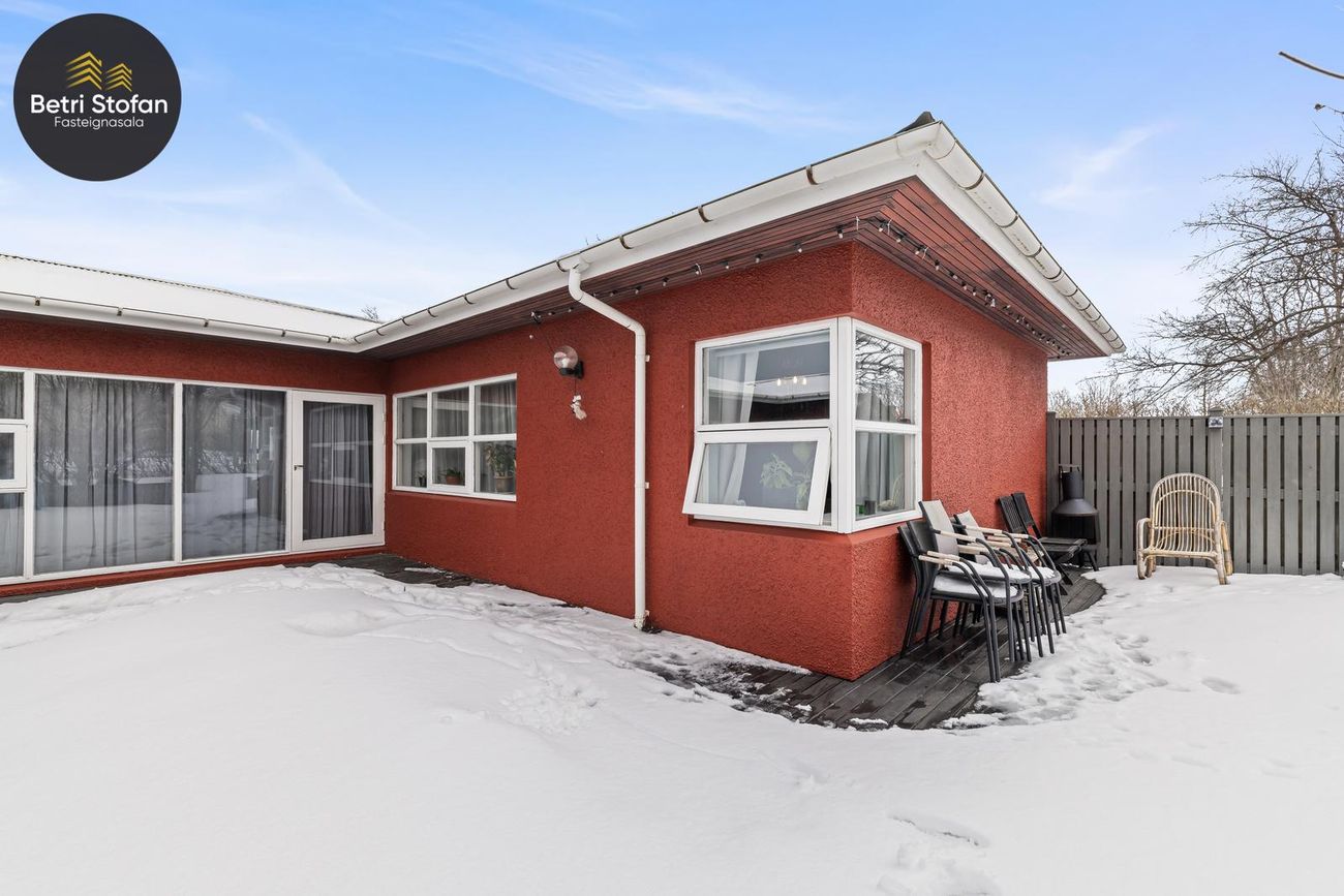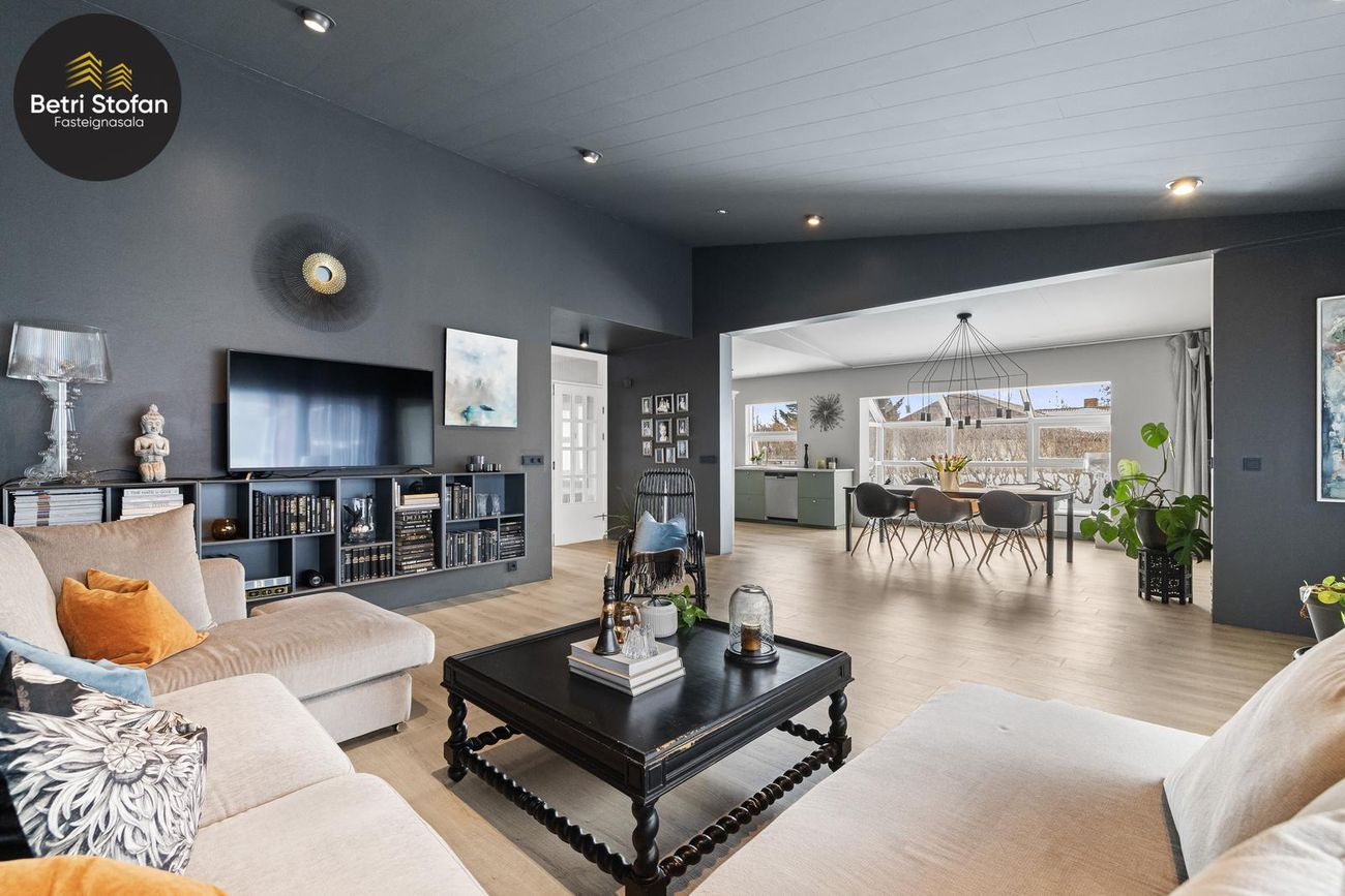 Afar gott skipulag þar sem komið er inn í rúmgóða flísalagða forstofu með fataskápum. Innaf forstofu er gengið inn í eitt svefnherbergjana ásamt gestasalerni og þvottahús. Úr þvottahúsi er innangengt í bílskúr. Úr forstofu er komið inn í afar fallegt og opið stofurými. Stofurýmið er einstaklega fallegt, opið og bjart, með mikilli lofthæð og gólfsíðum gluggum. Úr stofu er gengið út í bakgarð hússins, út á um 60fm viðarverönd. Stofa er opin við borðstofu og eldhús. Afar gott flæði á milli rýma. Útfrá stofu er herbergjagangur þar sem gengið er í 2 svefnherbergi og baðherbergi.Framkvæmdir síðustu ára: