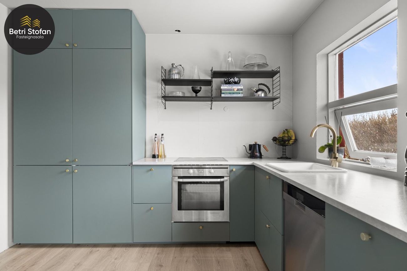 Eldhús: Falleg inrrétting með innbyggðum ískáp, vask, ofni og spanhelluborði. Aðstaða fyrir uppþvottavél. Endurnýjað 2024. Góð tenging við borðstofu og stofu.