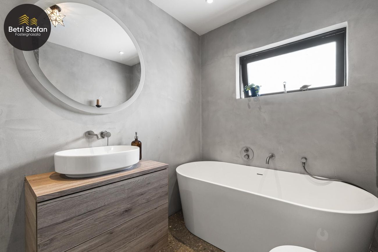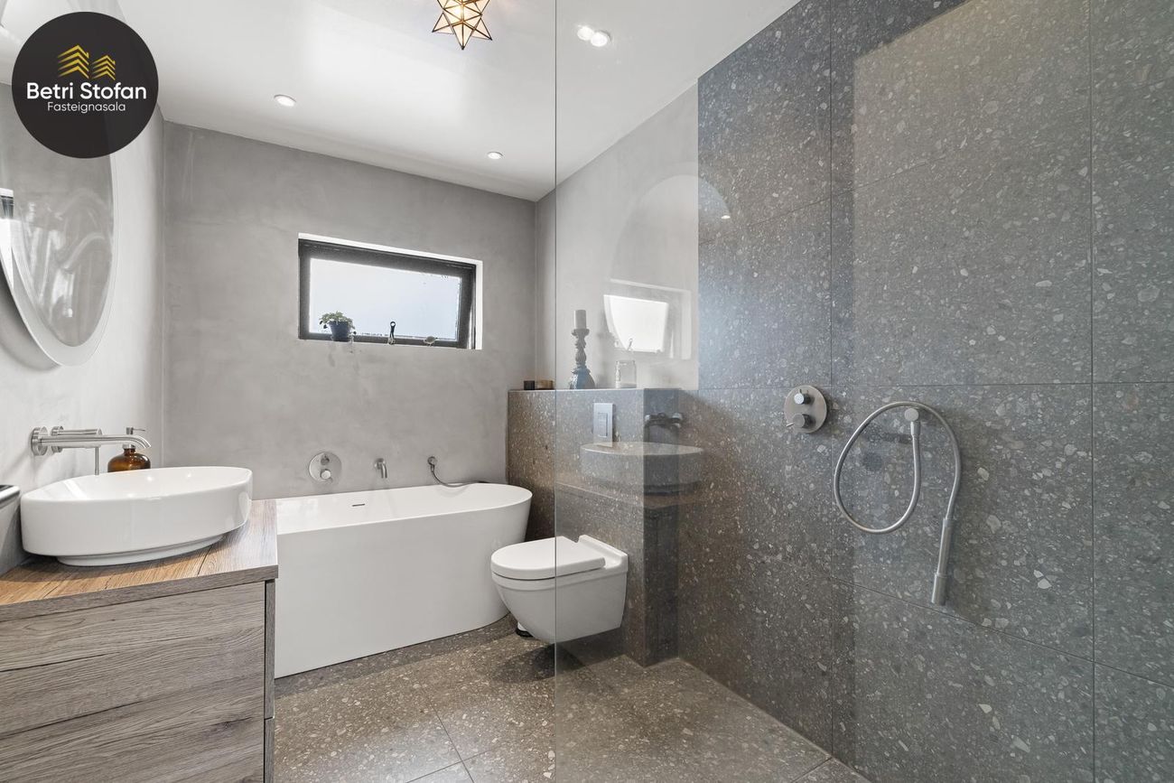 Baðherbergi: Standsett árið 2021 á afar vandaðan og smekklegan máta. "Walk in" sturta með innbyggðum blöndunartækjum og glervegg. frístandandi baðkar með innbyggðum blöndunartækjum. Baðinnrétting með skúffum, fallegum borðvask, innbyggðum blöndunartækjum og stórum fallegum hringlaga spegli með innbyggðri lýsingu fyrir ofan vask.