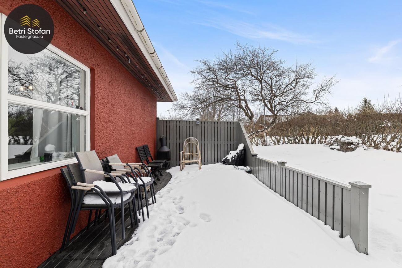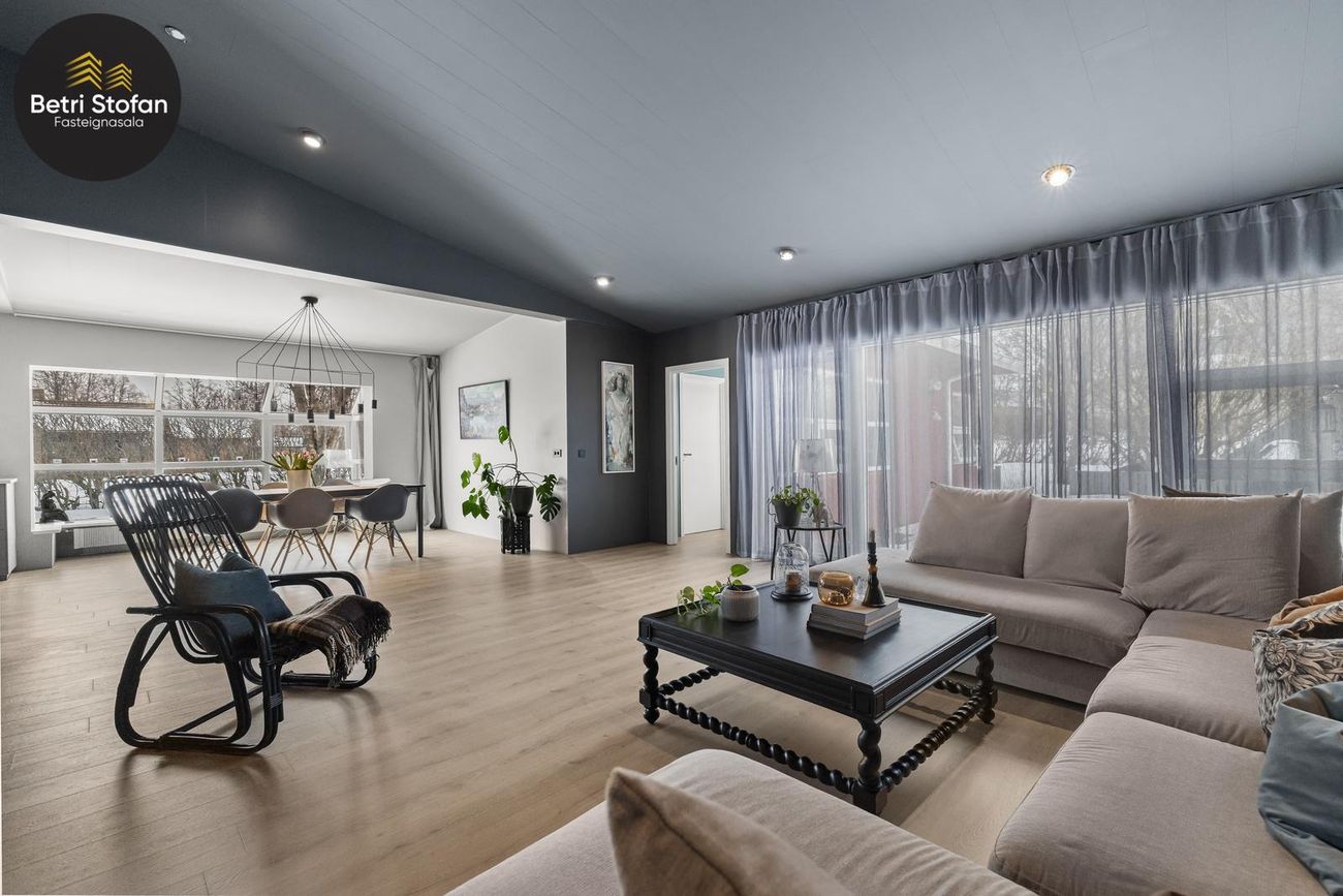 Afar gott skipulag þar sem komið er inn í rúmgóða flísalagða forstofu með fataskápum. Innaf forstofu er gengið inn í eitt svefnherbergjana ásamt gestasalerni og þvottahús. Úr þvottahúsi er innangengt í bílskúr. Úr forstofu er komið inn í afar fallegt og opið stofurými. Stofurýmið er einstaklega fallegt, opið og bjart, með mikilli lofthæð og gólfsíðum gluggum. Úr stofu er gengið út í bakgarð hússins, út á um 60fm viðarverönd. Stofa er opin við borðstofu og eldhús. Afar gott flæði á milli rýma. Útfrá stofu er herbergjagangur þar sem gengið er í 2 svefnherbergi og baðherbergi.Framkvæmdir síðustu ára: