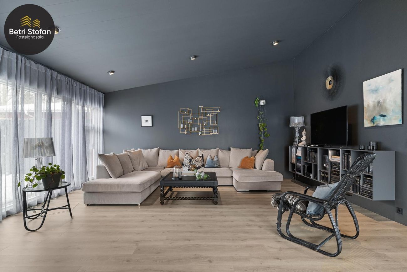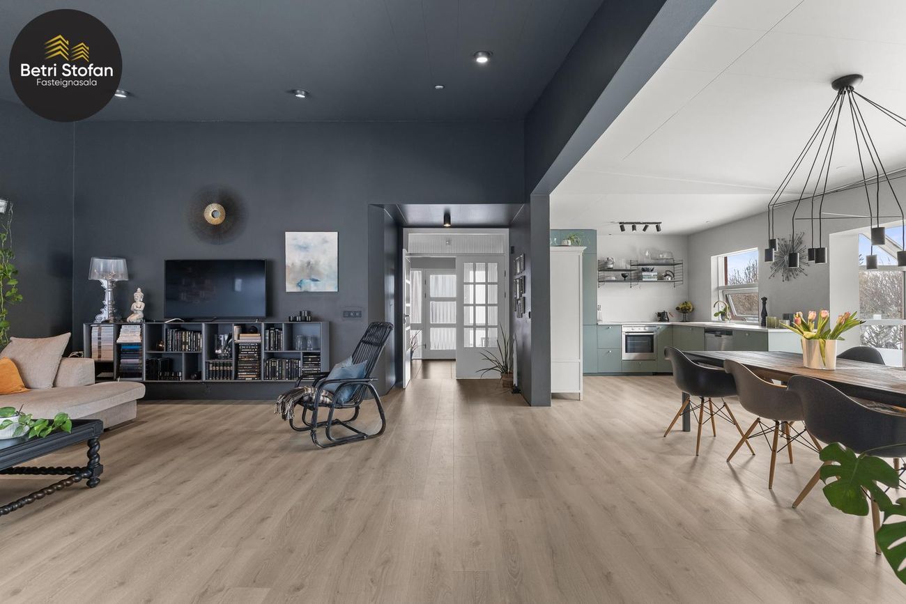 Stofa: Afar falleg opin og björt stofa með mikilli lofthæð og gólfsíðum gluggum. Gólfhiti í gólfi. Útgengt út í garð á 60fm viðarverönd. Stofa opin við borðstofu.