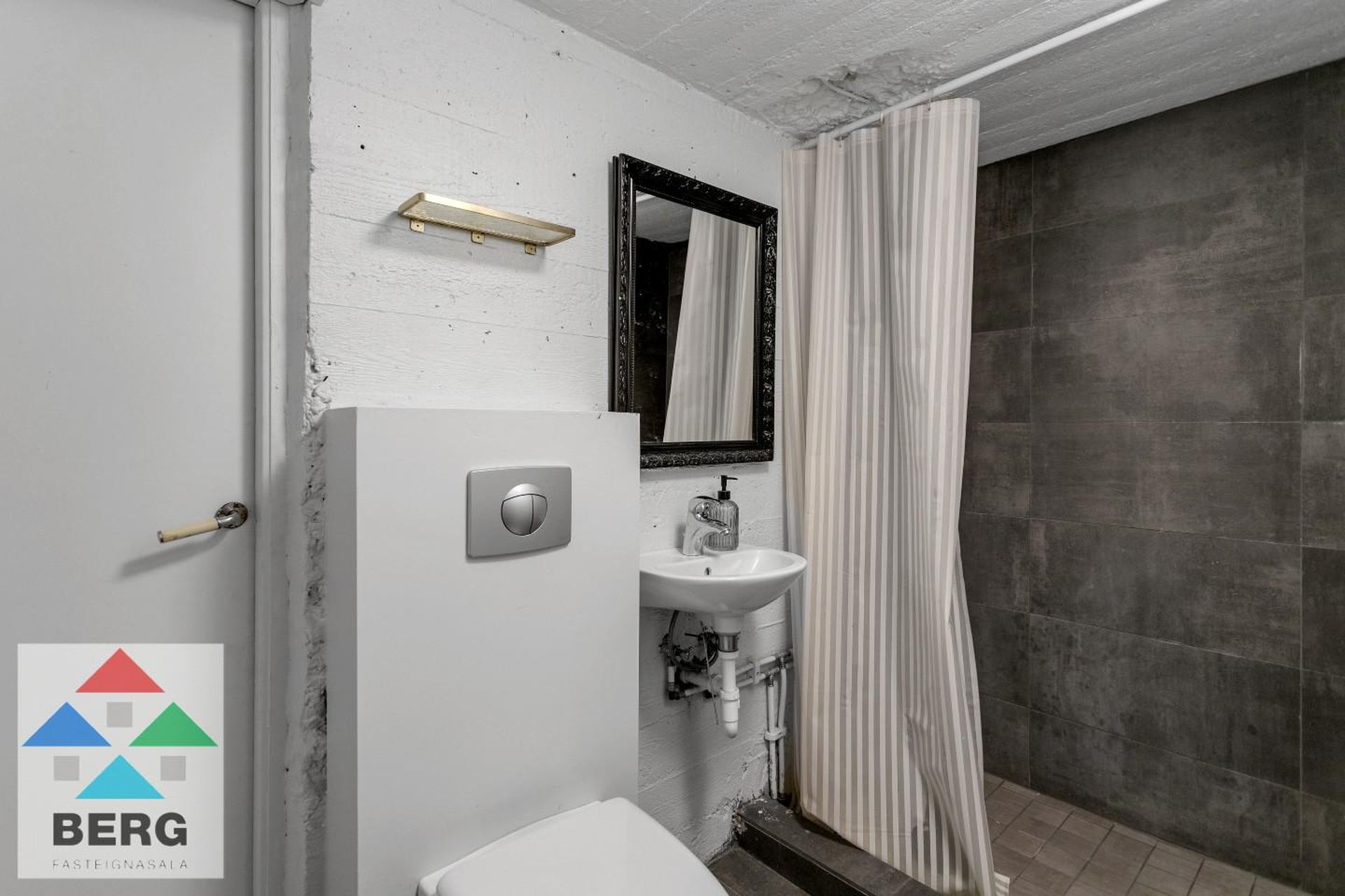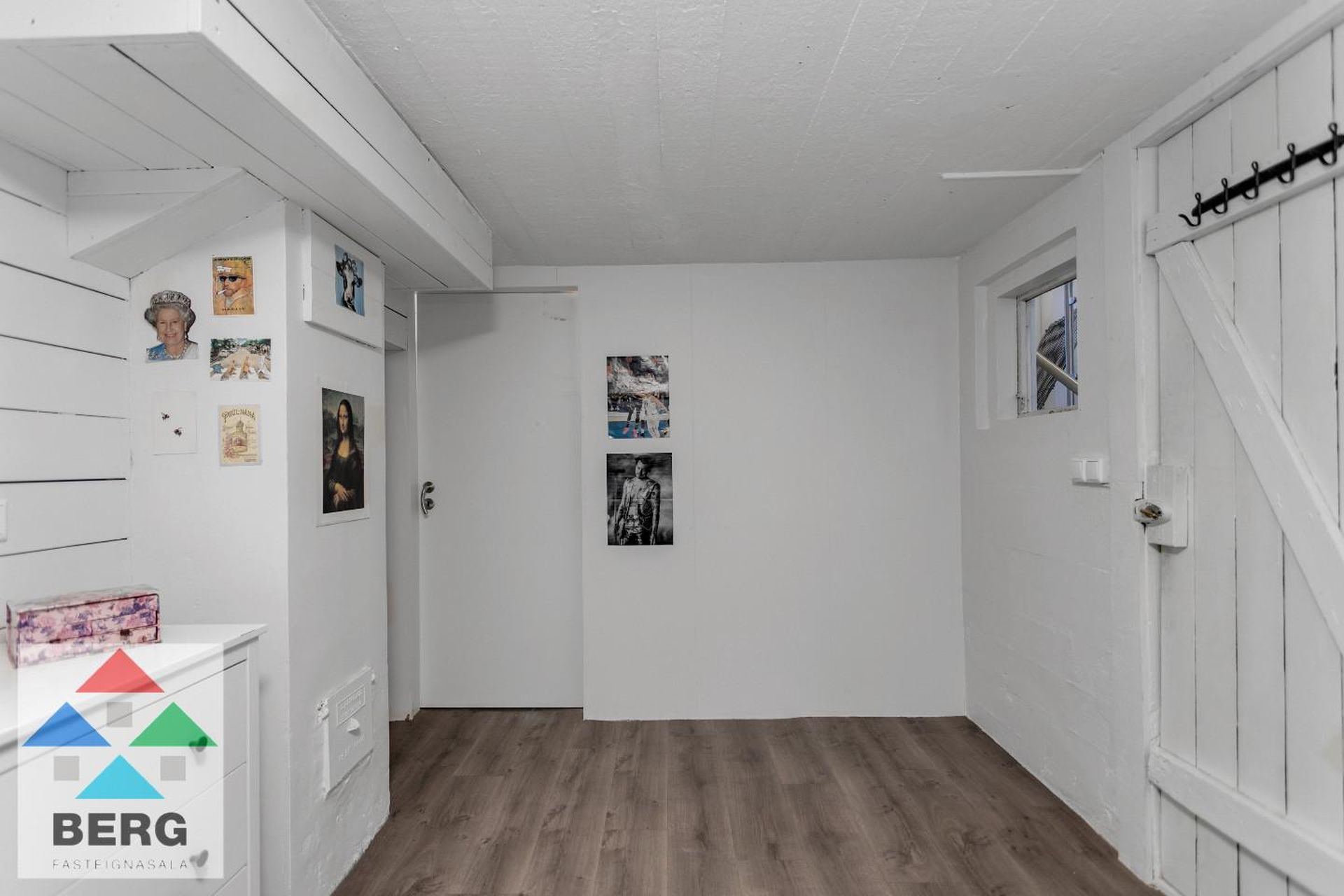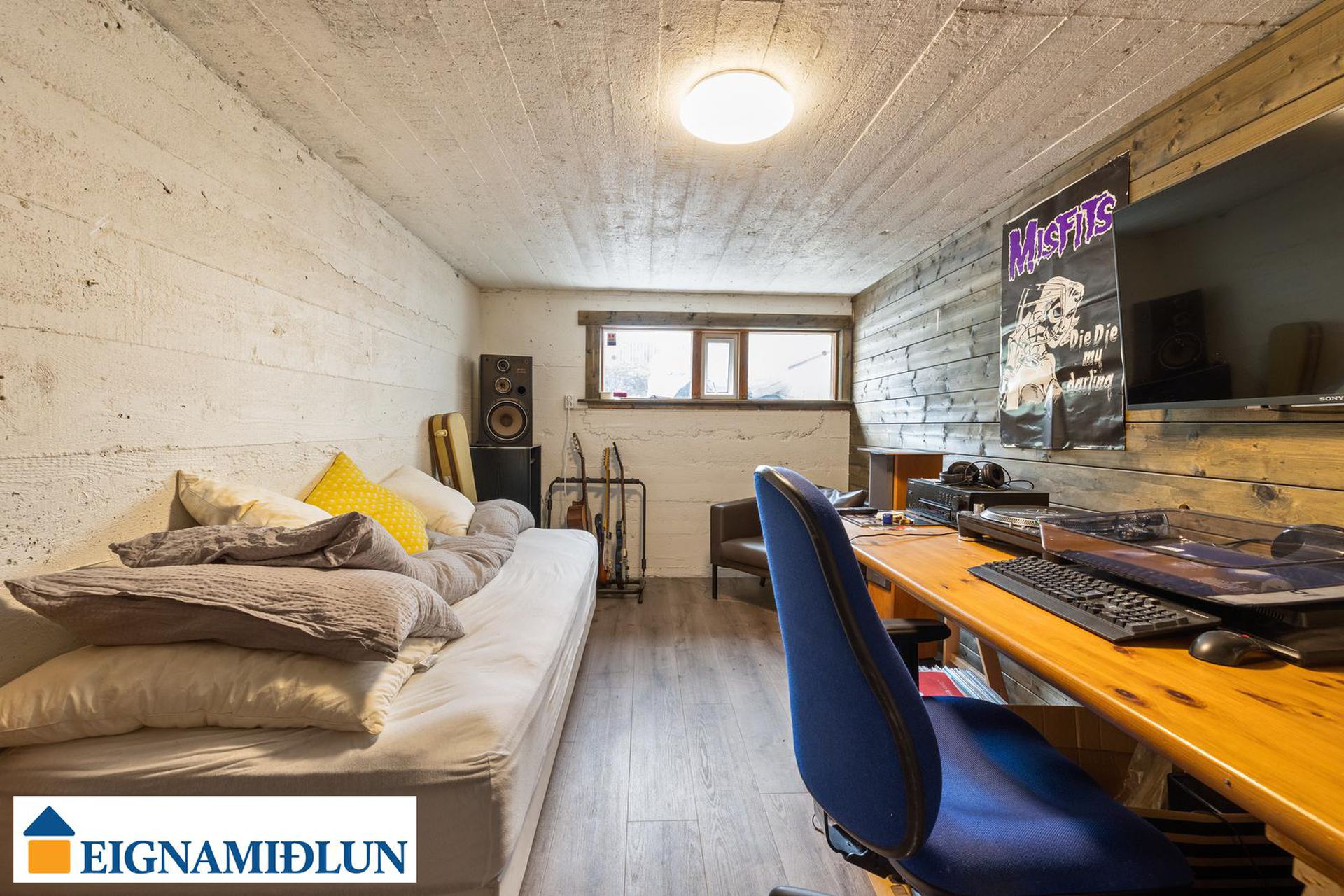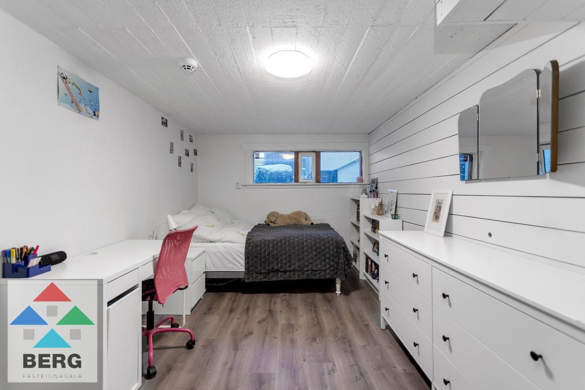 Neðri hæð er með svefnherbergi og sérbaðherbergi með sturtu og salerni. Herbergið er aðskilið frá aðalhæðinni og hentar vel í útleigu eða sem unglingaherbergi.
