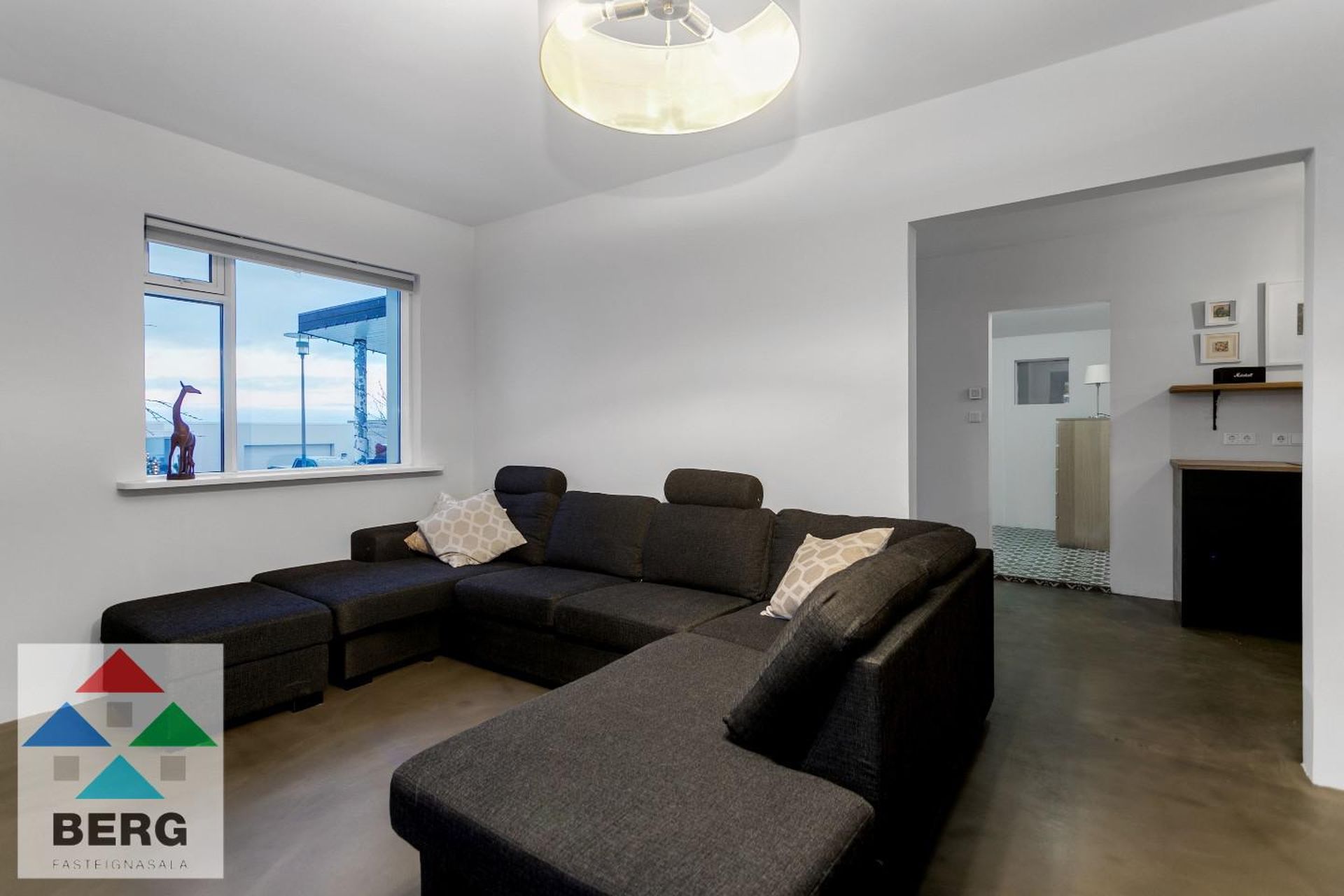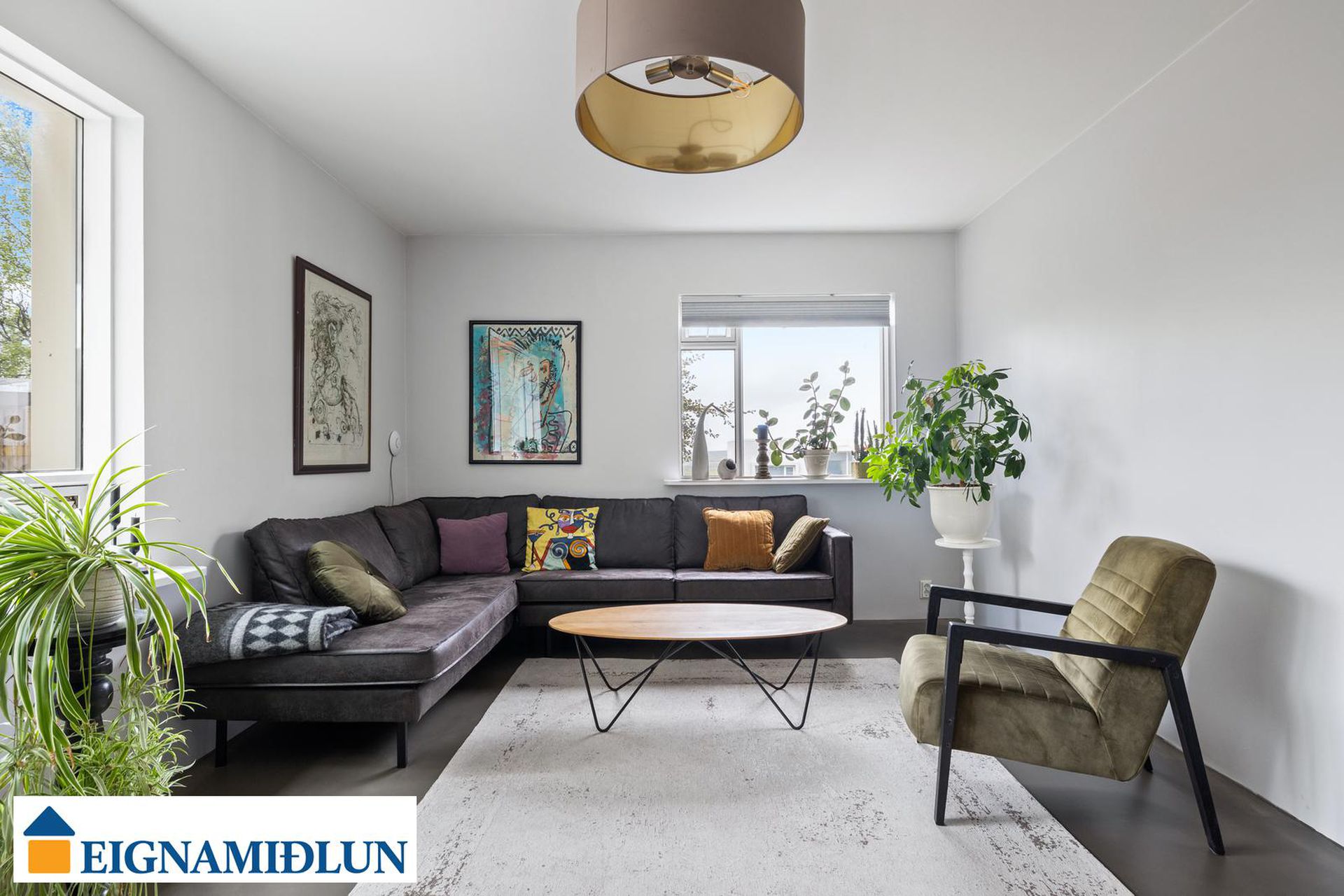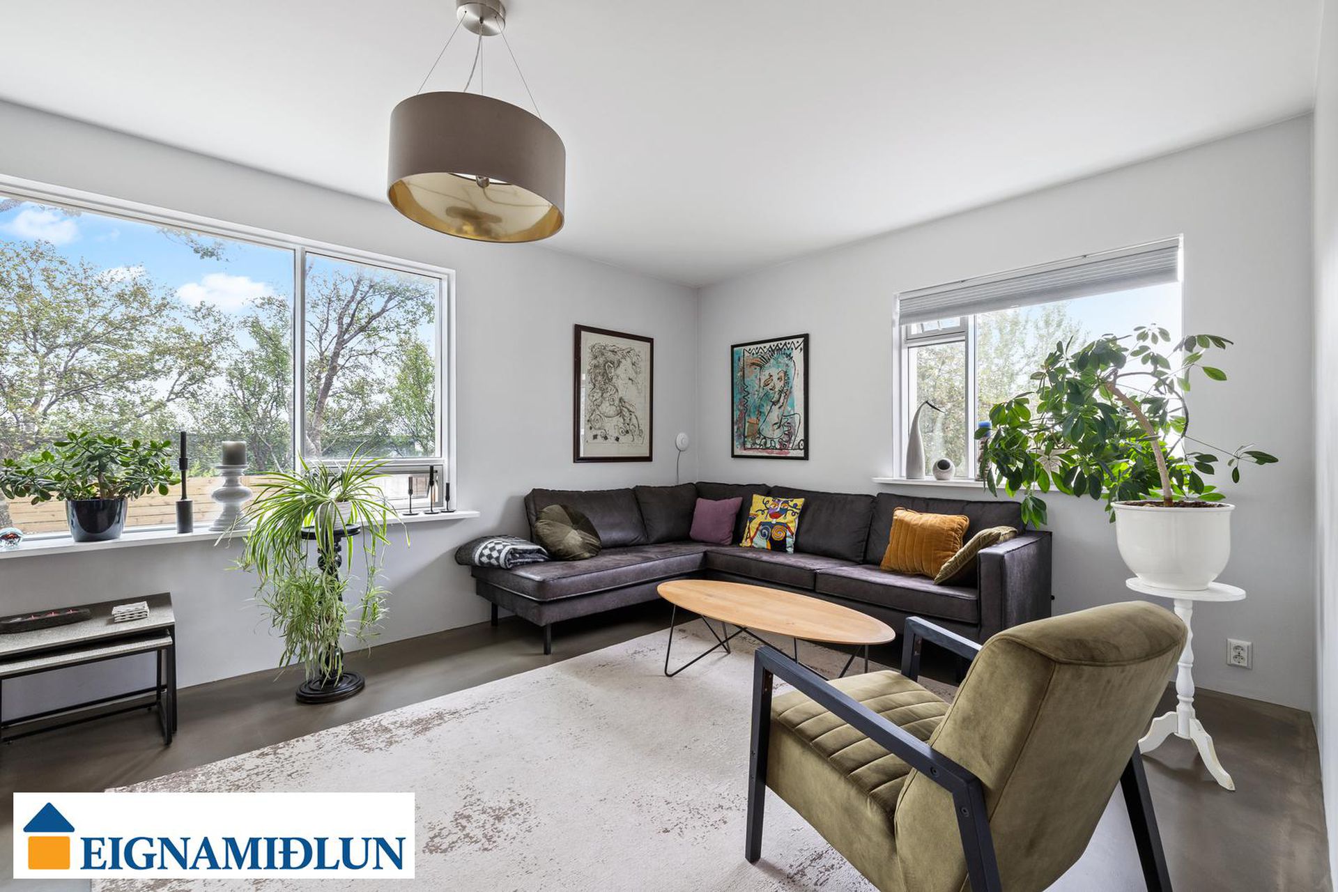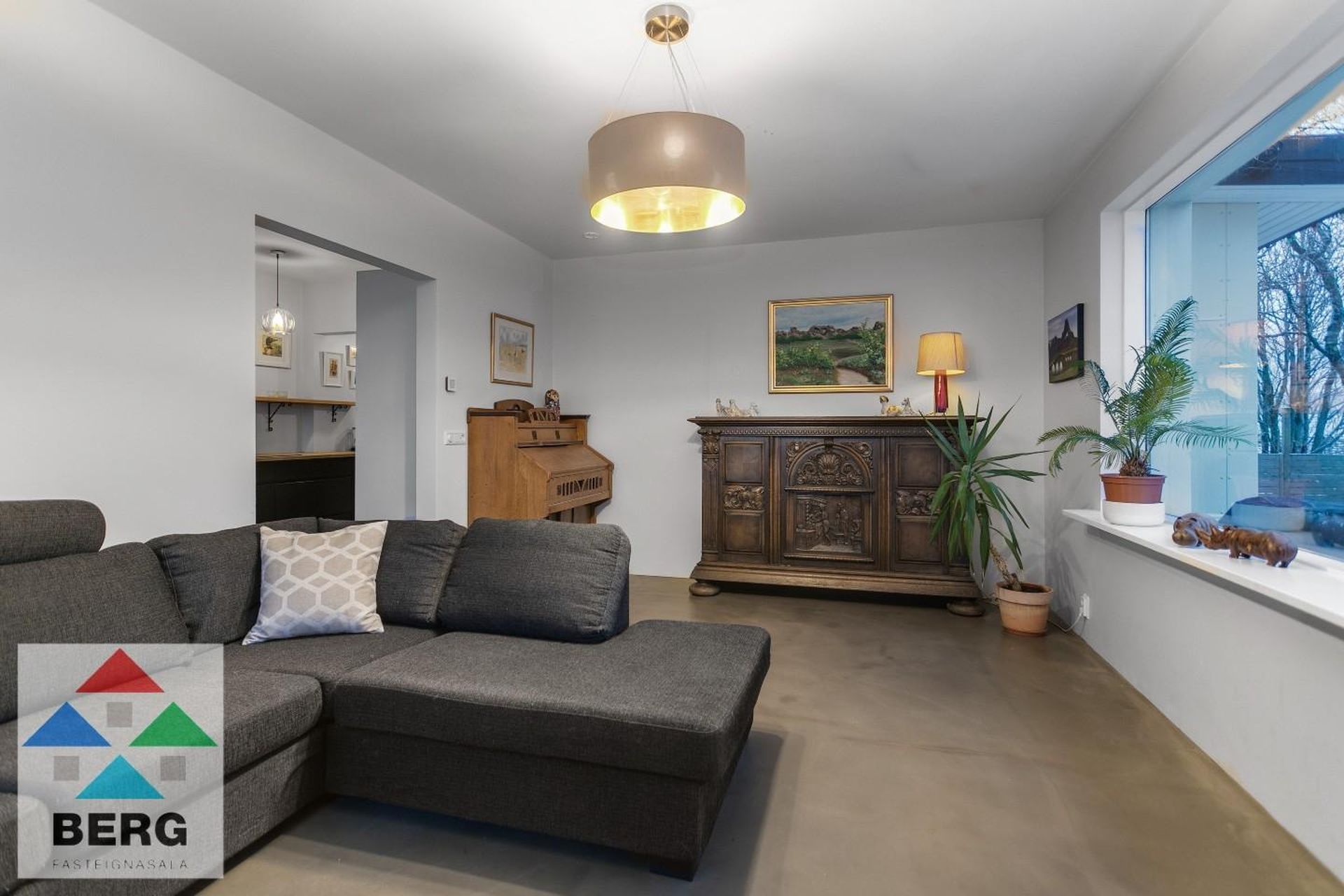 Stofan er rúmgóð og björt með glugga á tvo vegu.