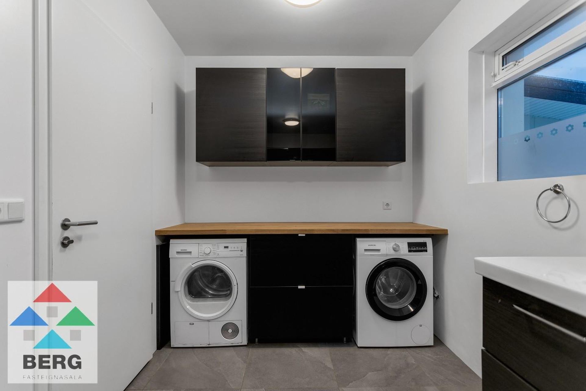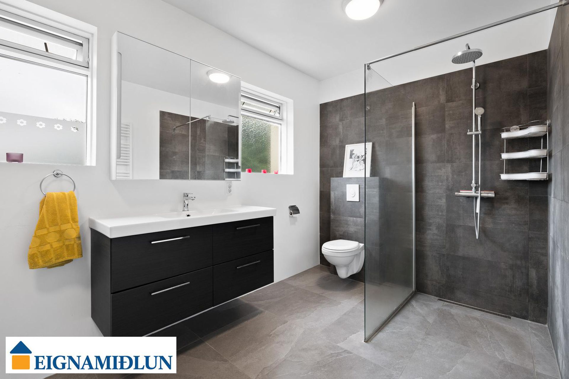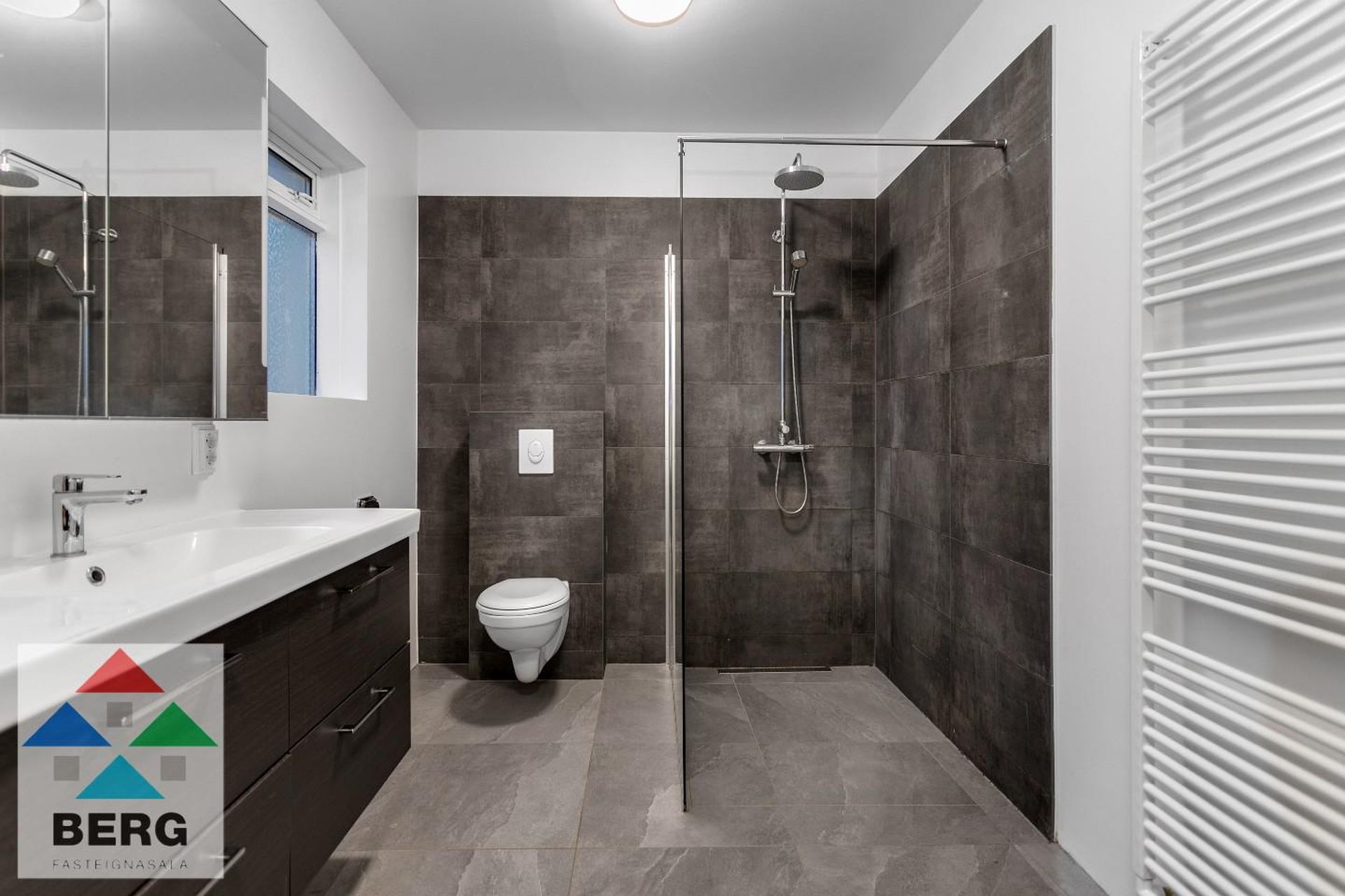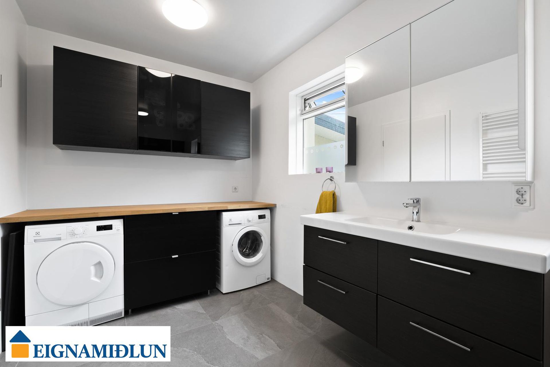 Baðherbergið er með flísum á gólfi og hluta veggja. Inn á baði er sturta, vegghengt salerni og innrétting með skolvask. Góð þvottaaðstaða með innréttingu og efri skápum. Tveir opnanlegir gluggar.